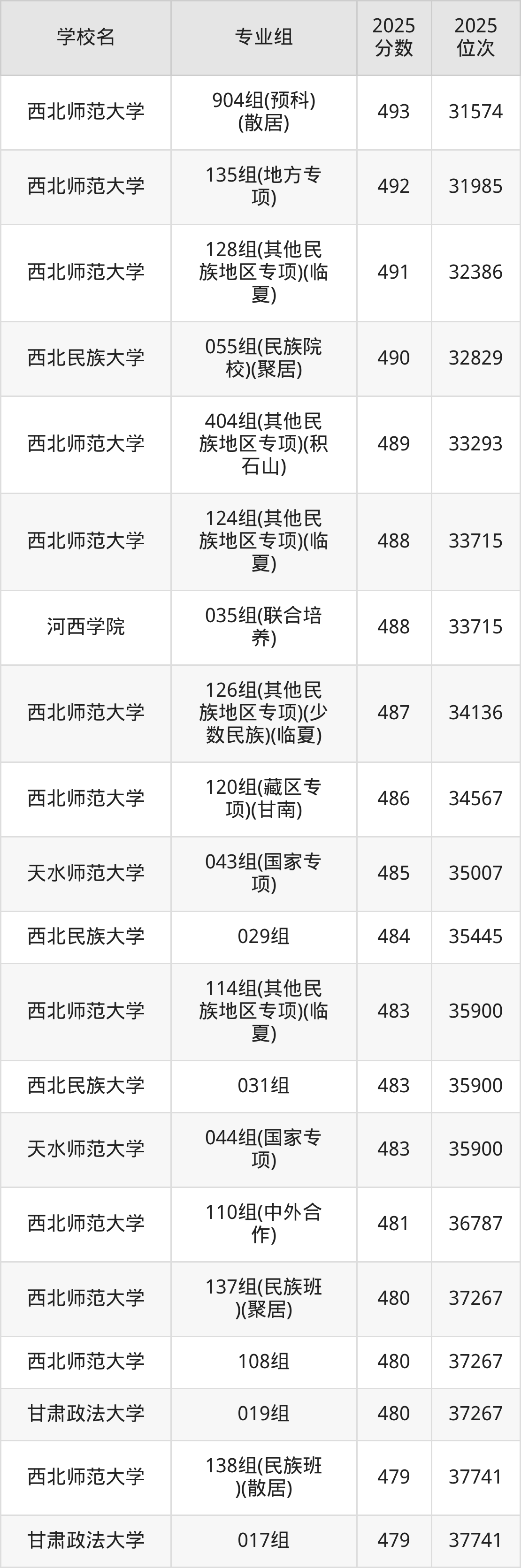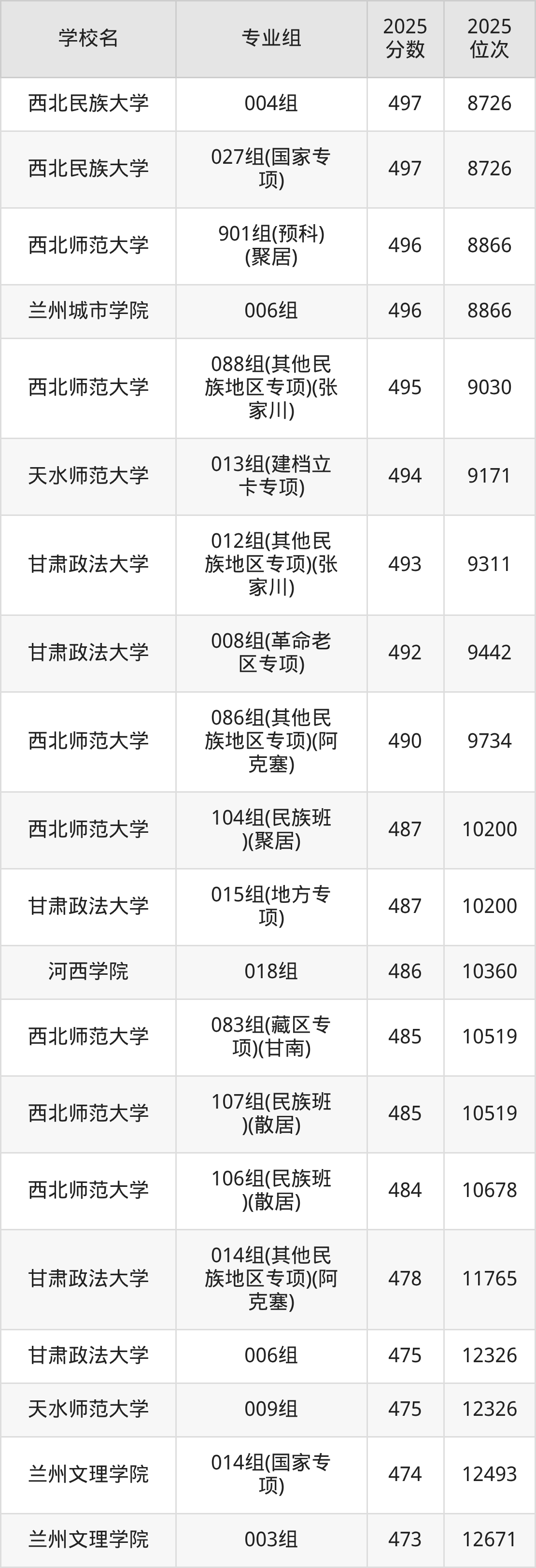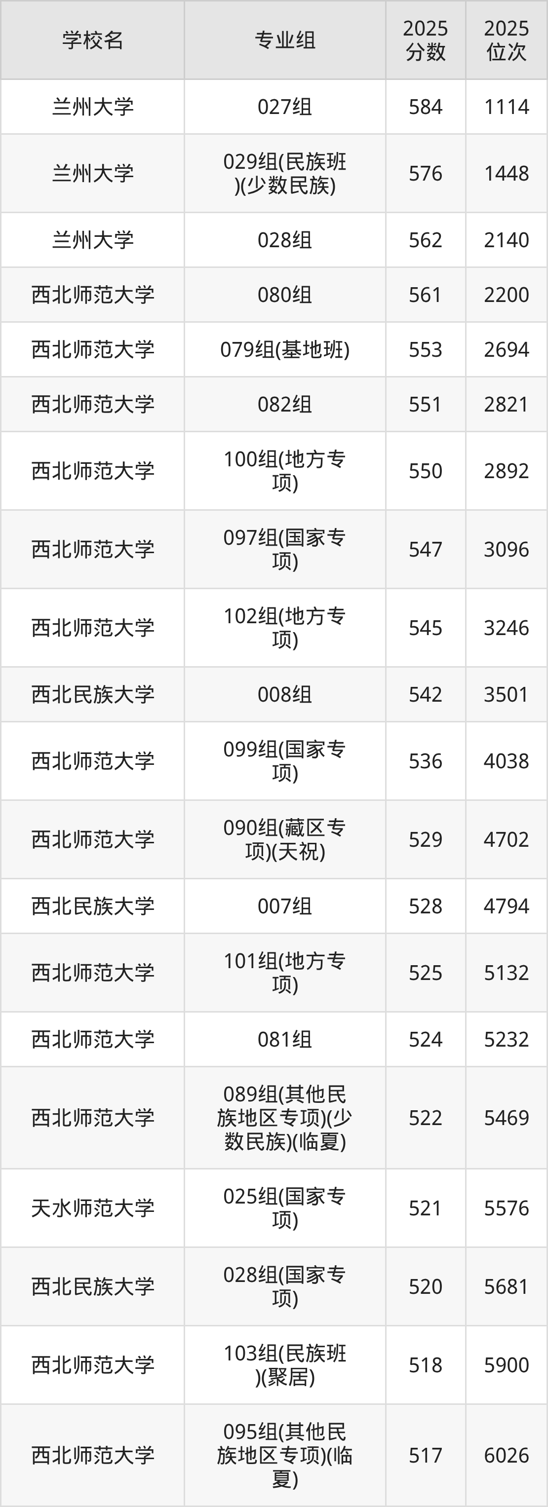 甘肃排名靠前的文科院校有兰州大学、西北师范大学、西北民族大学、兰州文理学院、甘肃政法大学等。2025年甘肃文科院校最低分:物理类301分、历史类301分,各校分数线具体如下。