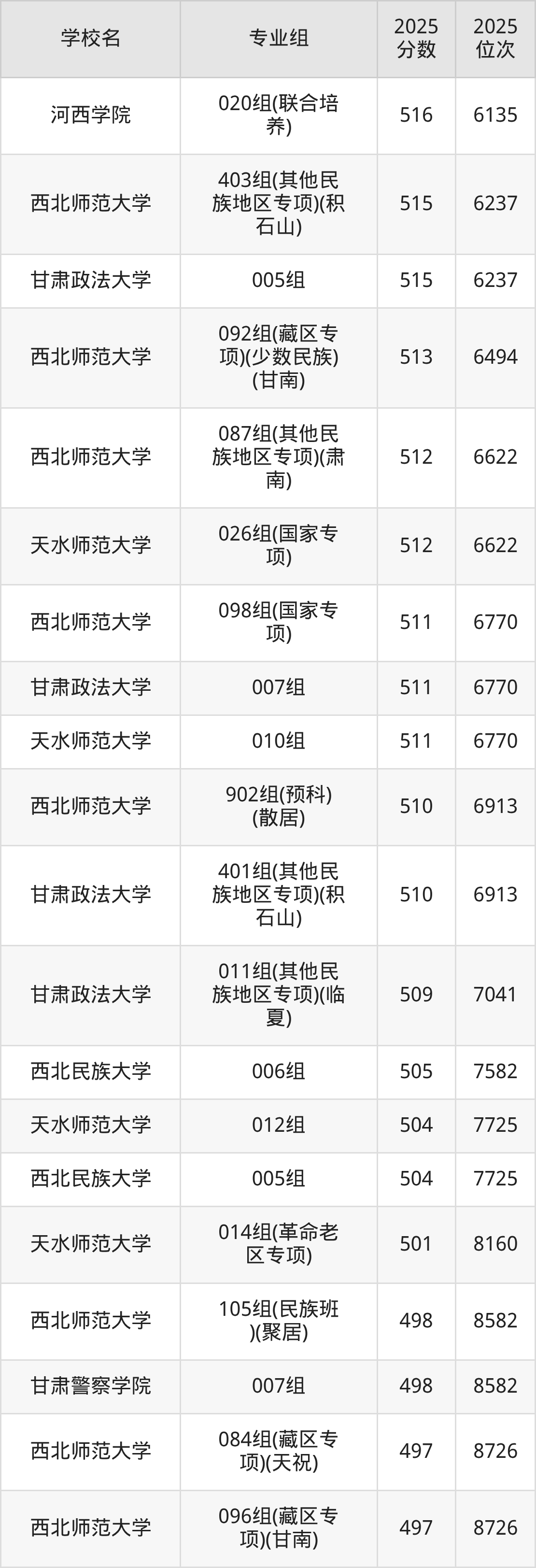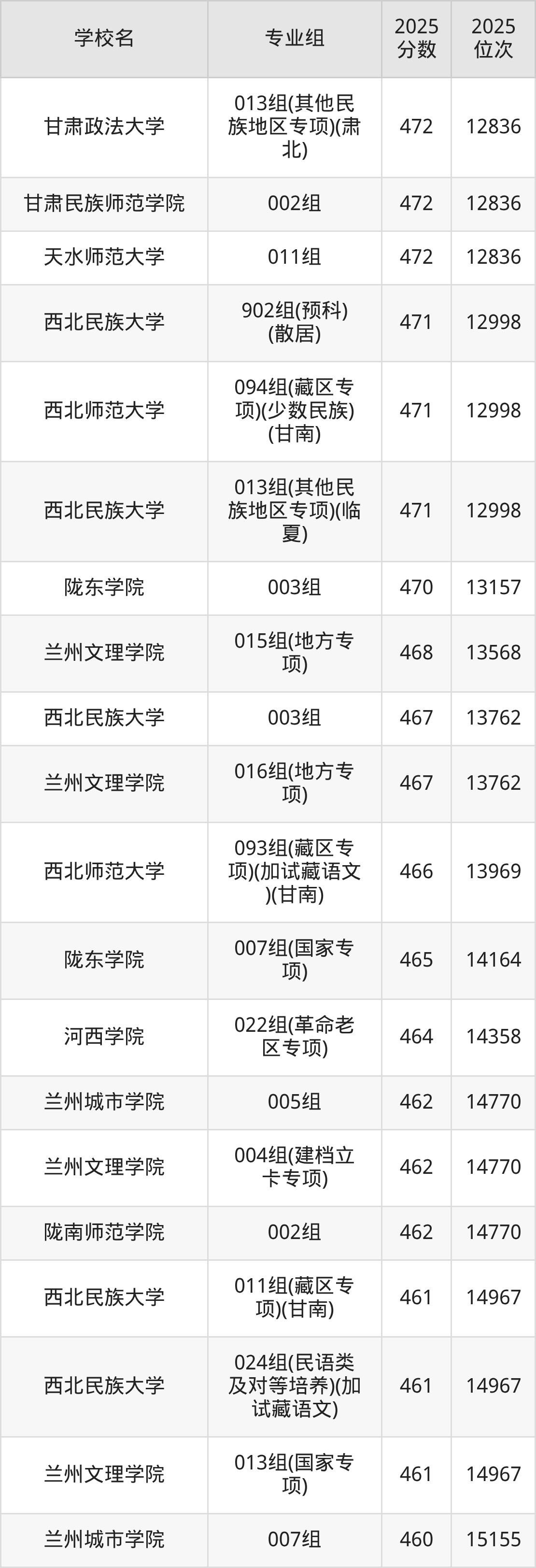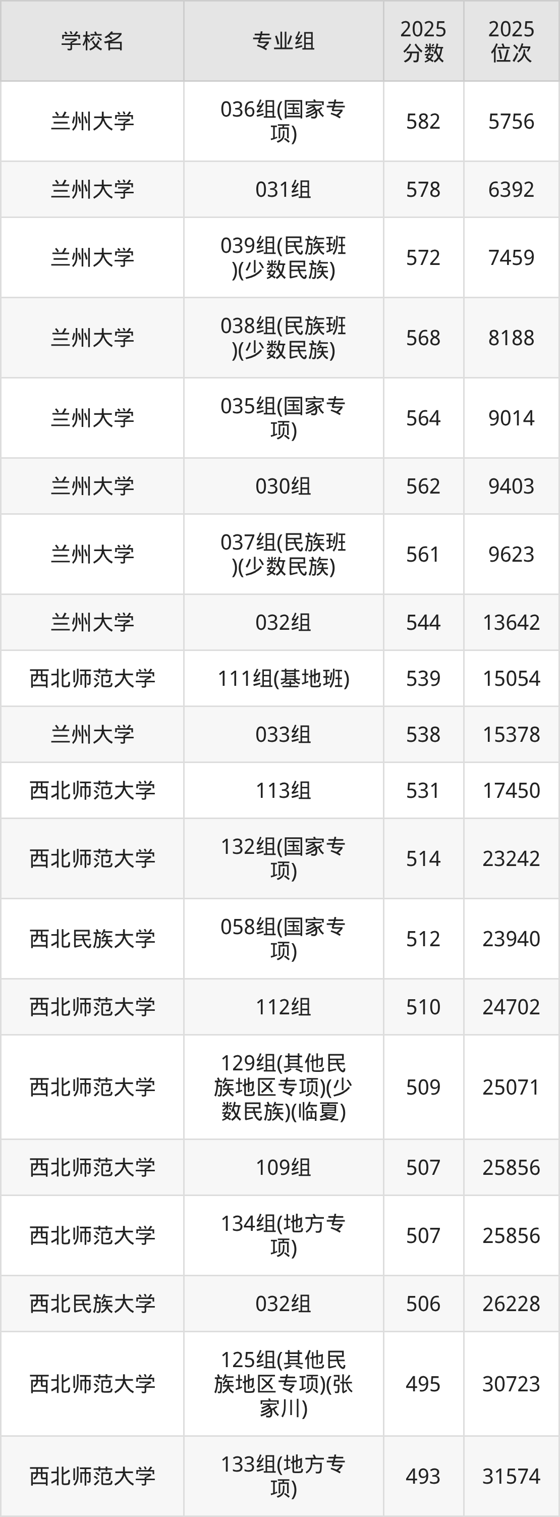 甘肃排名靠前的文科院校有兰州大学、西北师范大学、西北民族大学、兰州文理学院、甘肃政法大学等。2025年甘肃文科院校最低分:物理类301分、历史类301分,各校分数线具体如下。