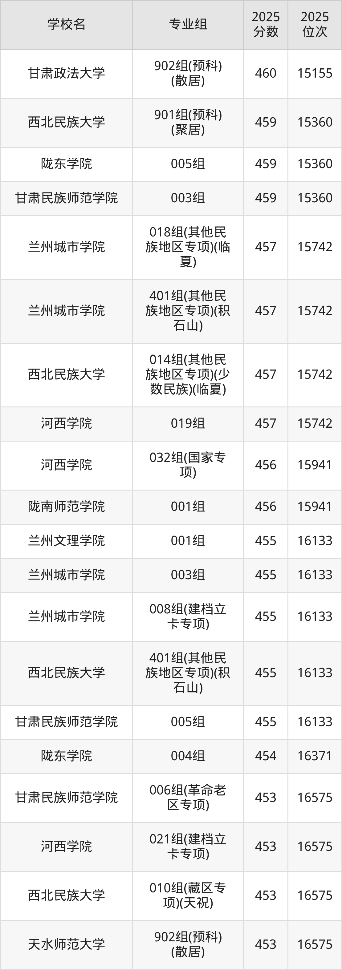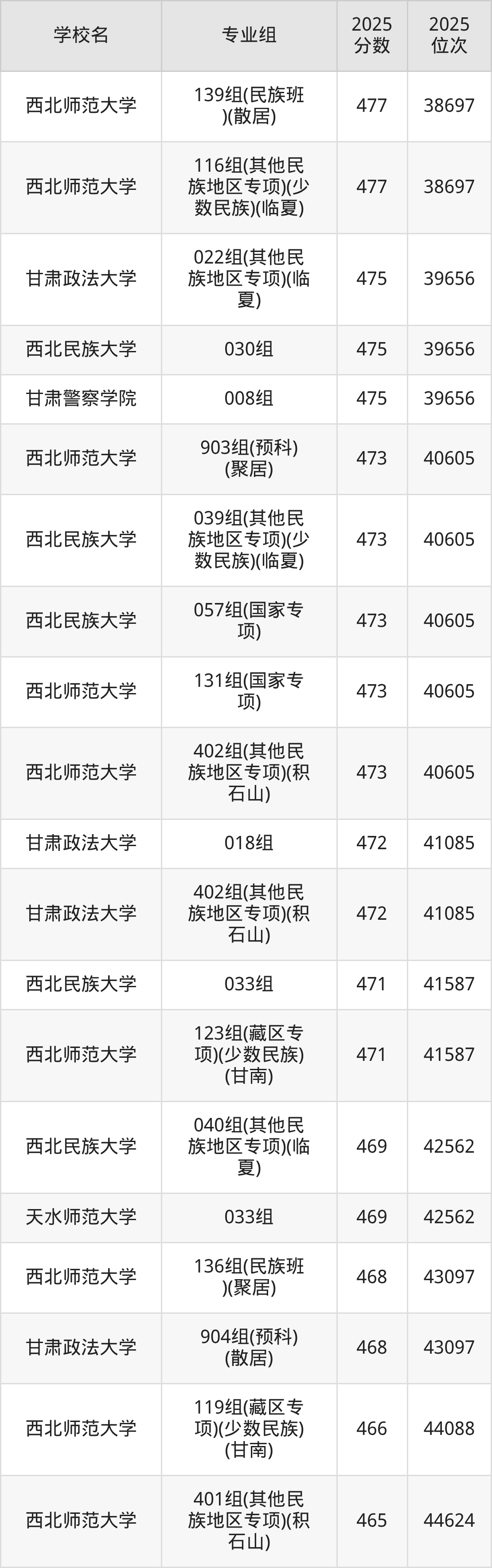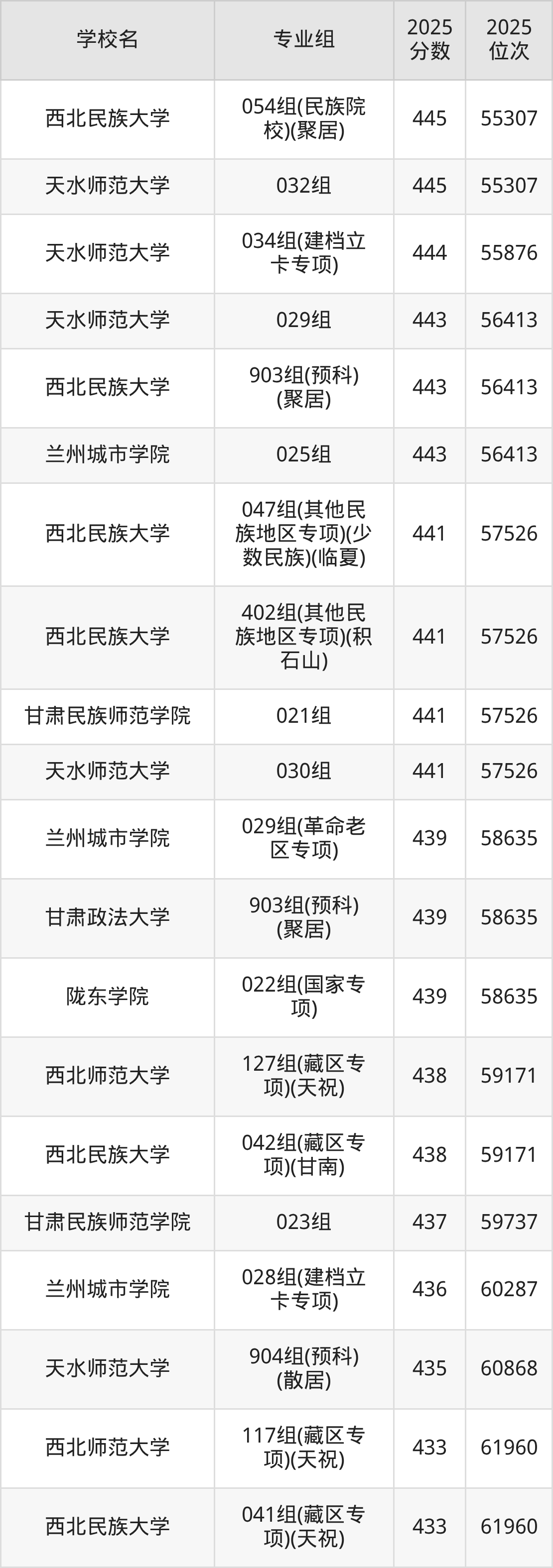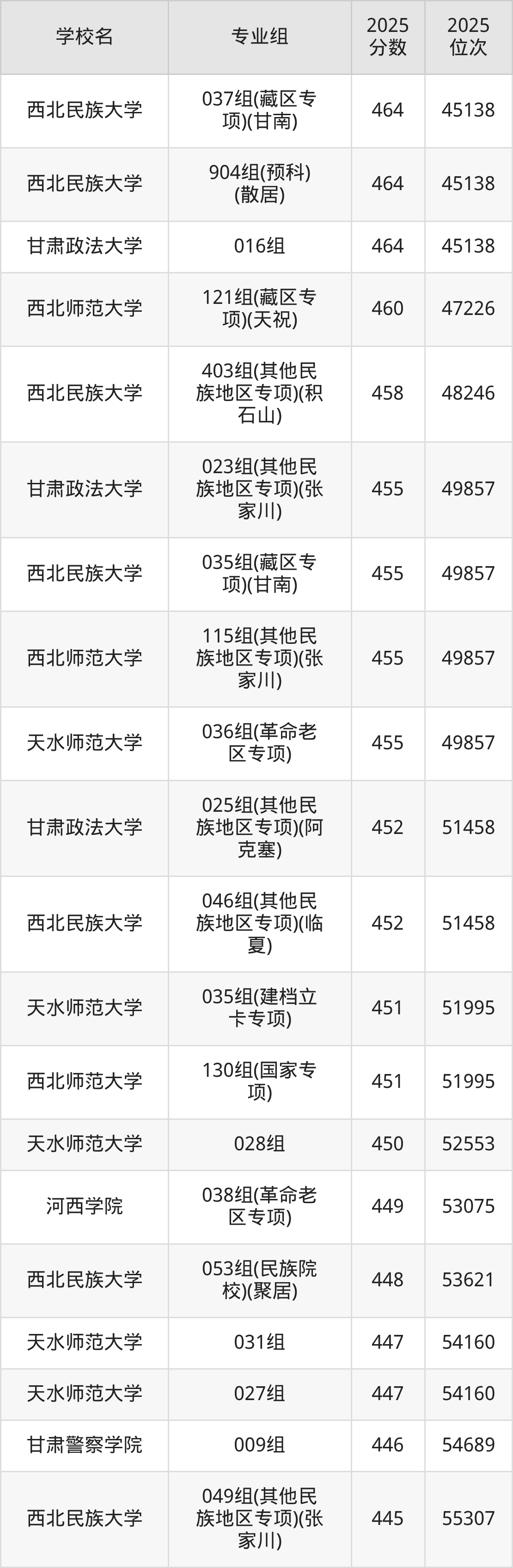 物理类最好考、收分最低的是:甘肃民族师范学院,2025年038组(民语类及对等培养)(加试藏语文)最低分301分,最低排名115561名;历史类最好考、收分最低的是:西北民族大学,2025年026组(民语类及对等培养)(加试蒙语文)最低分301分,最低排名49871名。