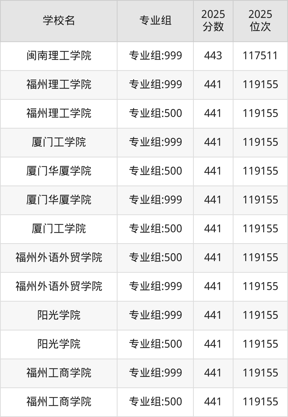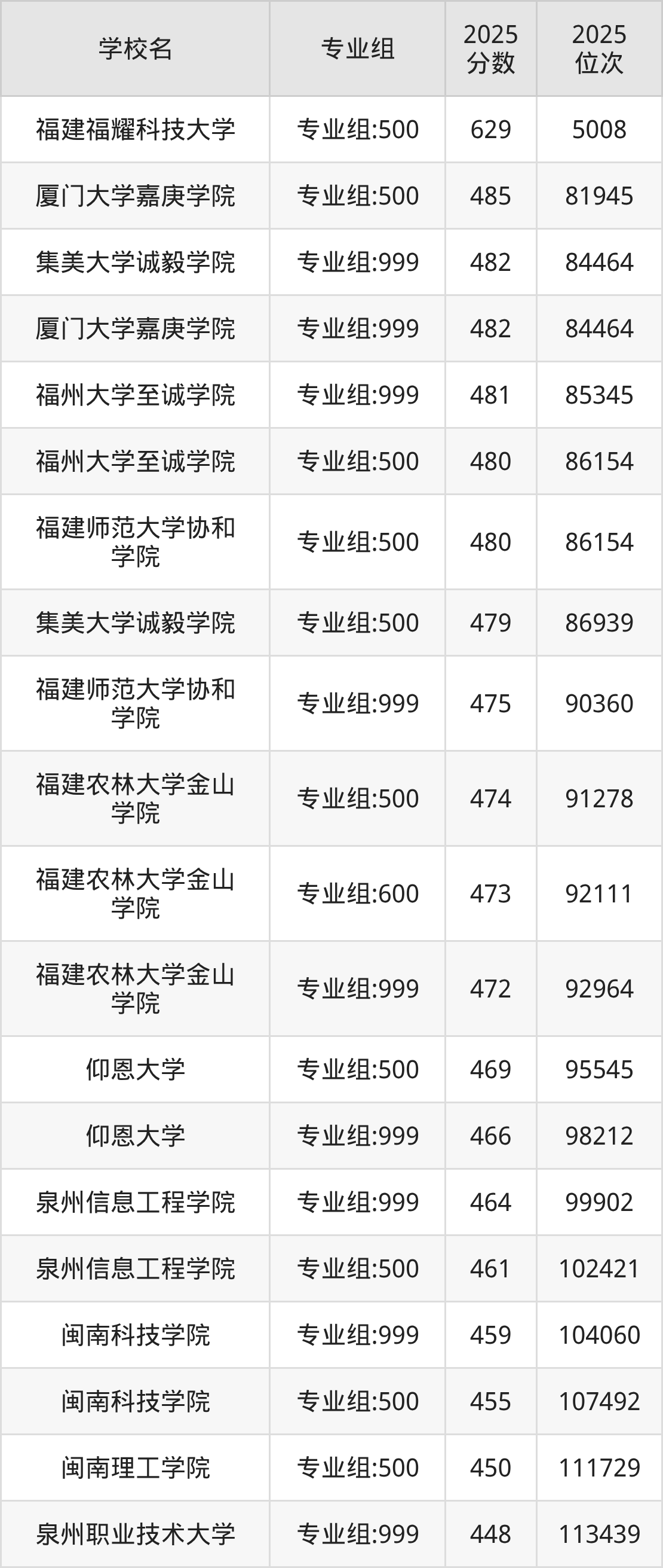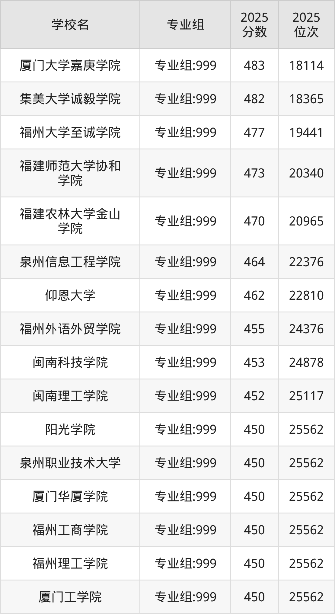 福建省所有民办本科院校2025年录取分数线一览表: