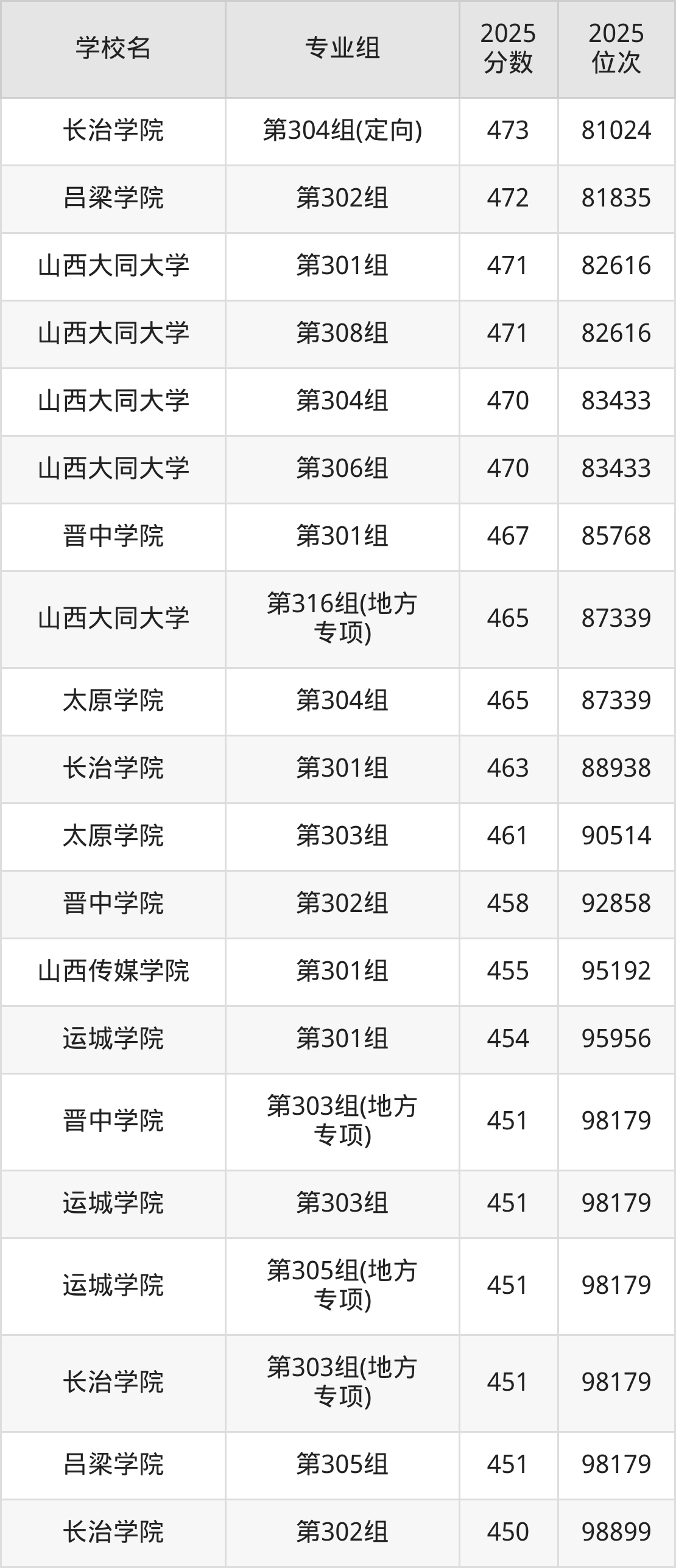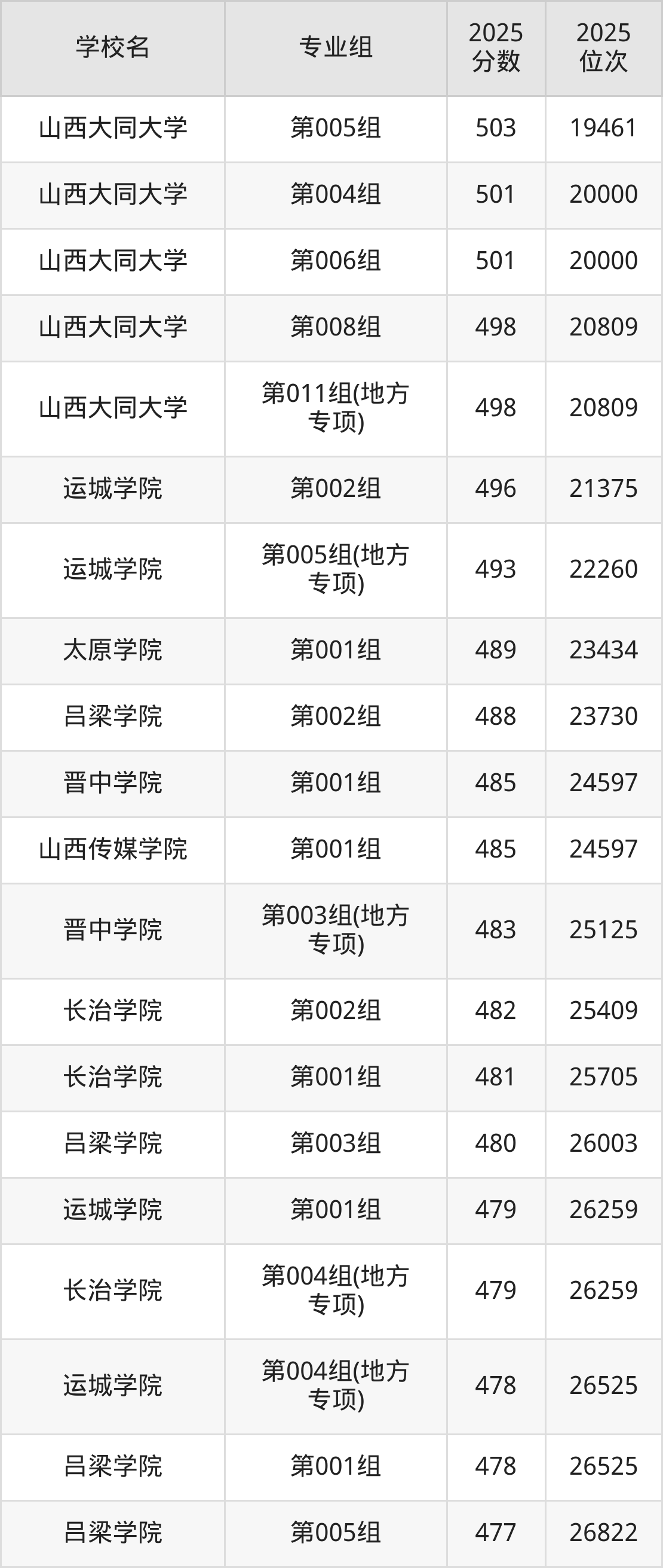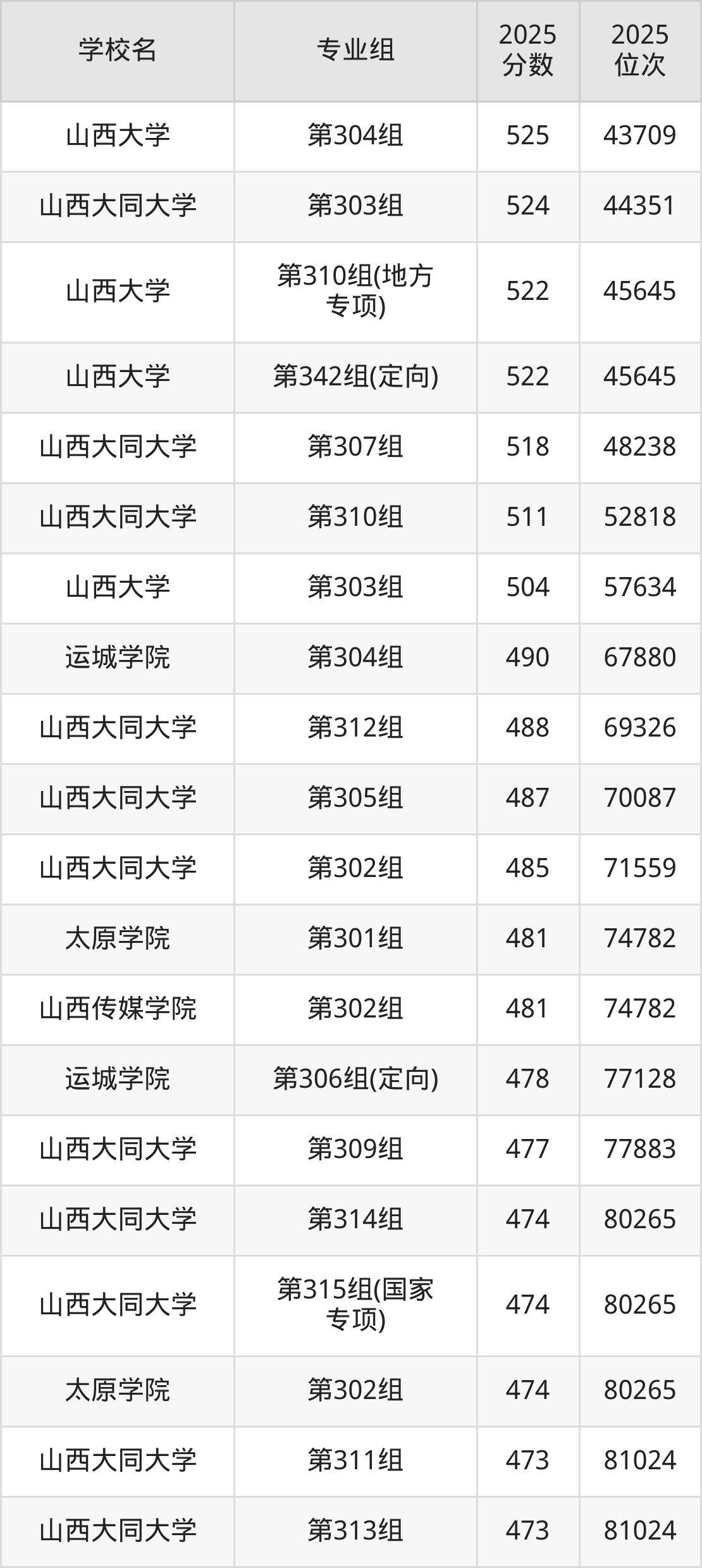 山西省所有综合类院校2025年录取分数线一览表(前100院校专业组):