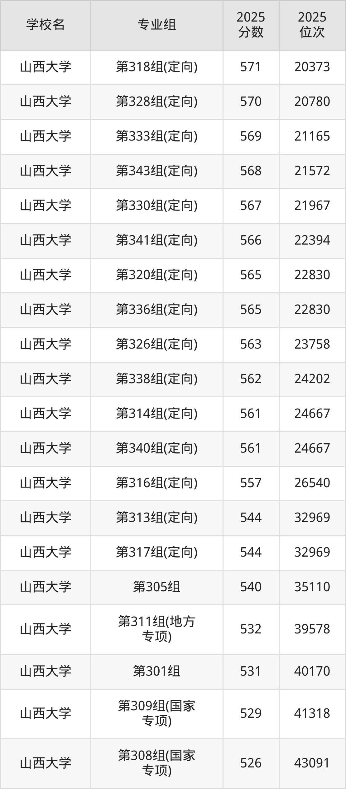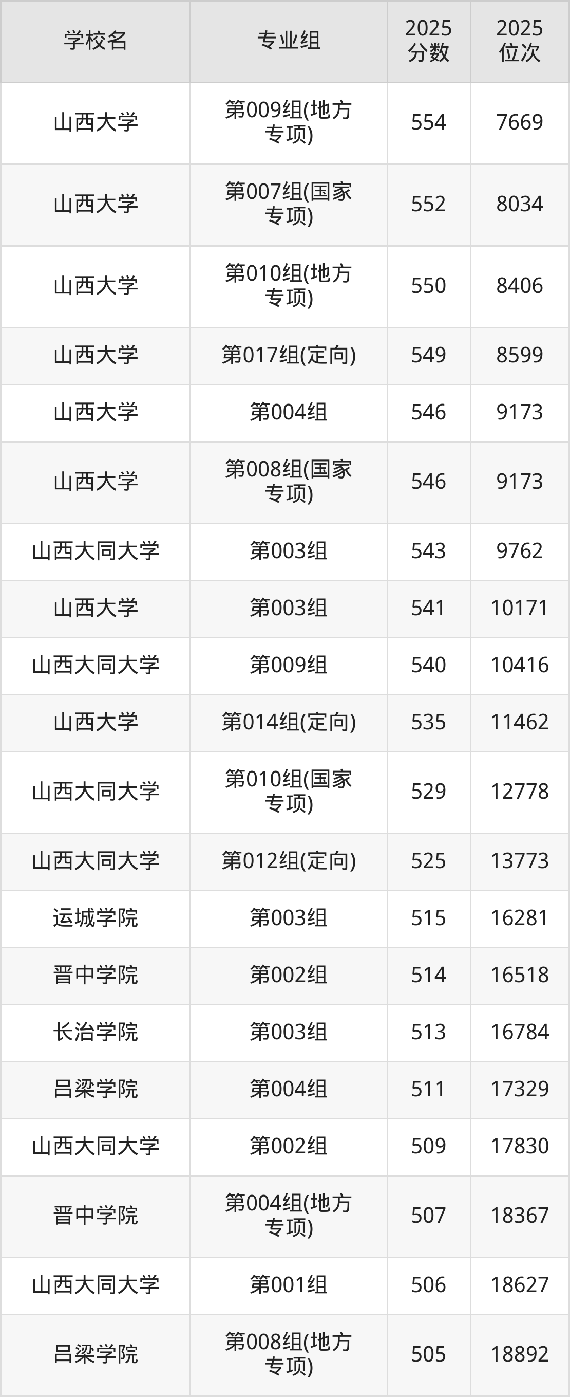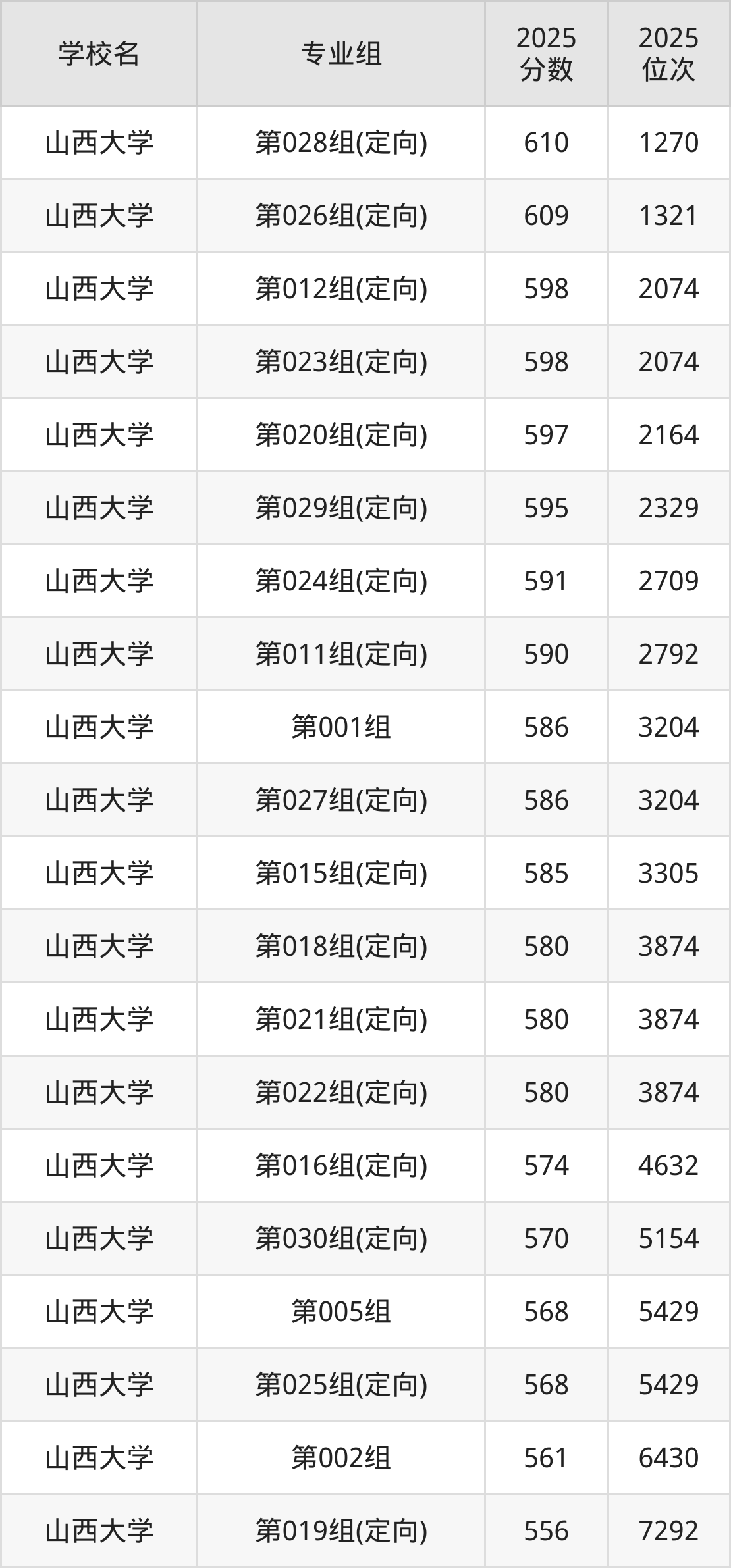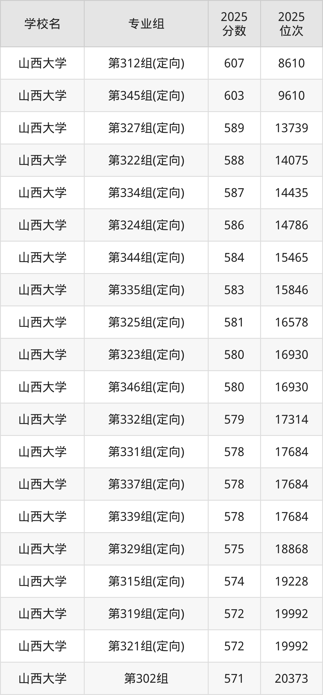 山西省所有综合类院校2025年录取分数线一览表(前100院校专业组):