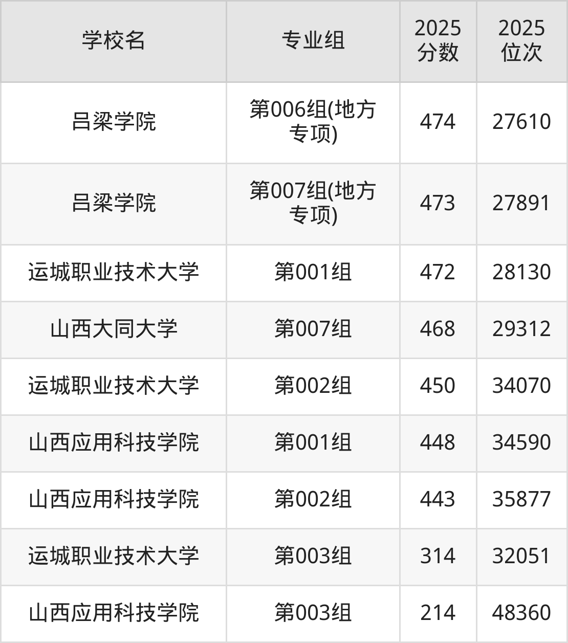 物理类最好考、收分最低的是:山西应用科技学院,2025年第305组最低分241分,最低排名58961名;历史类最好考、收分最低的是:山西应用科技学院,2025年第003组最低分214分,最低排名48360名。