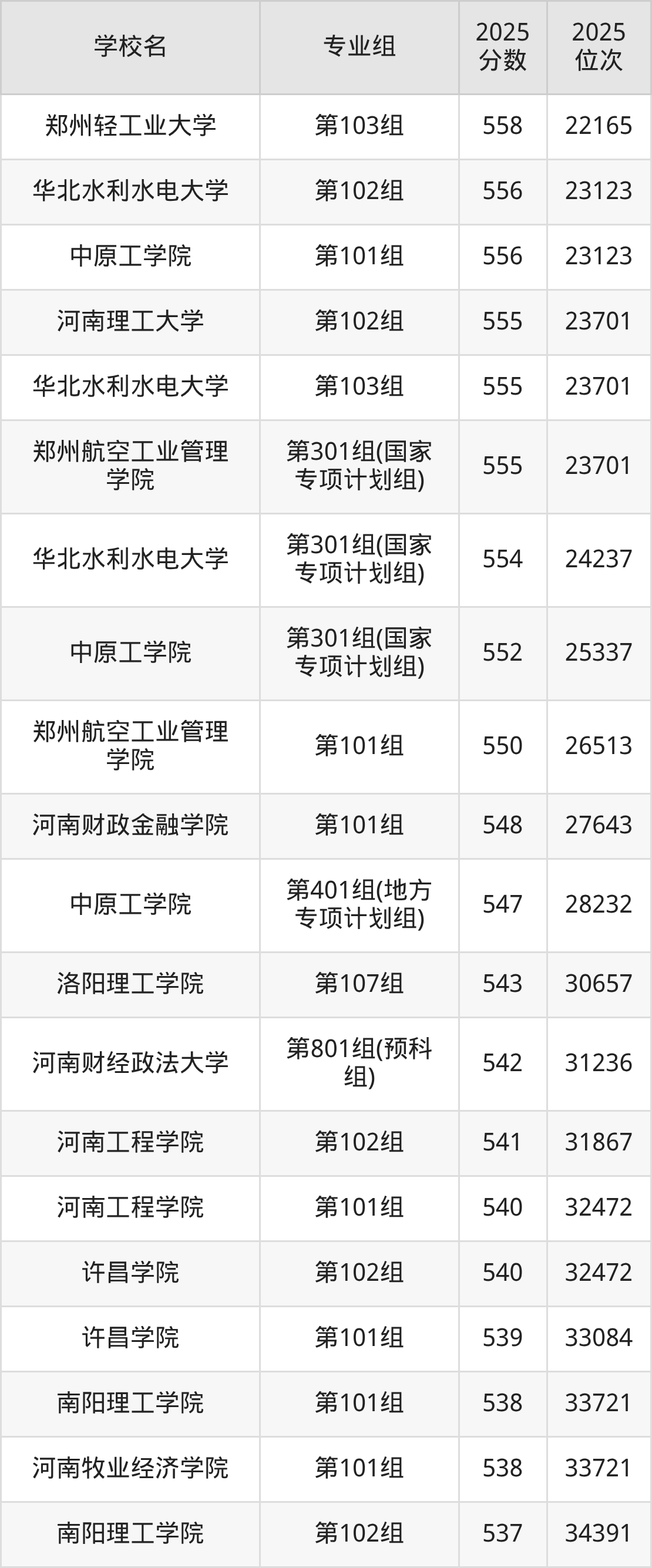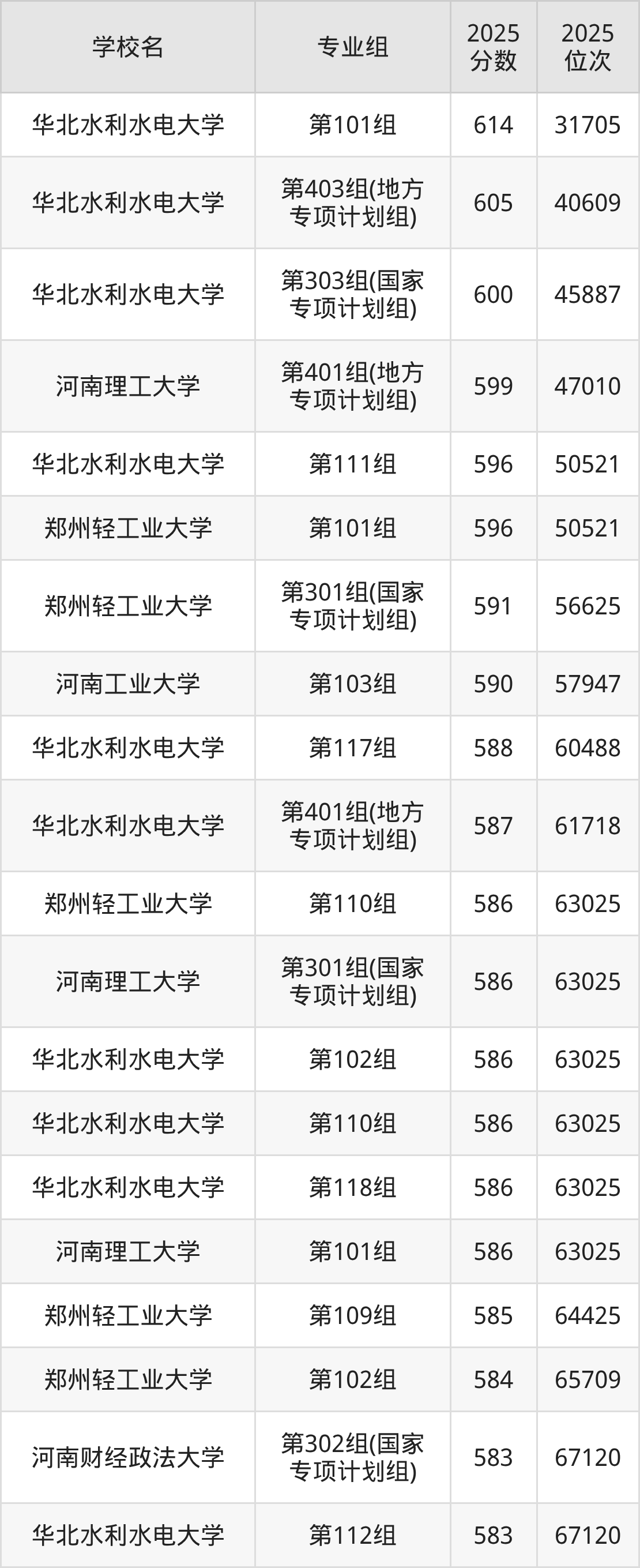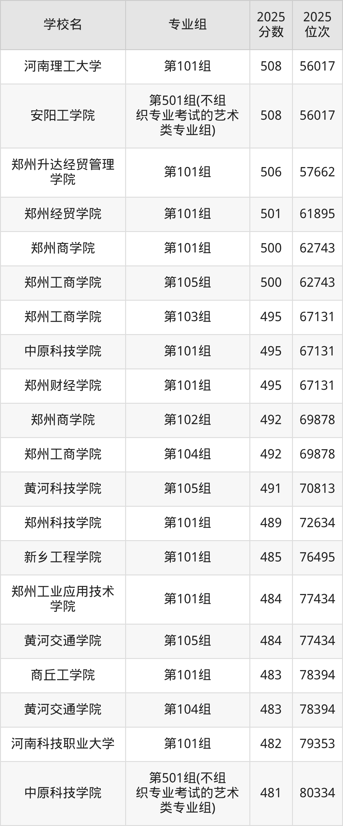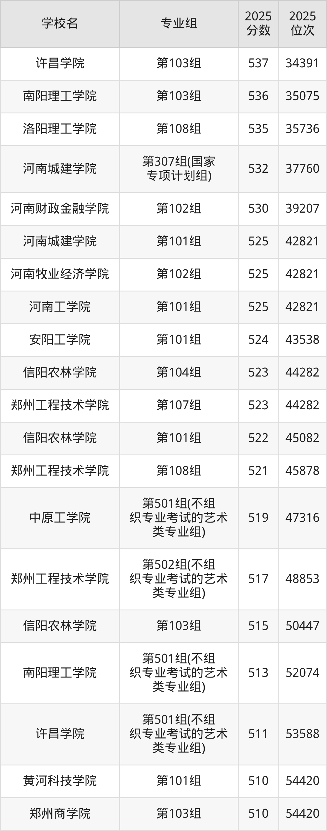 河南省所有理科院校2025年录取分数线一览表: