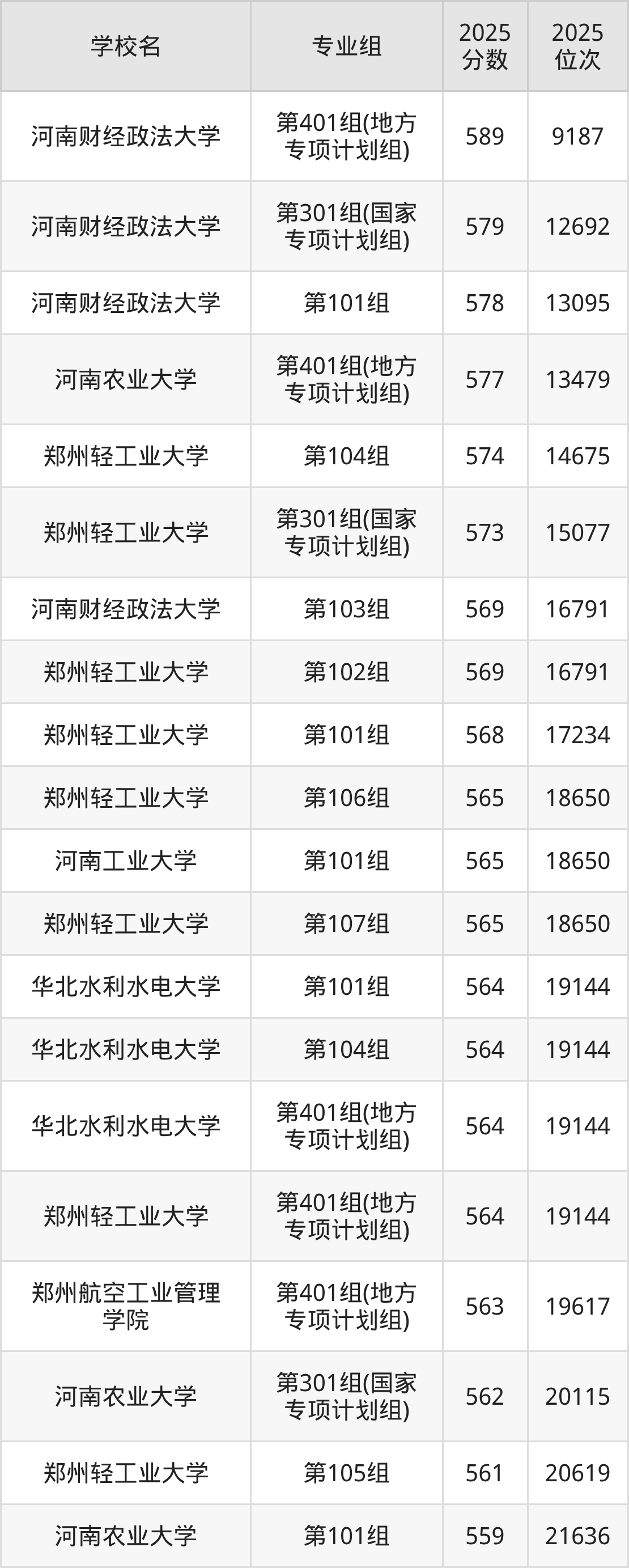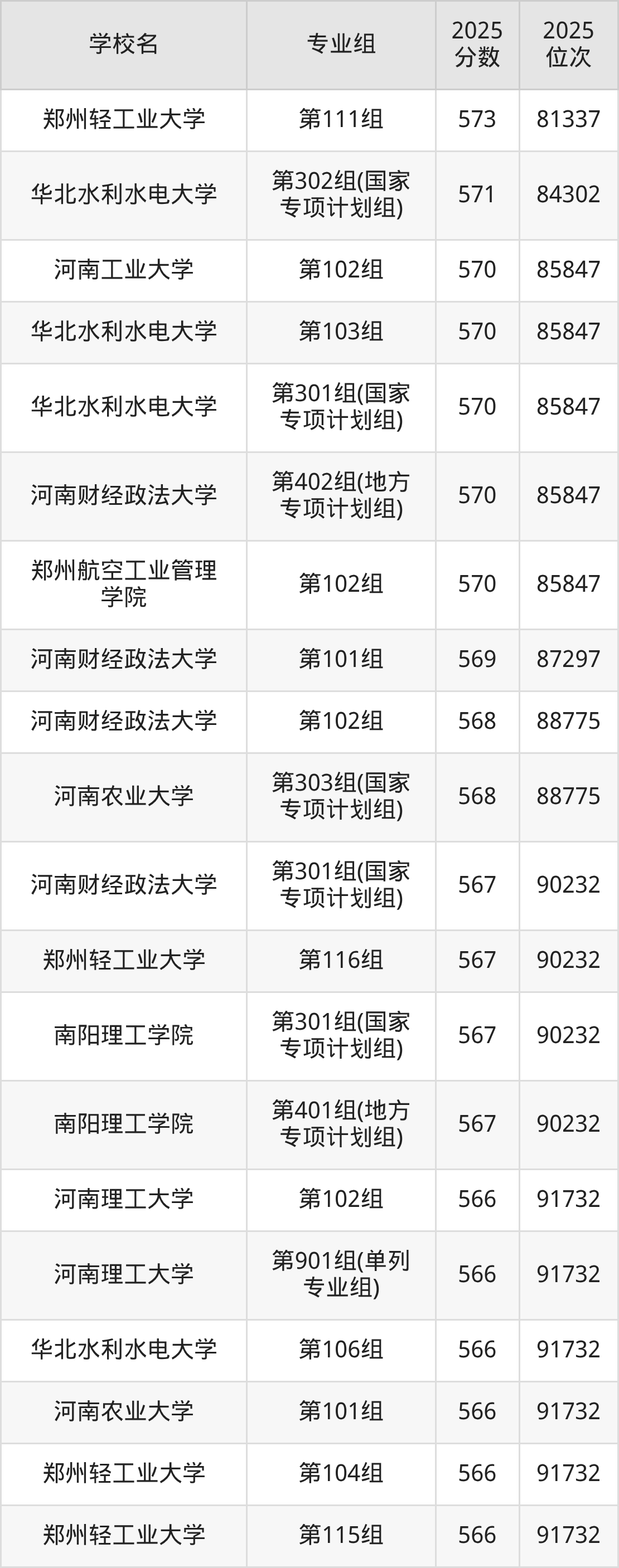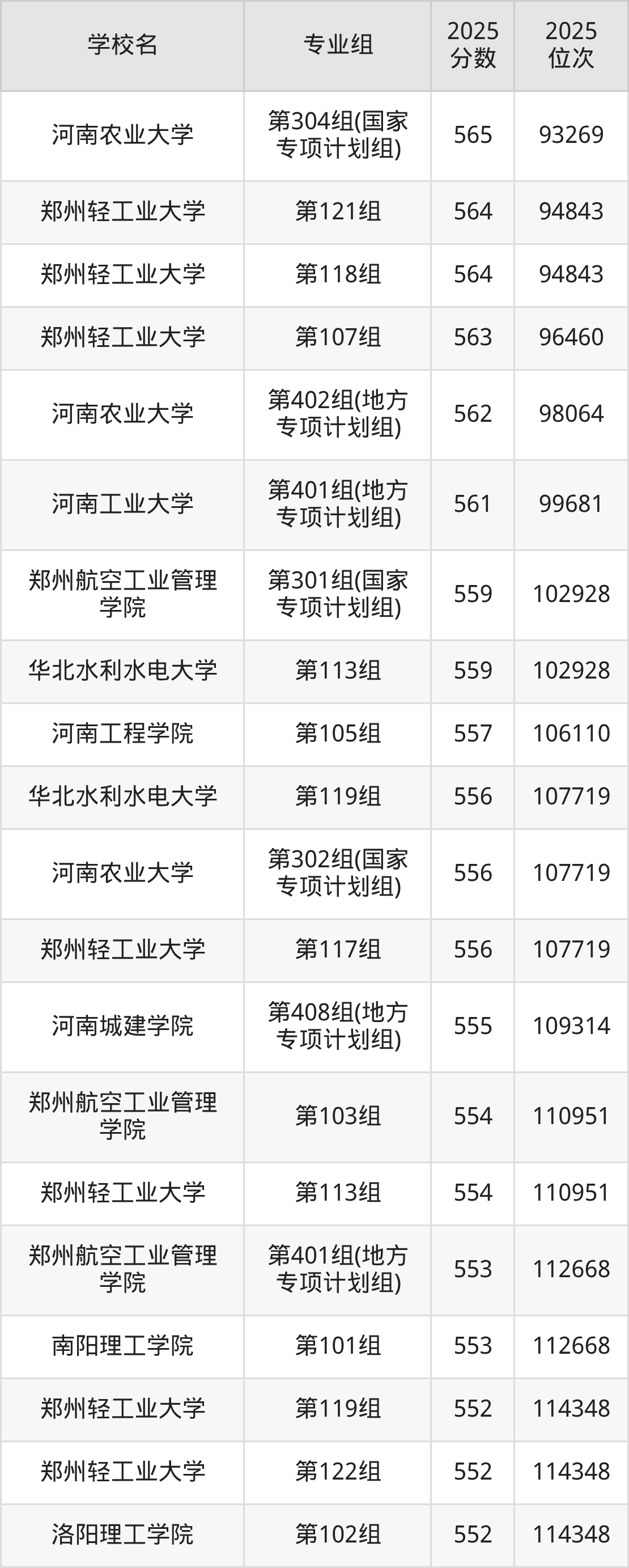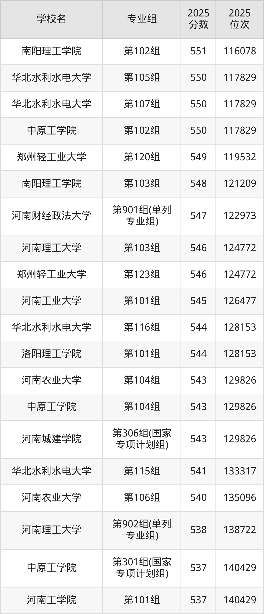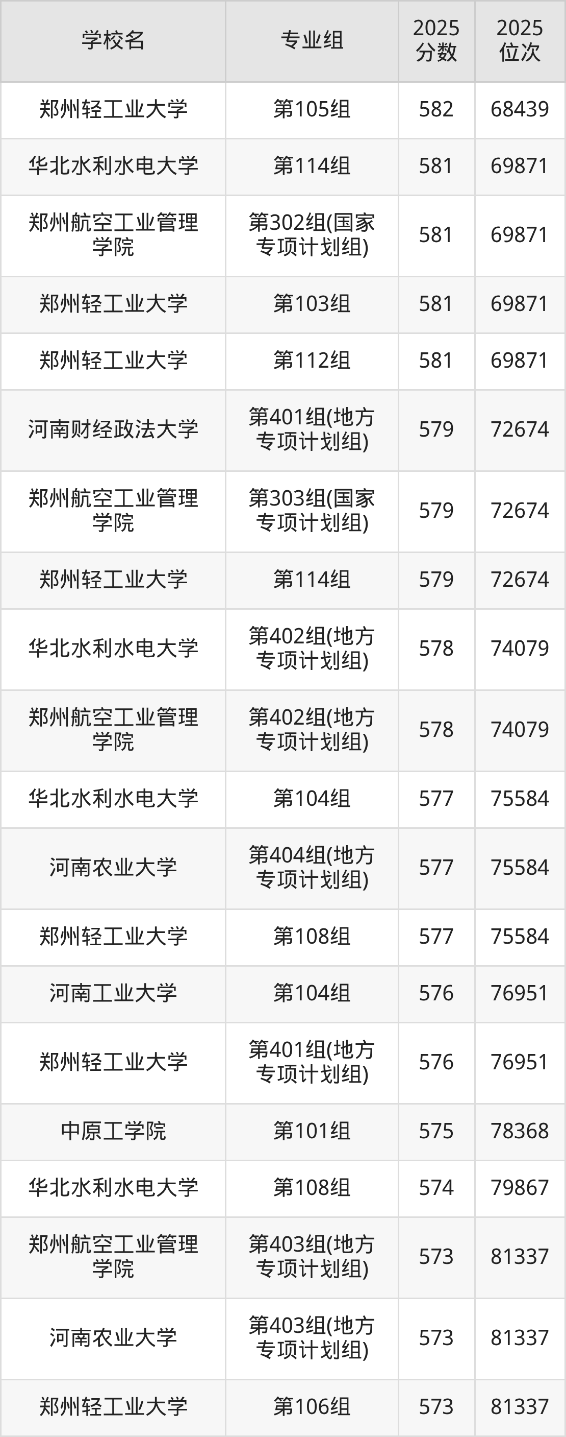 河南省所有理科院校2025年录取分数线一览表: