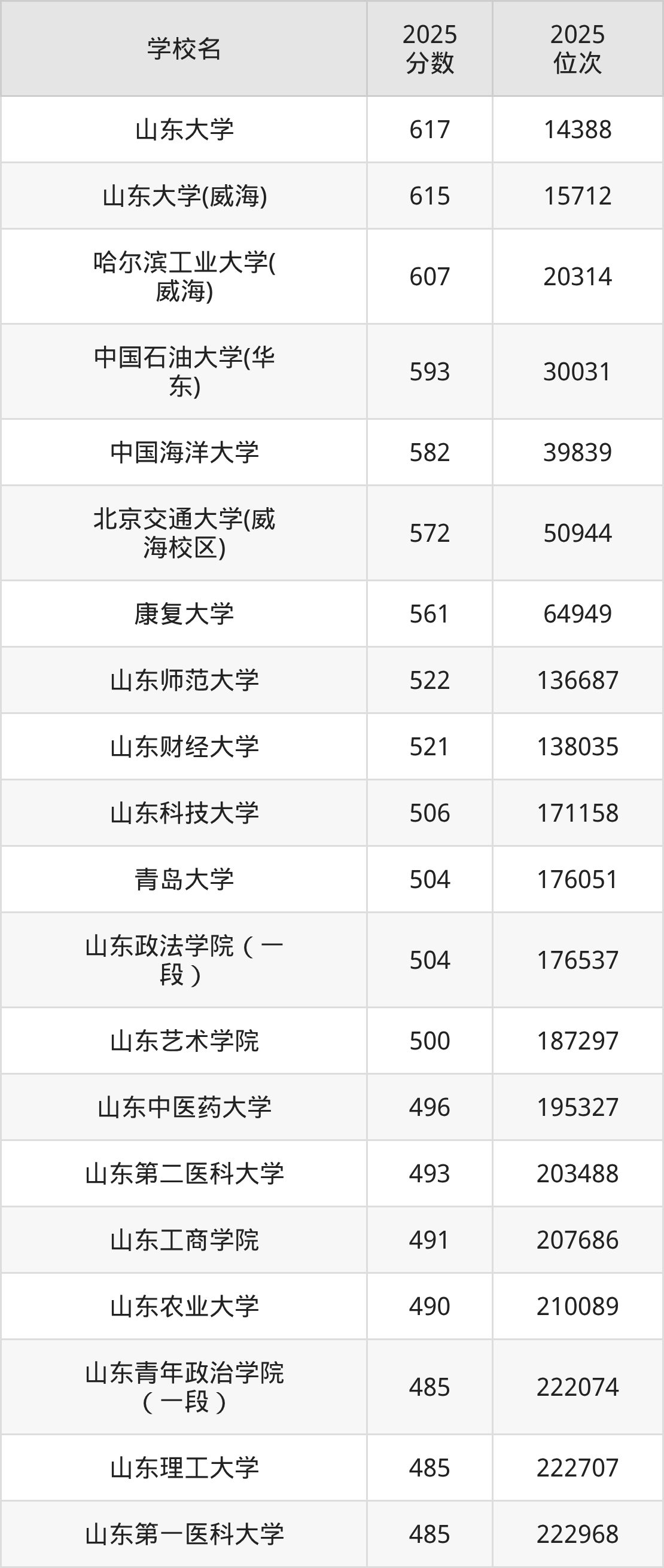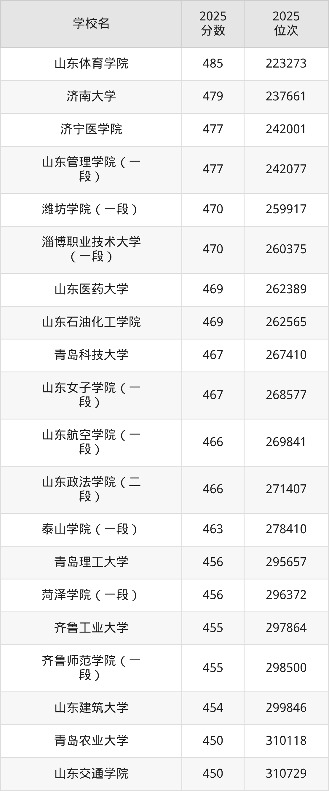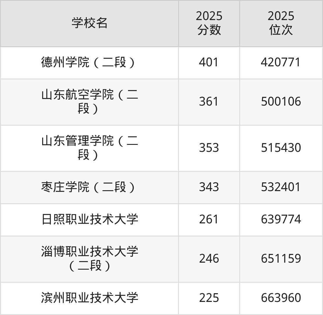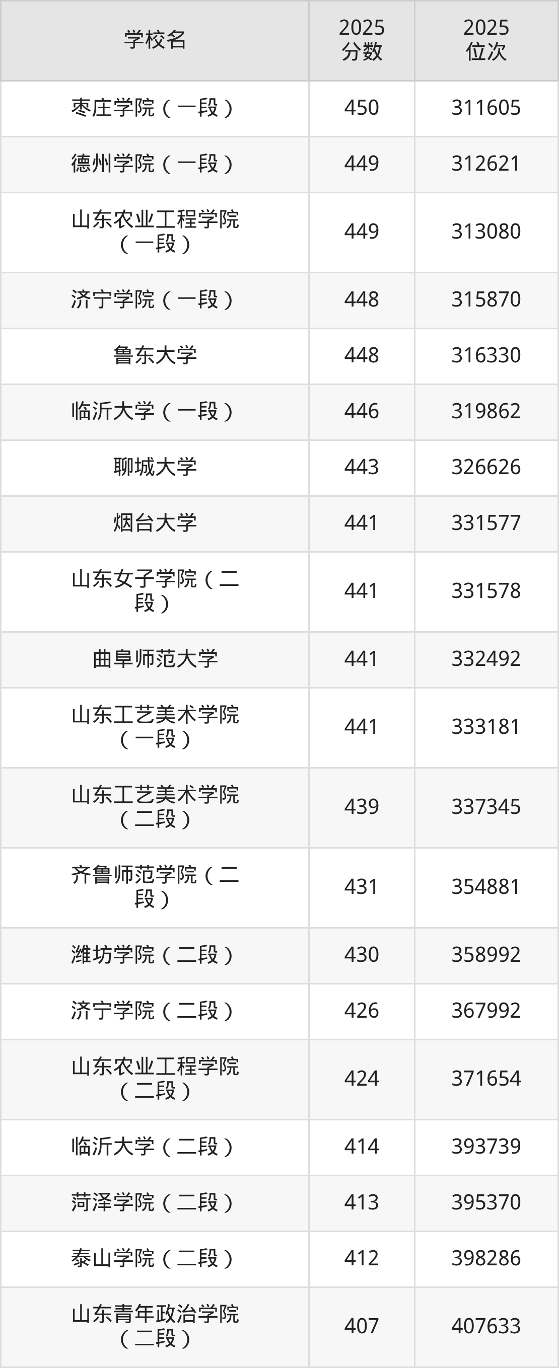 山东省所有公办本科院校2025年录取分数线一览表: