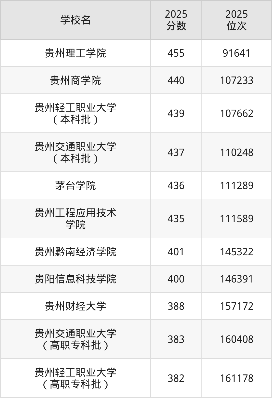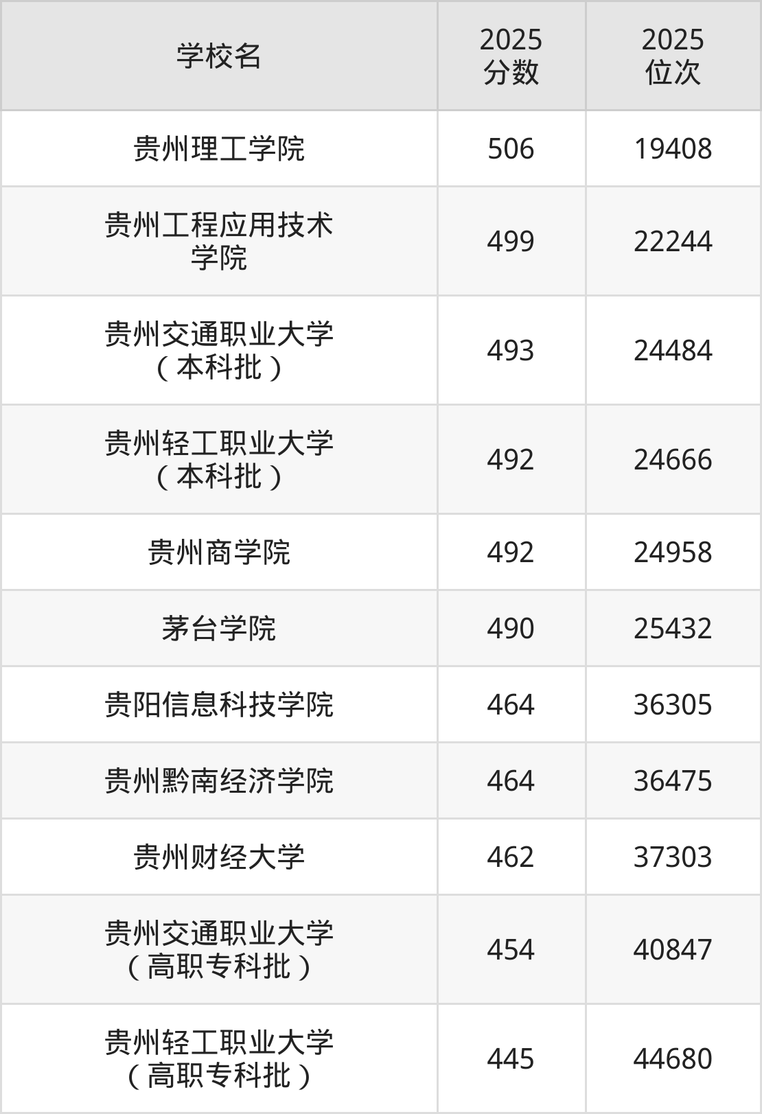 贵州省所有理科院校2025年录取分数线一览表(前11院校):