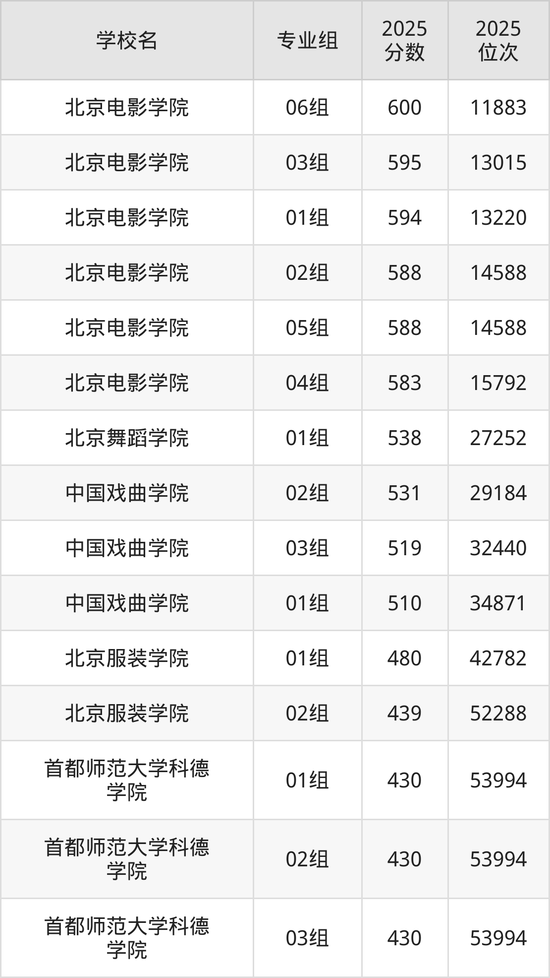 北京市所有二本艺术院校2025年录取分数线一览表(前15院校专业组):