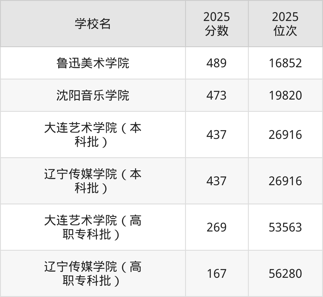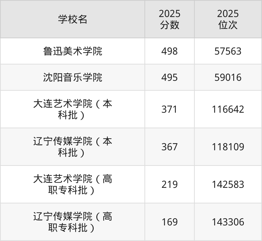 辽宁省所有二本艺术院校2025年录取分数线一览表(前6院校):