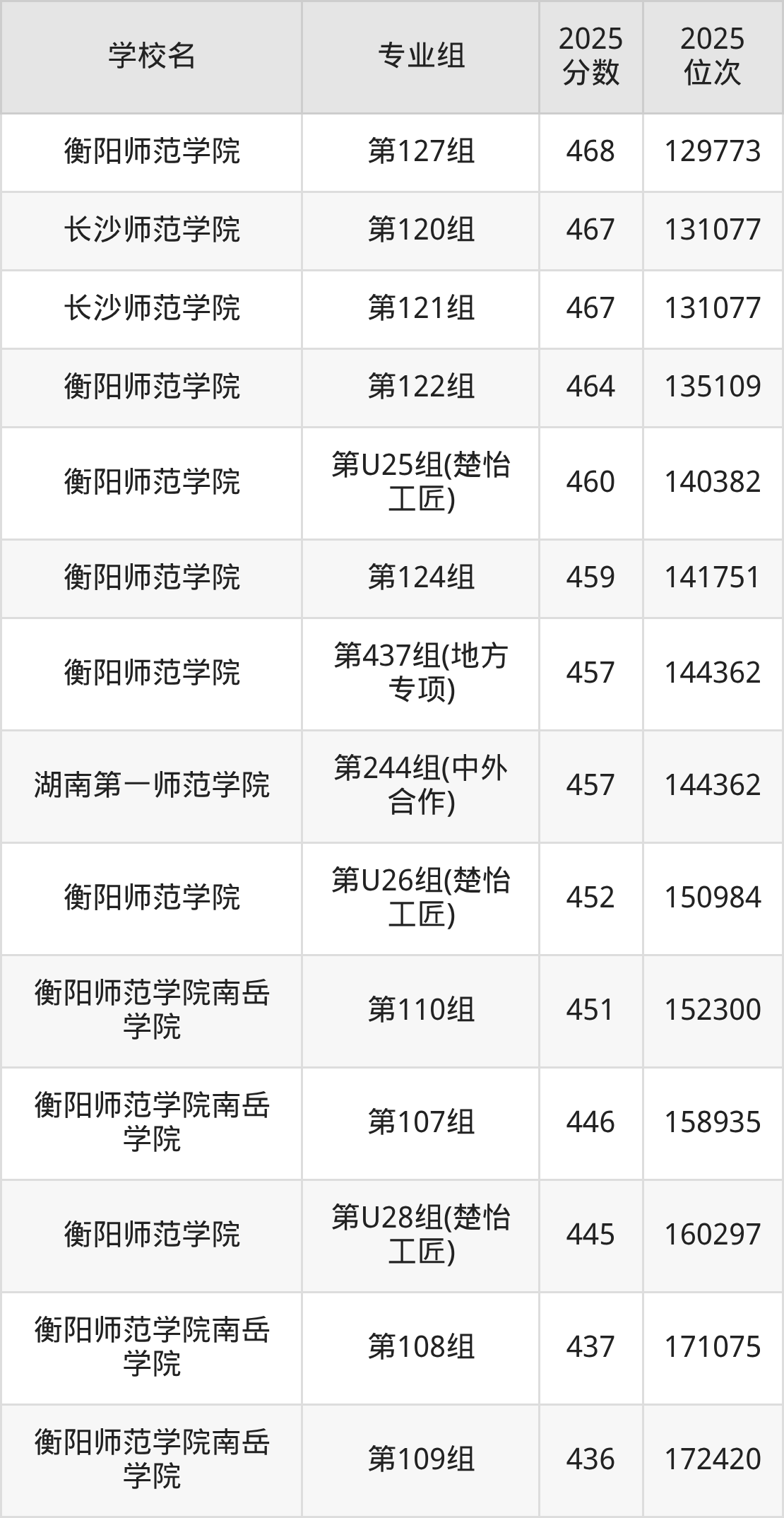 物理类最好考、收分最低的是:衡阳师范学院南岳学院,2025年第109组最低分436分,最低排名172420名;历史类最好考、收分最低的是:衡阳师范学院南岳学院,2025年第104组最低分477分,最低排名37270名。