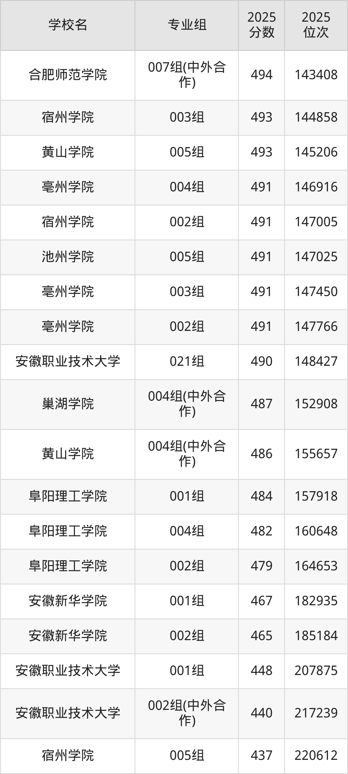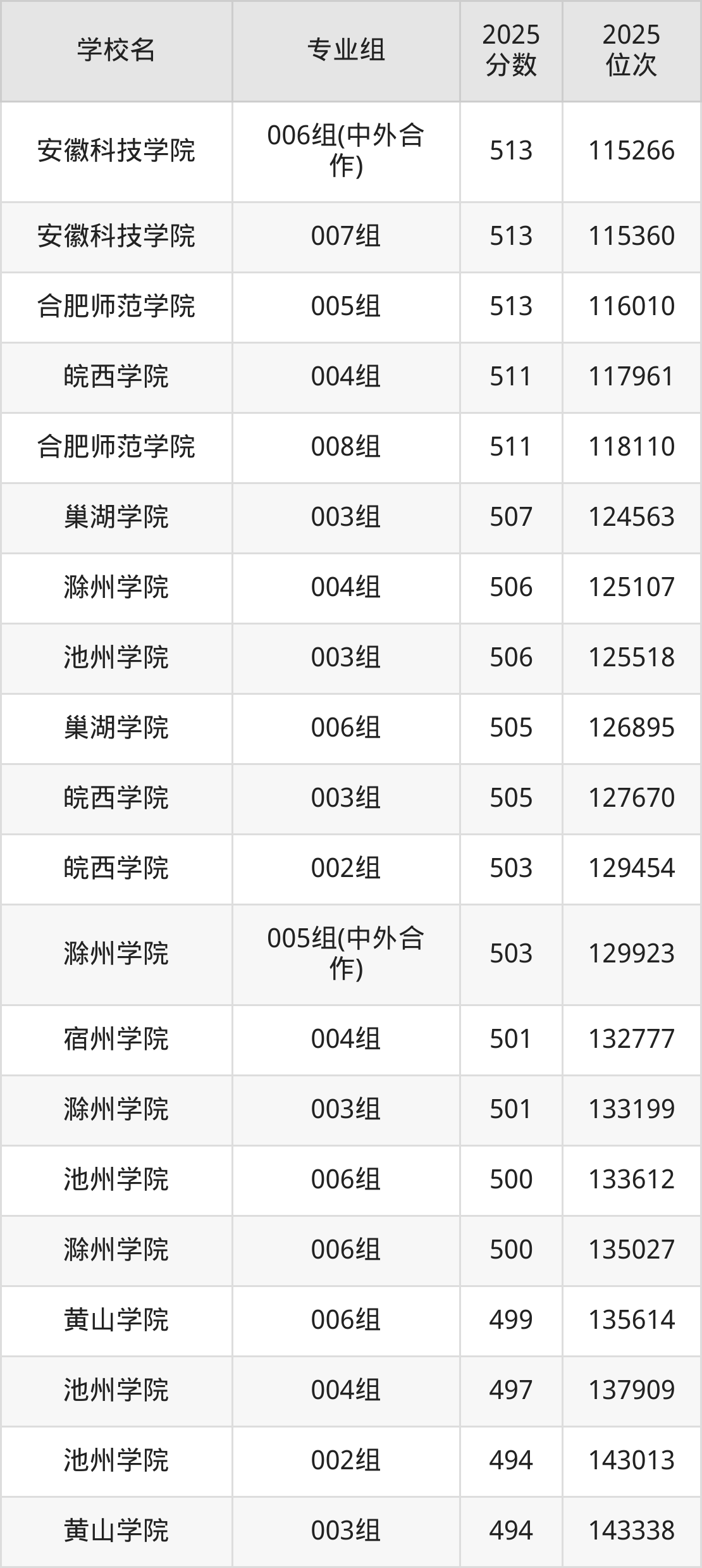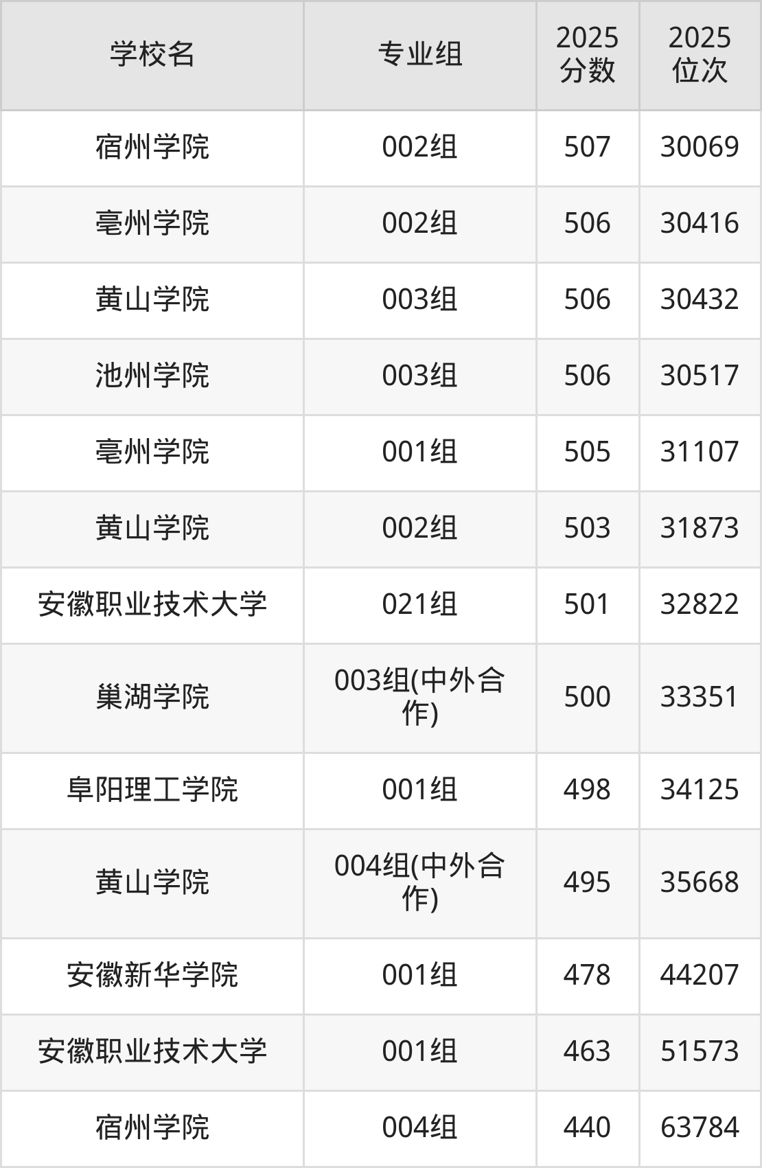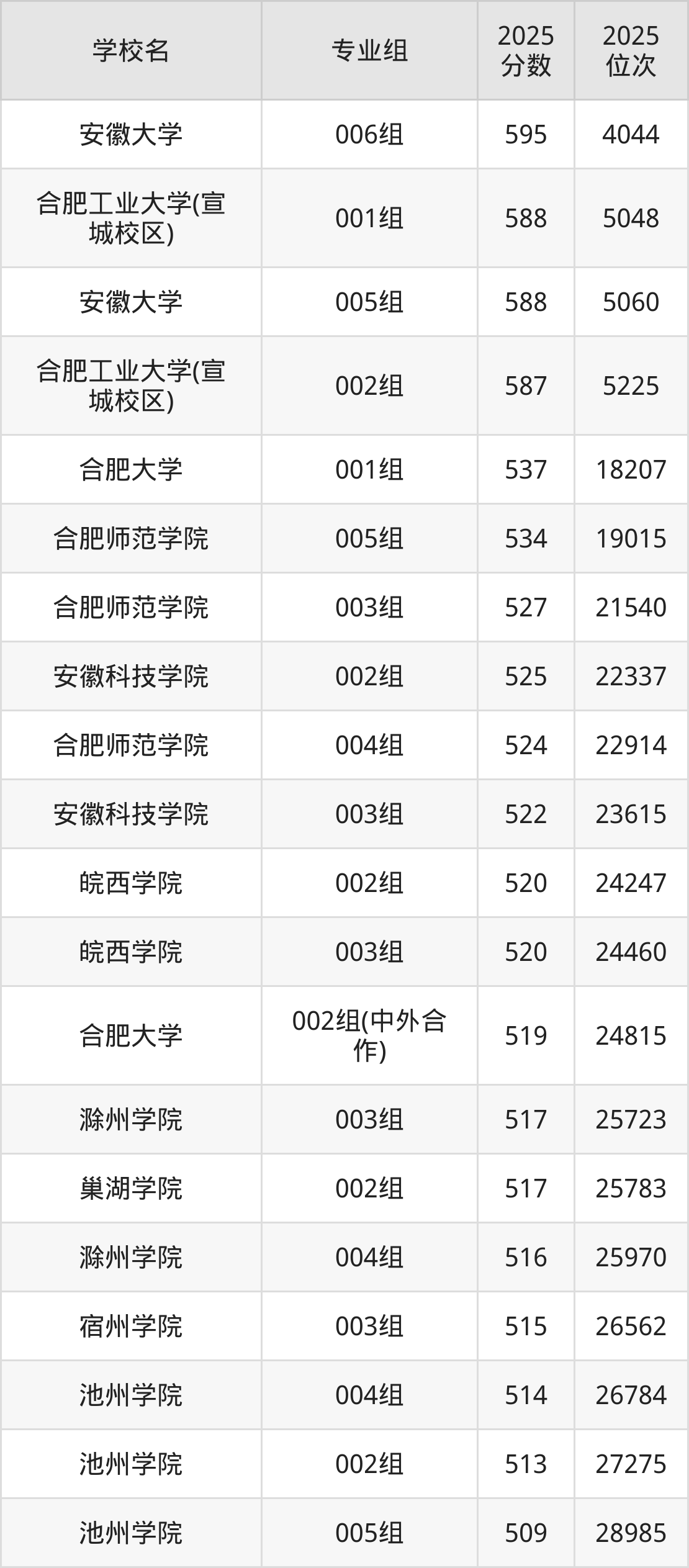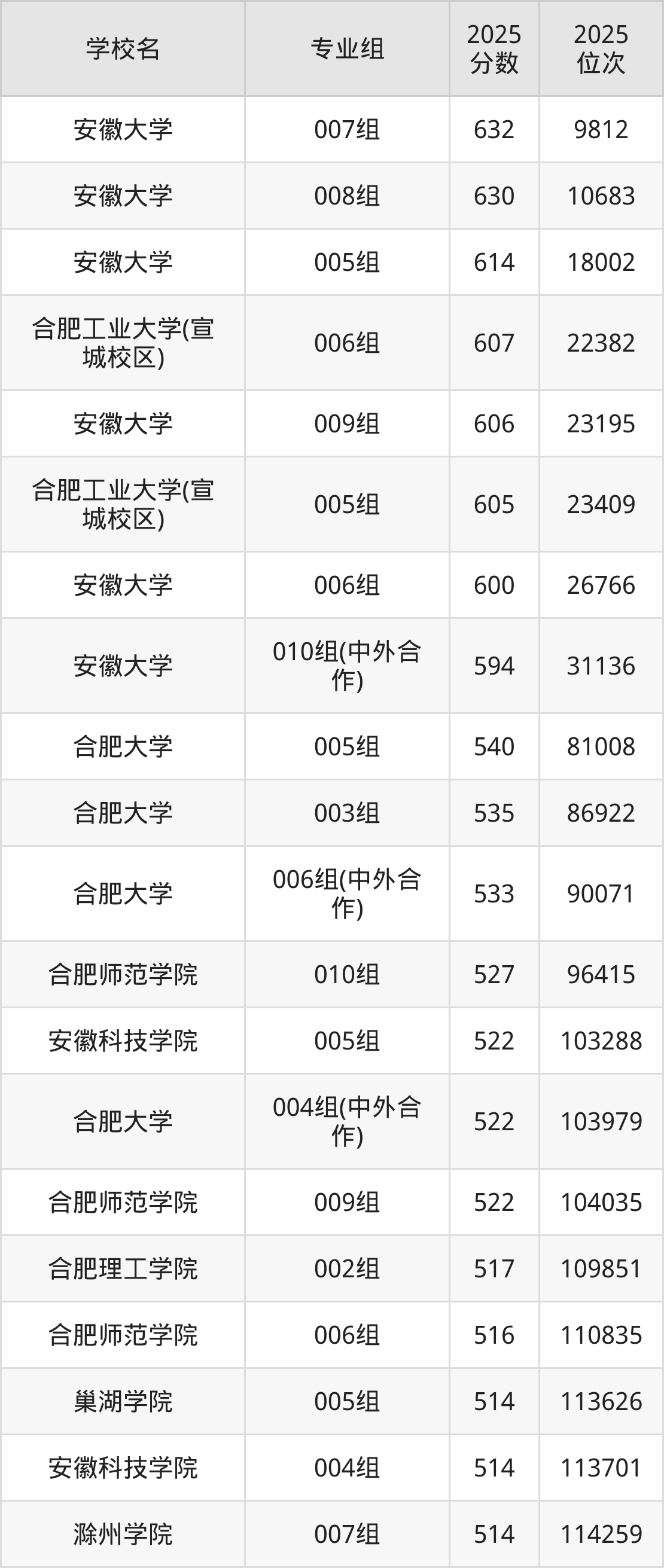 安徽省所有综合类院校2025年录取分数线一览表(前59院校专业组):