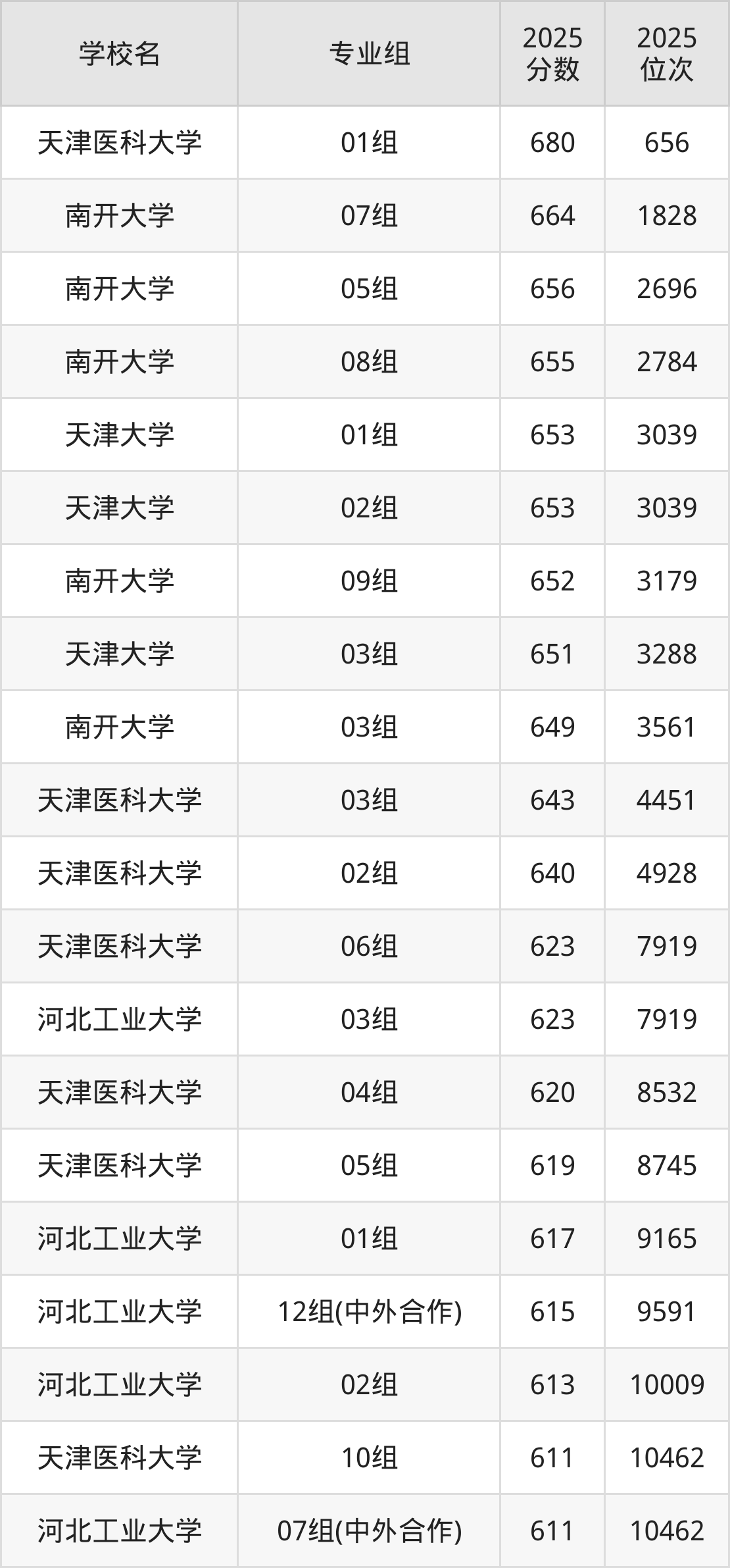 天津市所有211院校2025年录取分数线一览表(前29院校专业组):