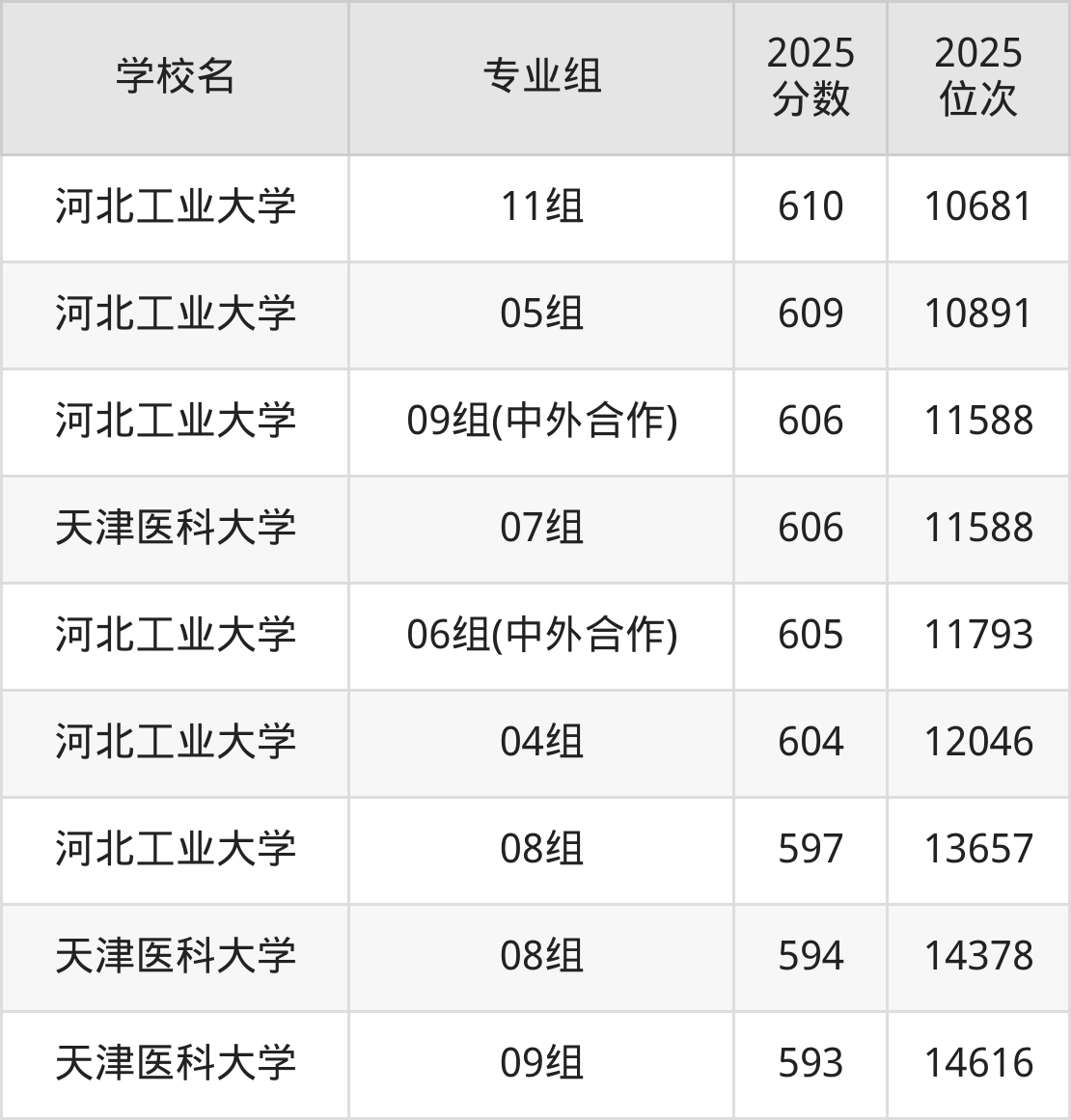 最好考、收分最低的是:天津医科大学,2025年09组最低分593分,最低排名14616名。