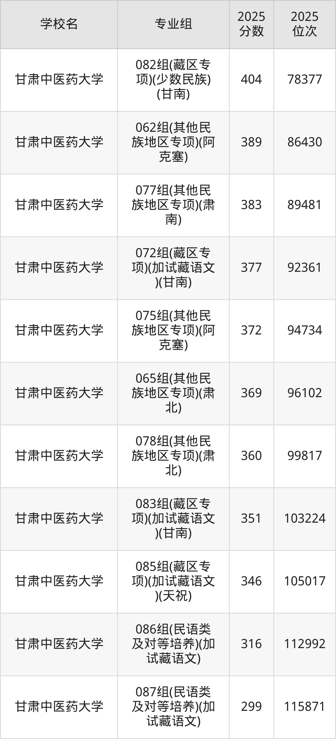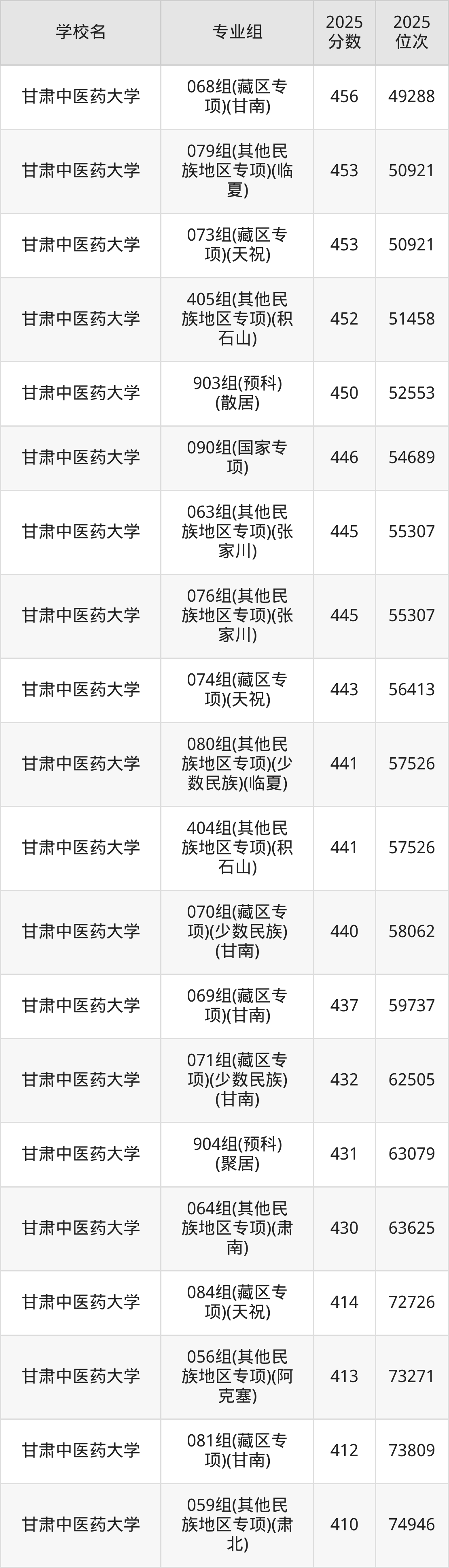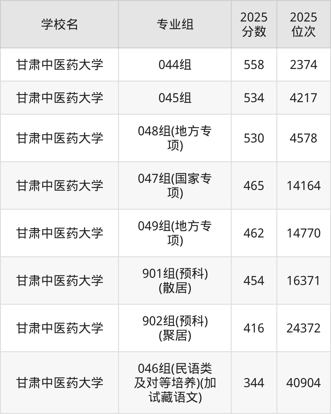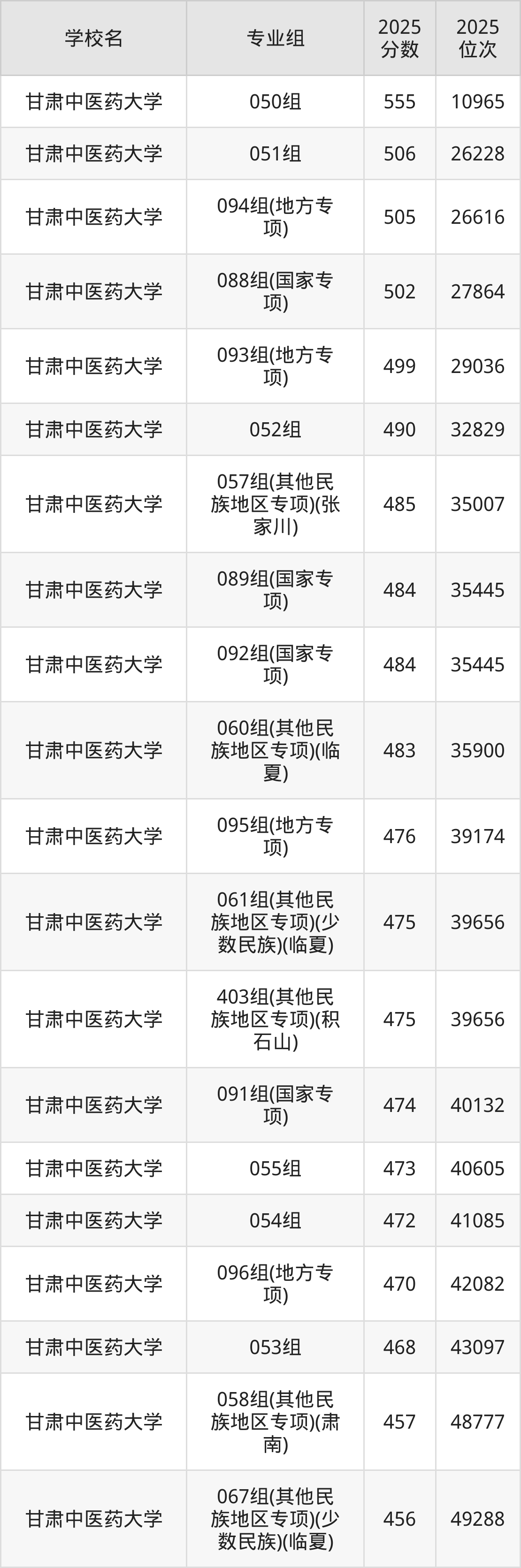 甘肃省所有中医药院校2025年录取分数线一览表(前51院校专业组):