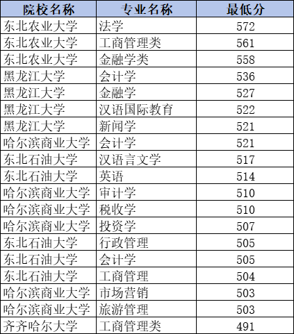 2024年地方专项计划各大学在黑龙江历史类分数线最低、最易考的两所院校及专业为:哈尔滨商业大学市场营销(503分)、哈尔滨商业大学旅游管理(503分)、齐齐哈尔大学工商管理类(491分)。