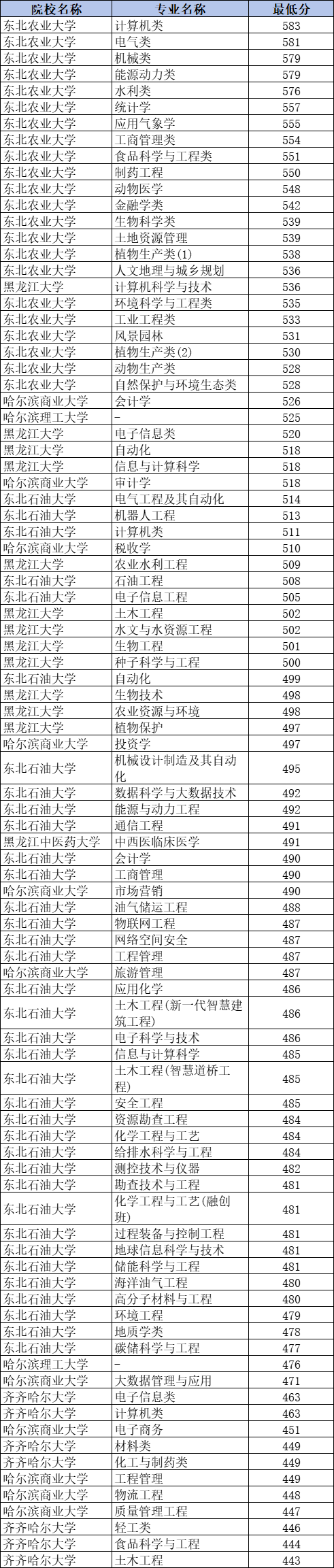 2024年地方专项计划各大学在黑龙江物理类分数线最高、最难考的一所院校及专业为:东北农业大学计算机类(583分)、东北农业大学电气类(581分)、东北农业大学机械类(579分)、东北农业大学能源动力类(579分);