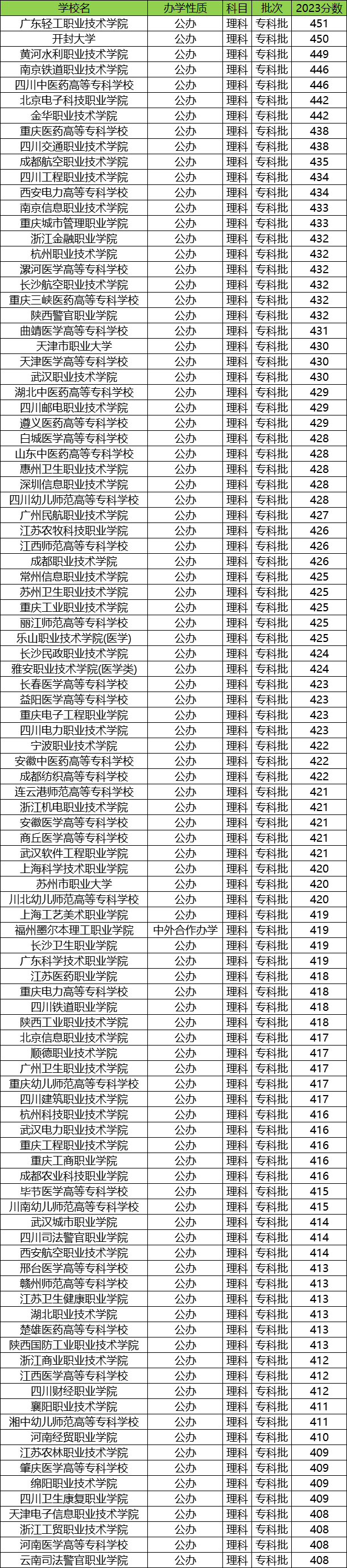 全国专科学校在四川省理科考生中高考分数区间在451分-150分。按分数高低排在第1-5位的有广东轻工职业技术学院、开封大学、黄河水利职业技术学院、南京铁道职业技术学院、四川中医药高等专科学校。分数最低的则是吐鲁番职业技术学院、和田职业技术学院、石河子工程职业技术学院、巴音郭楞职业技术学院、榆林能源科技职业学院等,均为150分。