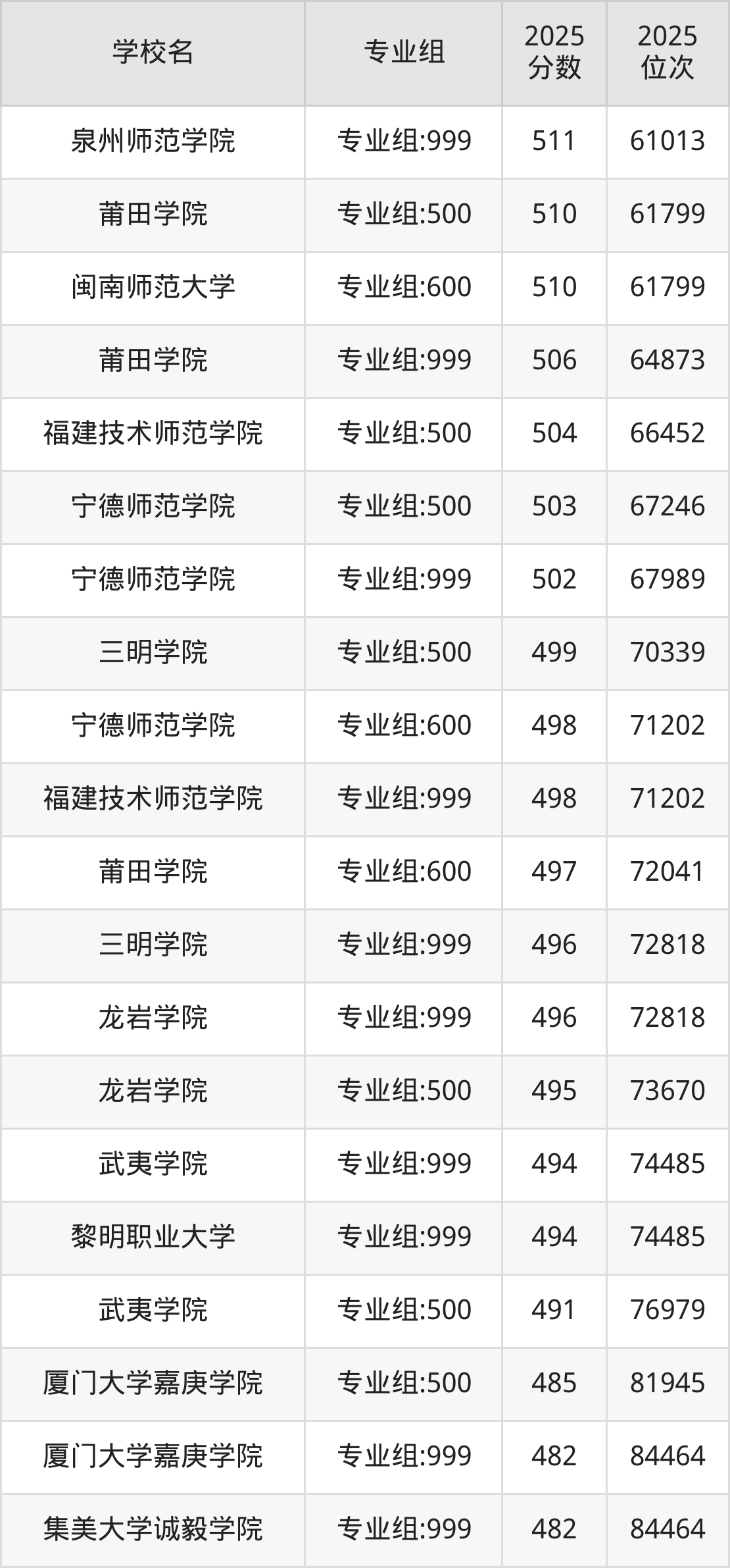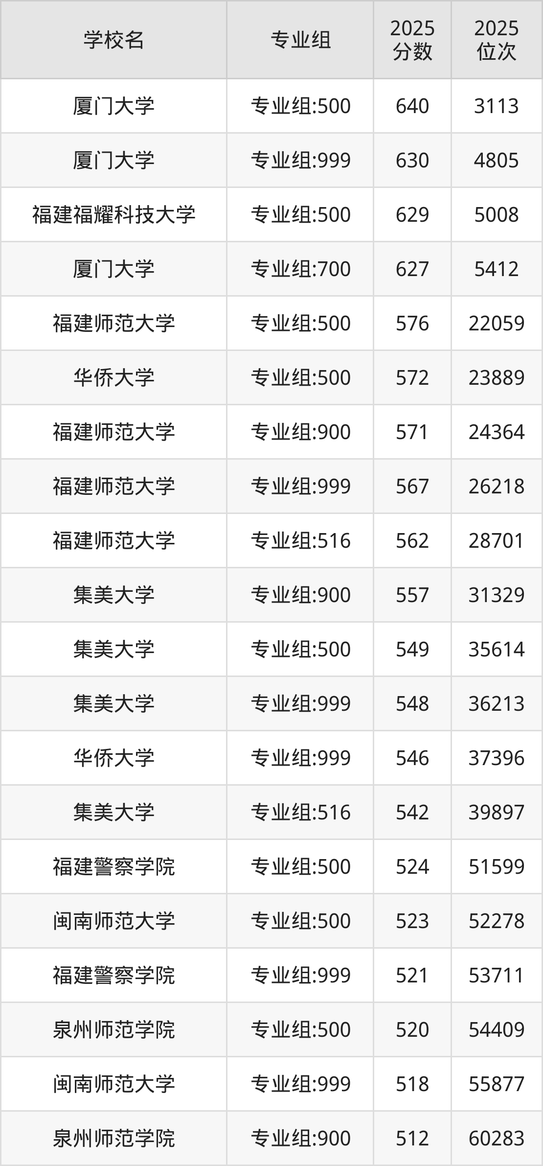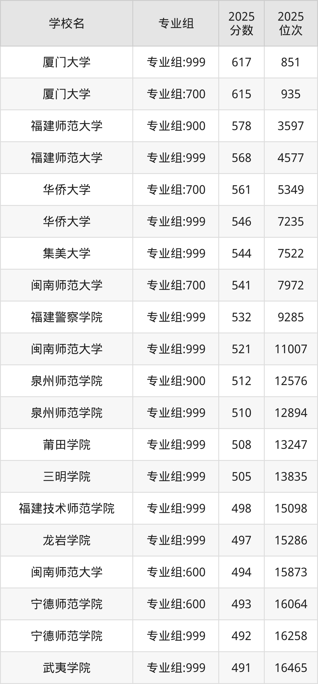 福建省所有文科院校2025年录取分数线一览表(前55院校专业组):