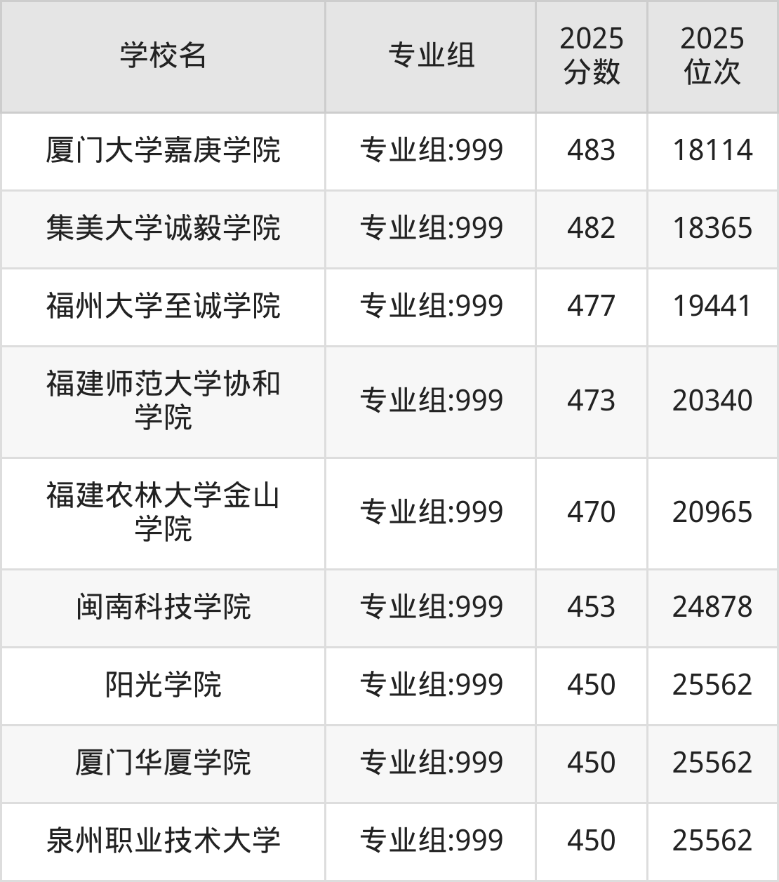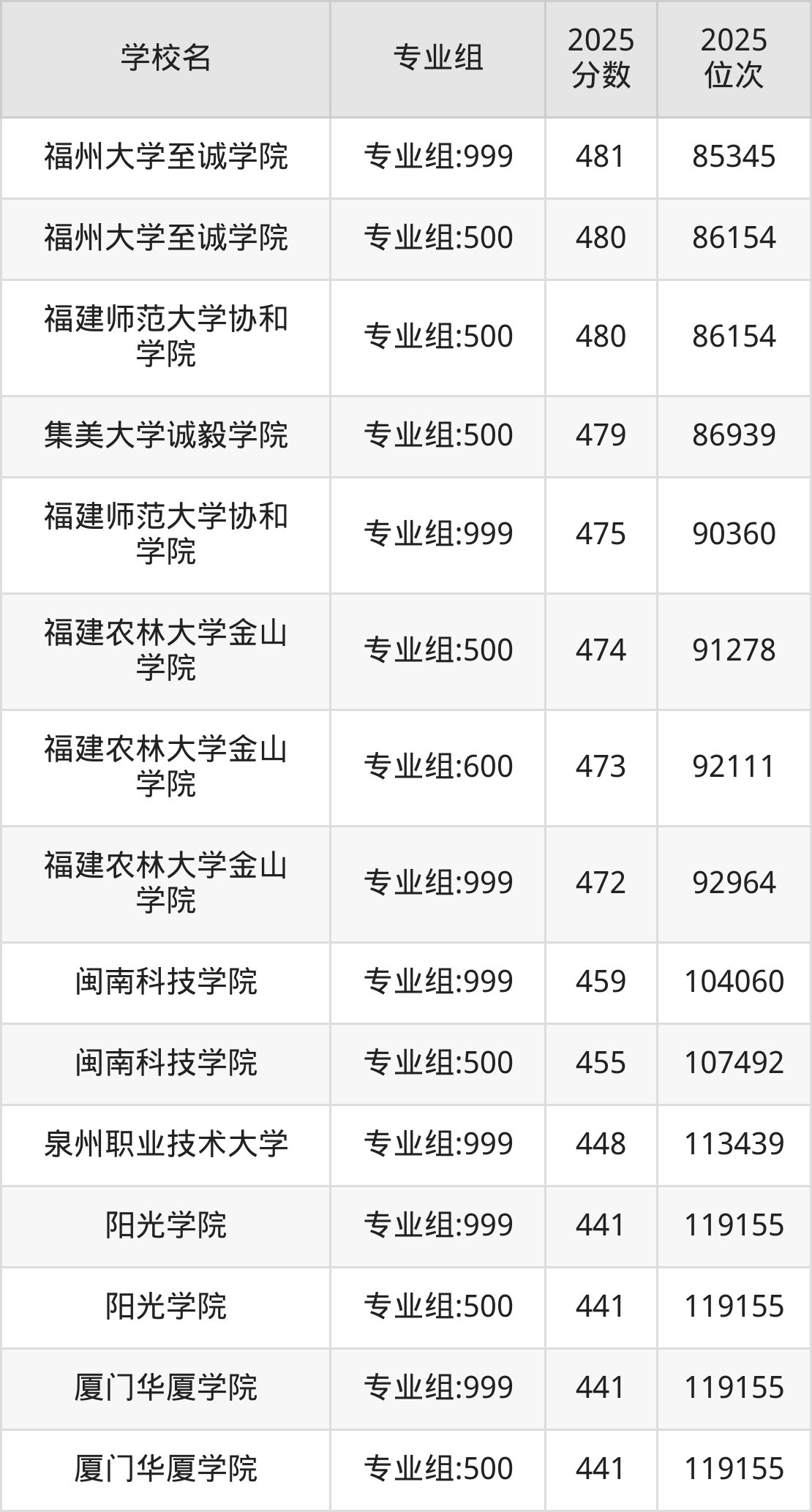 物理类最好考、收分最低的是:阳光学院,2025年专业组:999最低分441分,最低排名119155名;历史类最好考、收分最低的是:阳光学院,2025年专业组:999最低分450分,最低排名25562名。