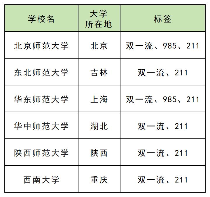 中国国家公费师范生大学一共有6所,分别是北京师范大学、东北师范大学、华中师范大学、华东师范大学、陕西师范大学、西南大学,这些院校分布在不同的省份,每一所都有自己的特色与优势,下面是国家公费师范生大学具体分布情况: