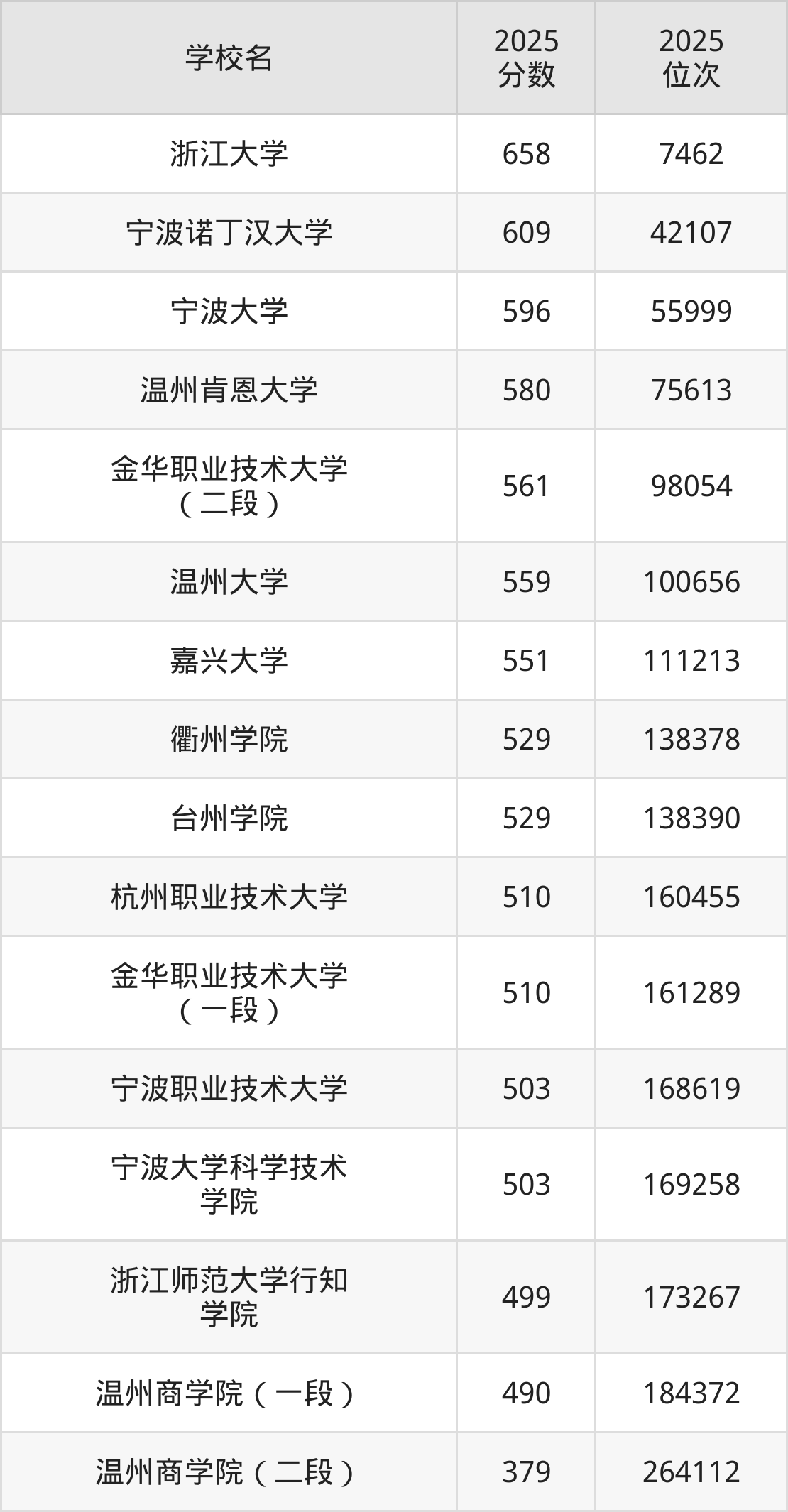 浙江省所有综合类院校2025年录取分数线一览表(前16院校):