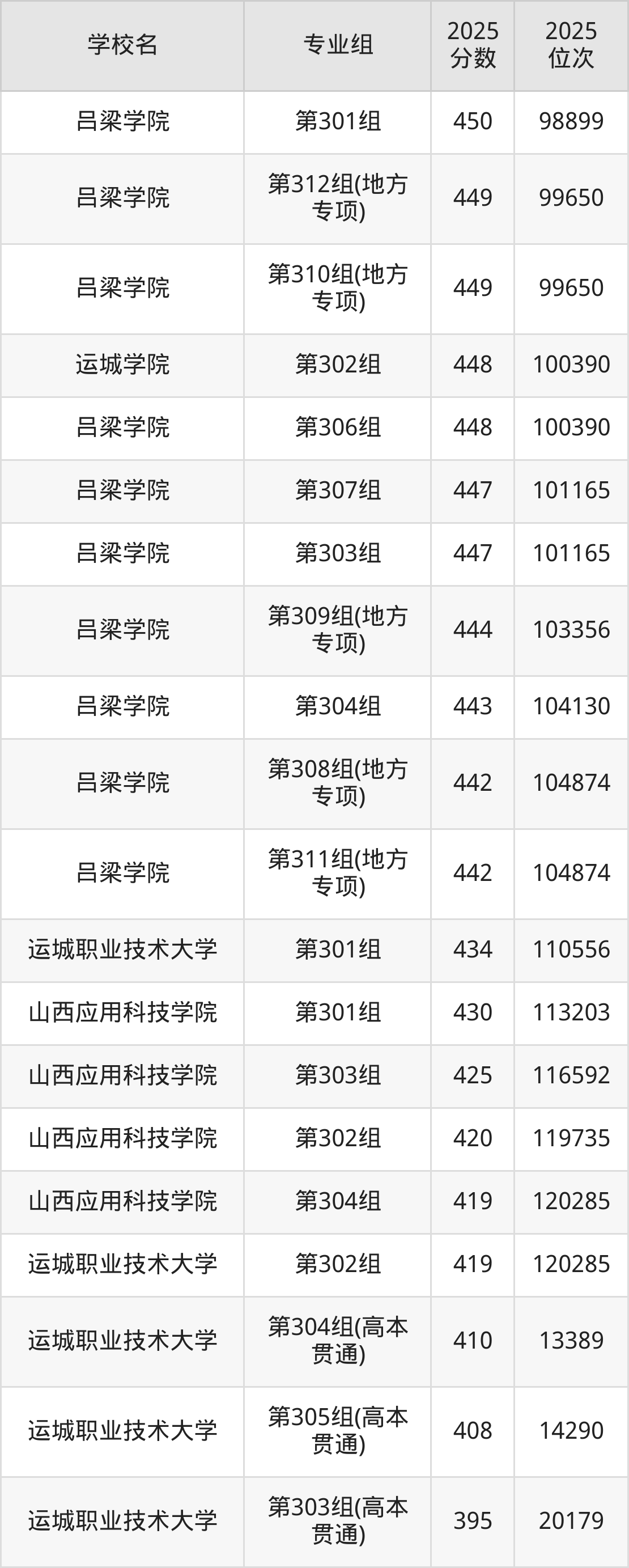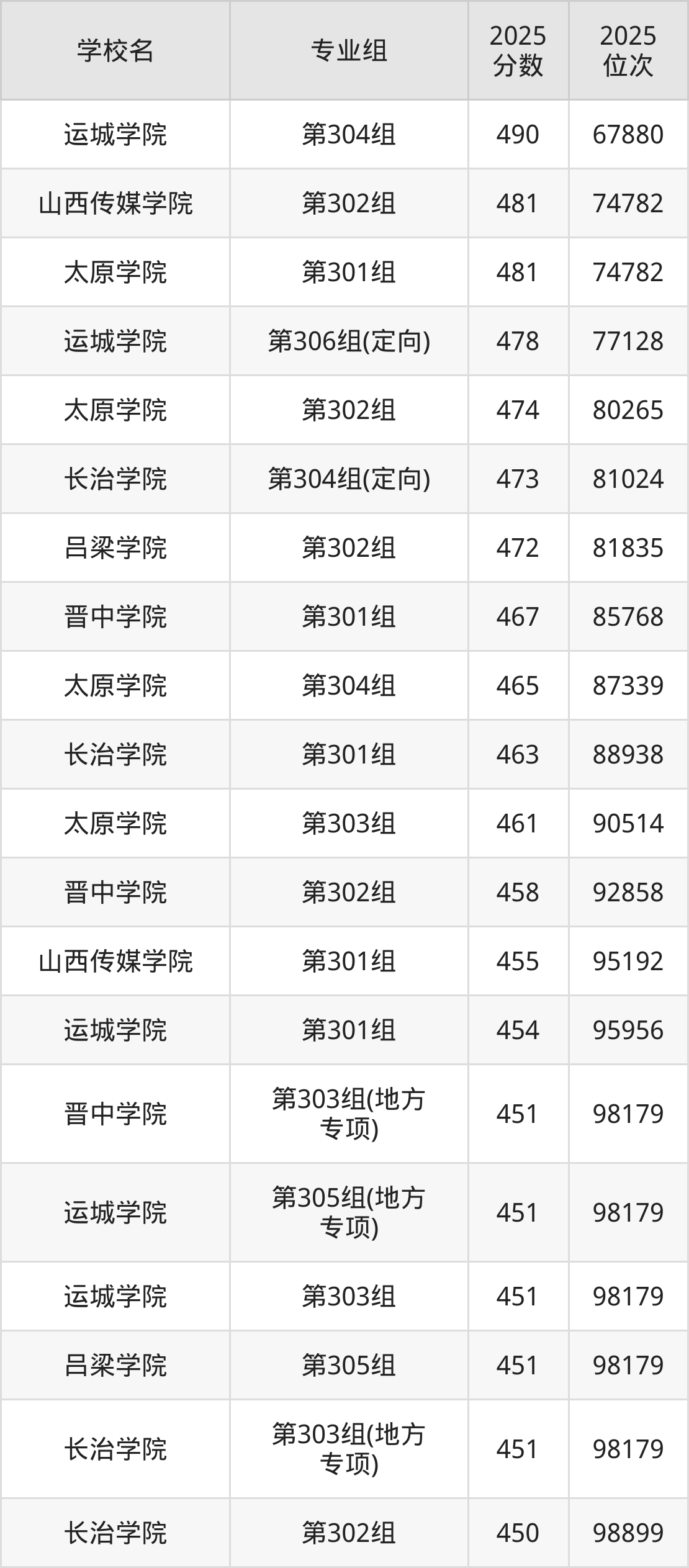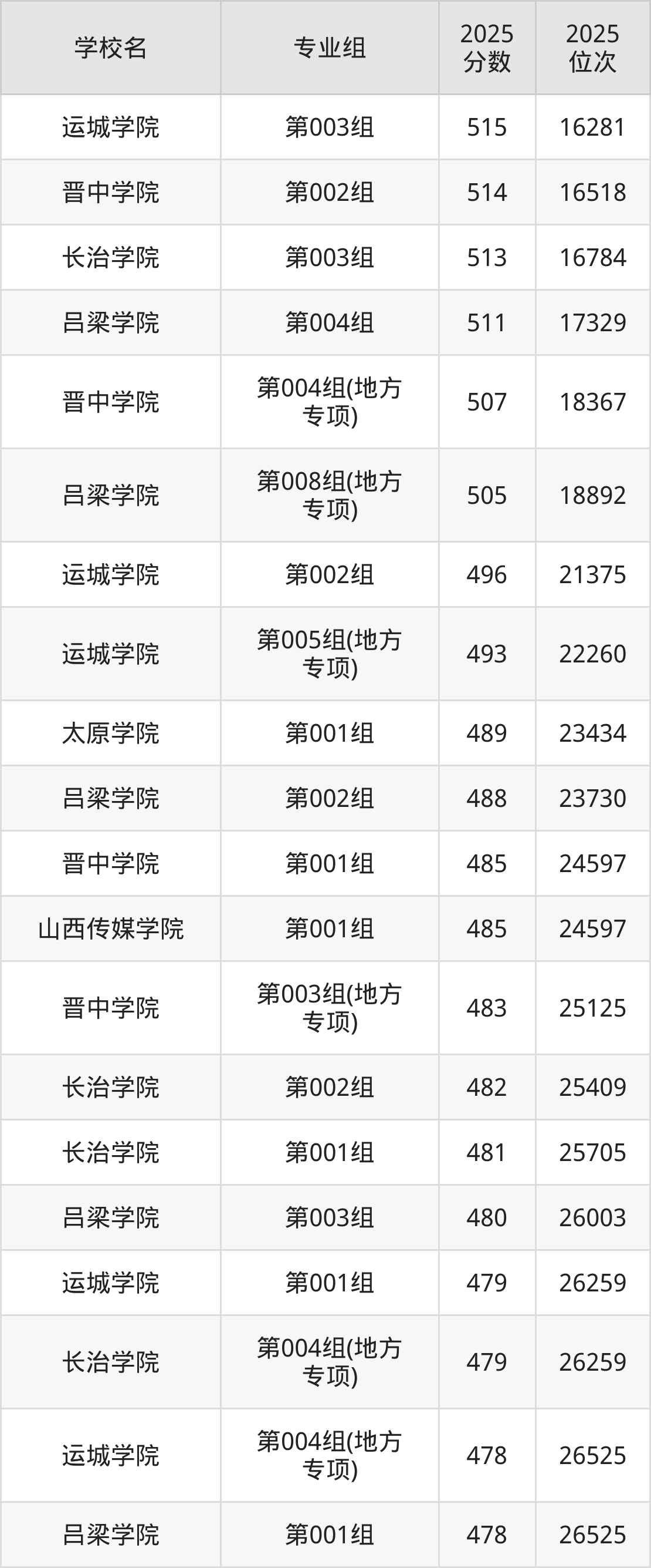 山西省所有二本综合院校2025年录取分数线一览表(前42院校专业组):