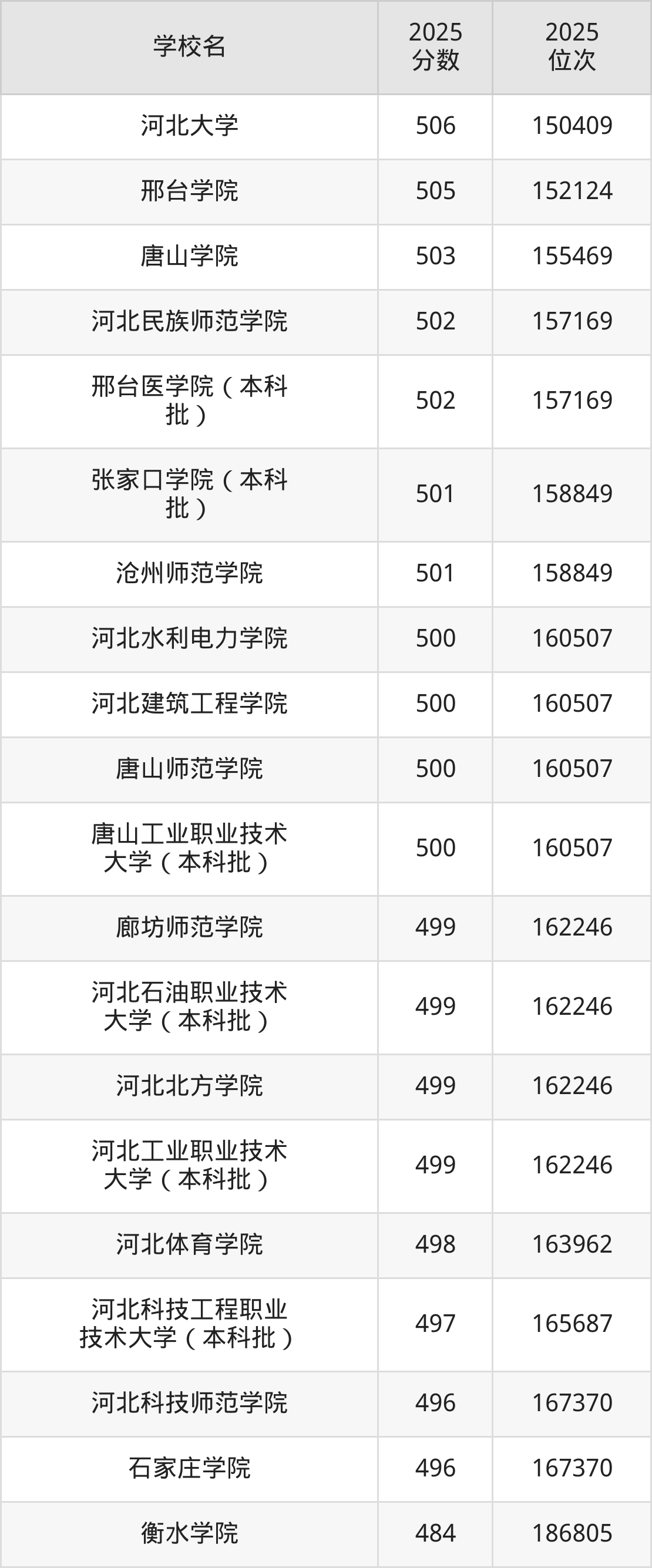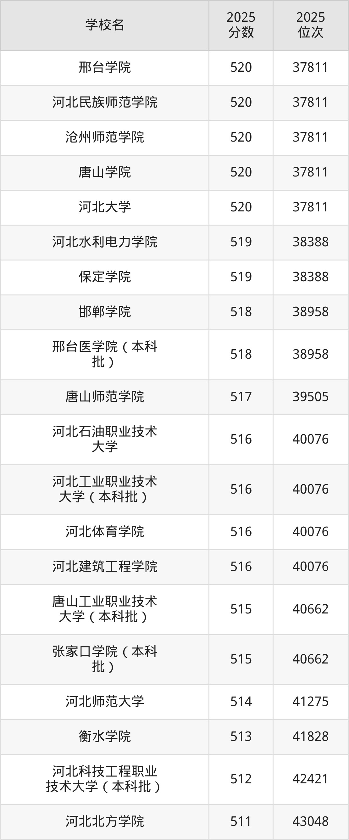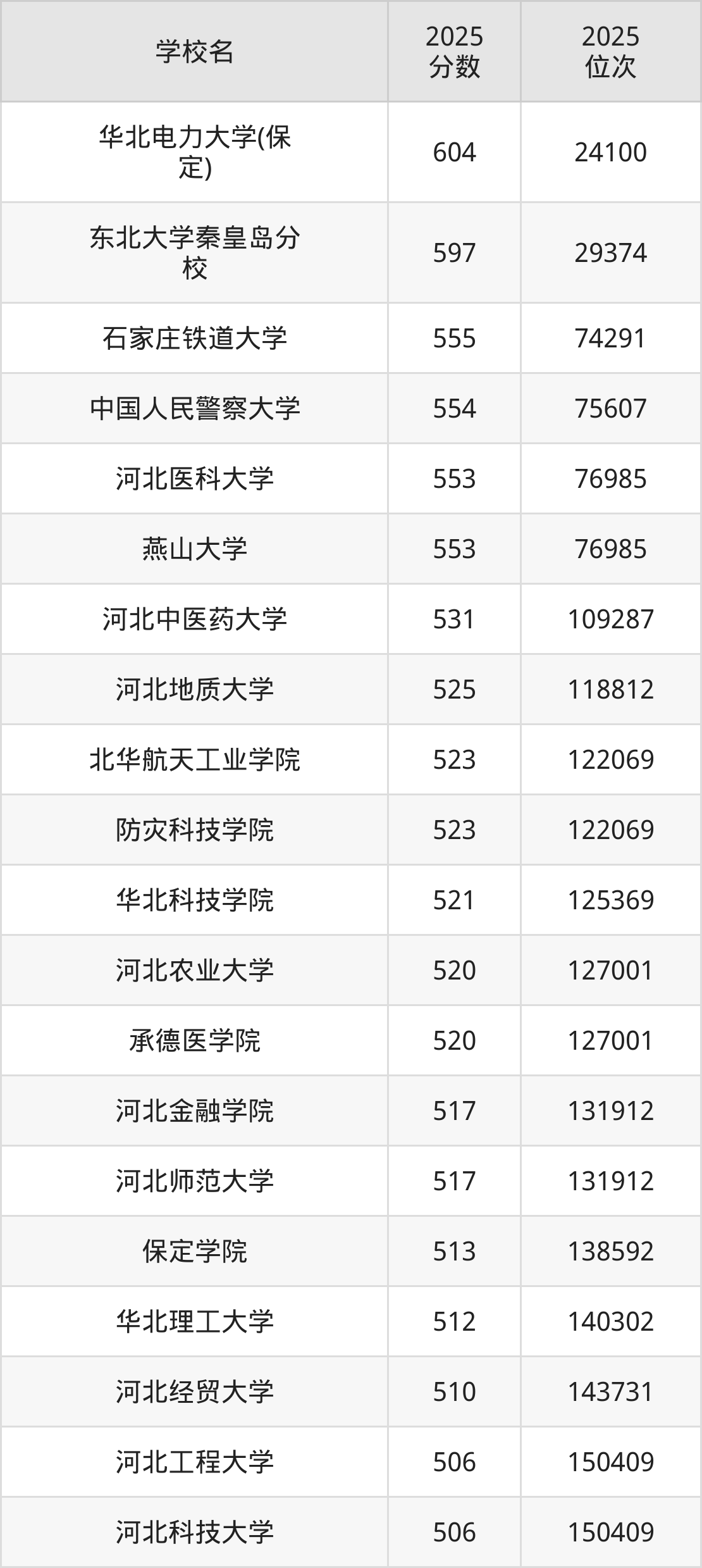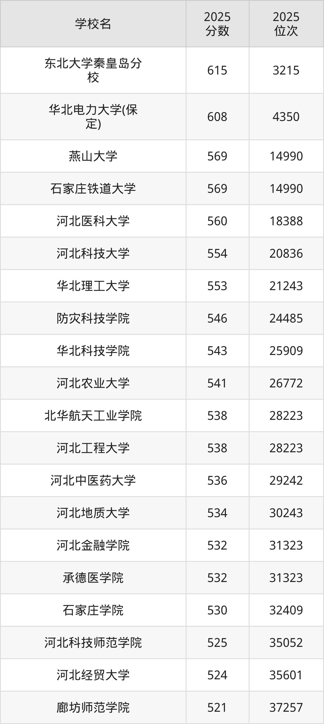 河北省所有公办本科院校2025年录取分数线一览表(前48院校):