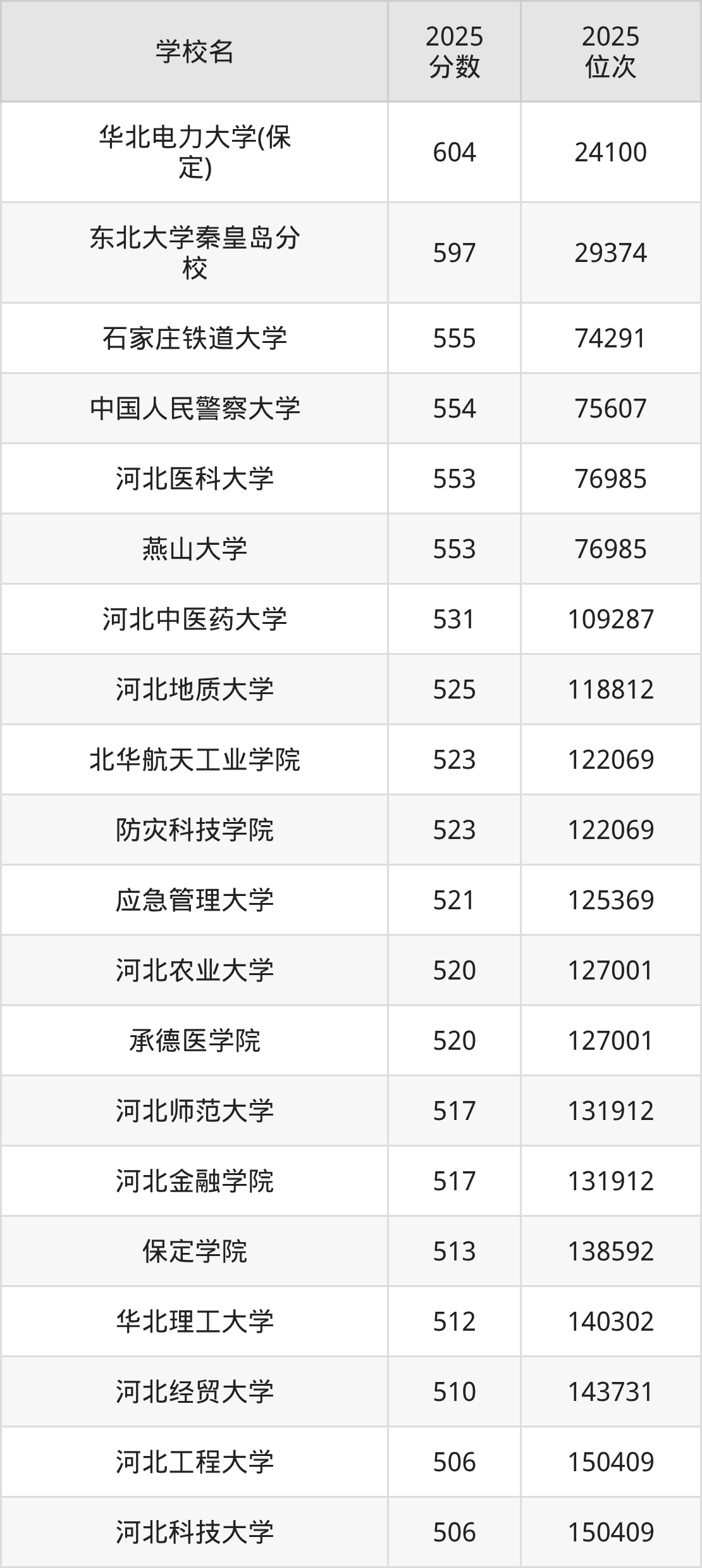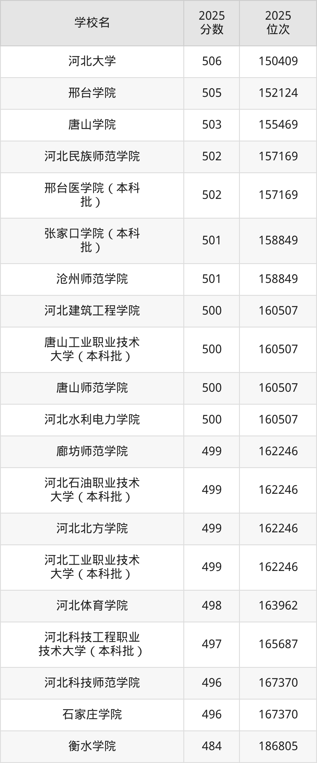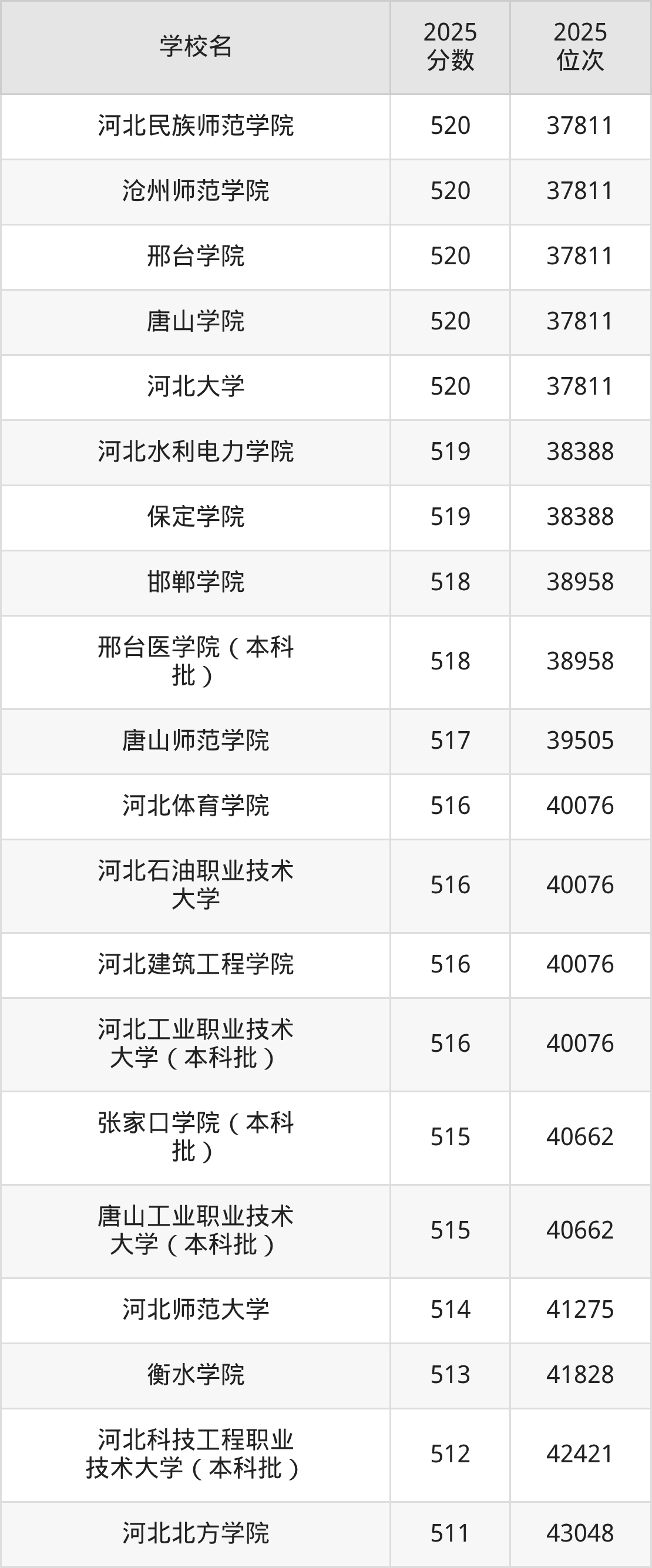 河北省所有公办本科院校2025年录取分数线一览表: