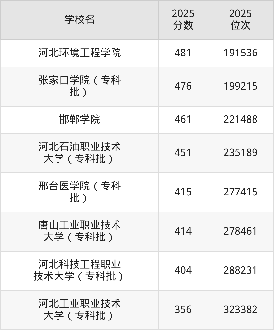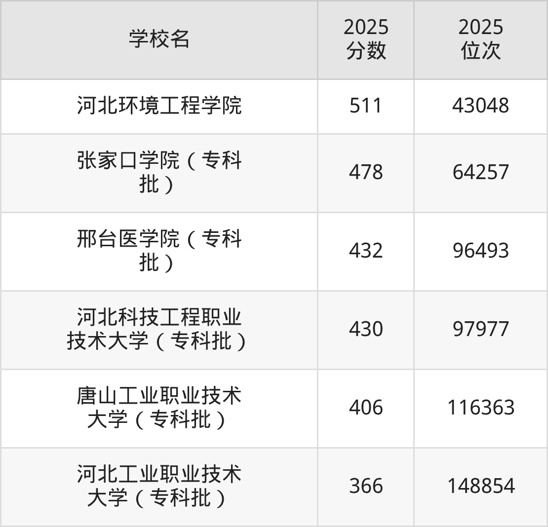 物理类最好考、收分最低的是:河北工业职业技术大学,2025年最低分356分,最低排名323382名;历史类最好考、收分最低的是:河北工业职业技术大学,2025年最低分366分,最低排名148854名。