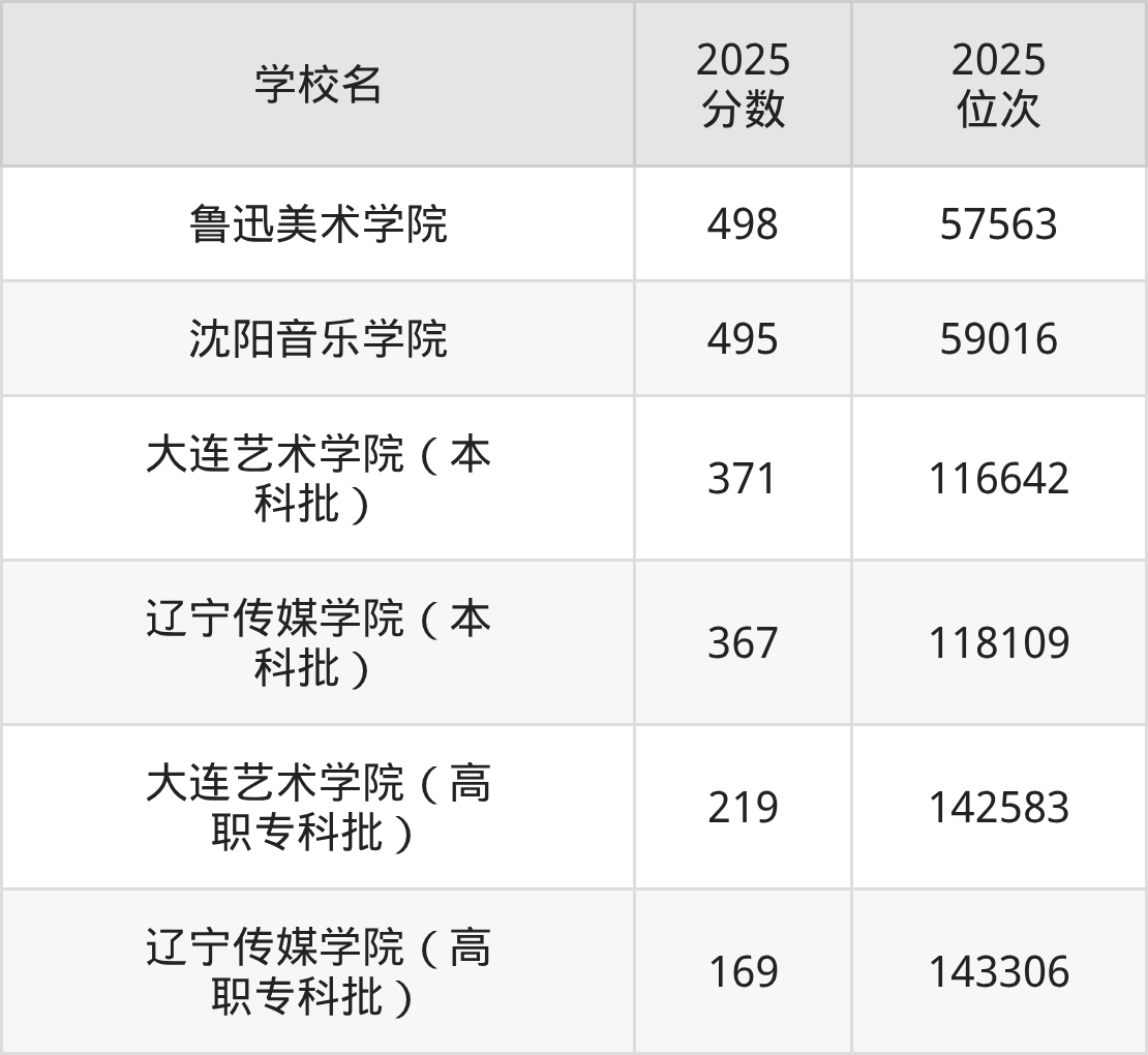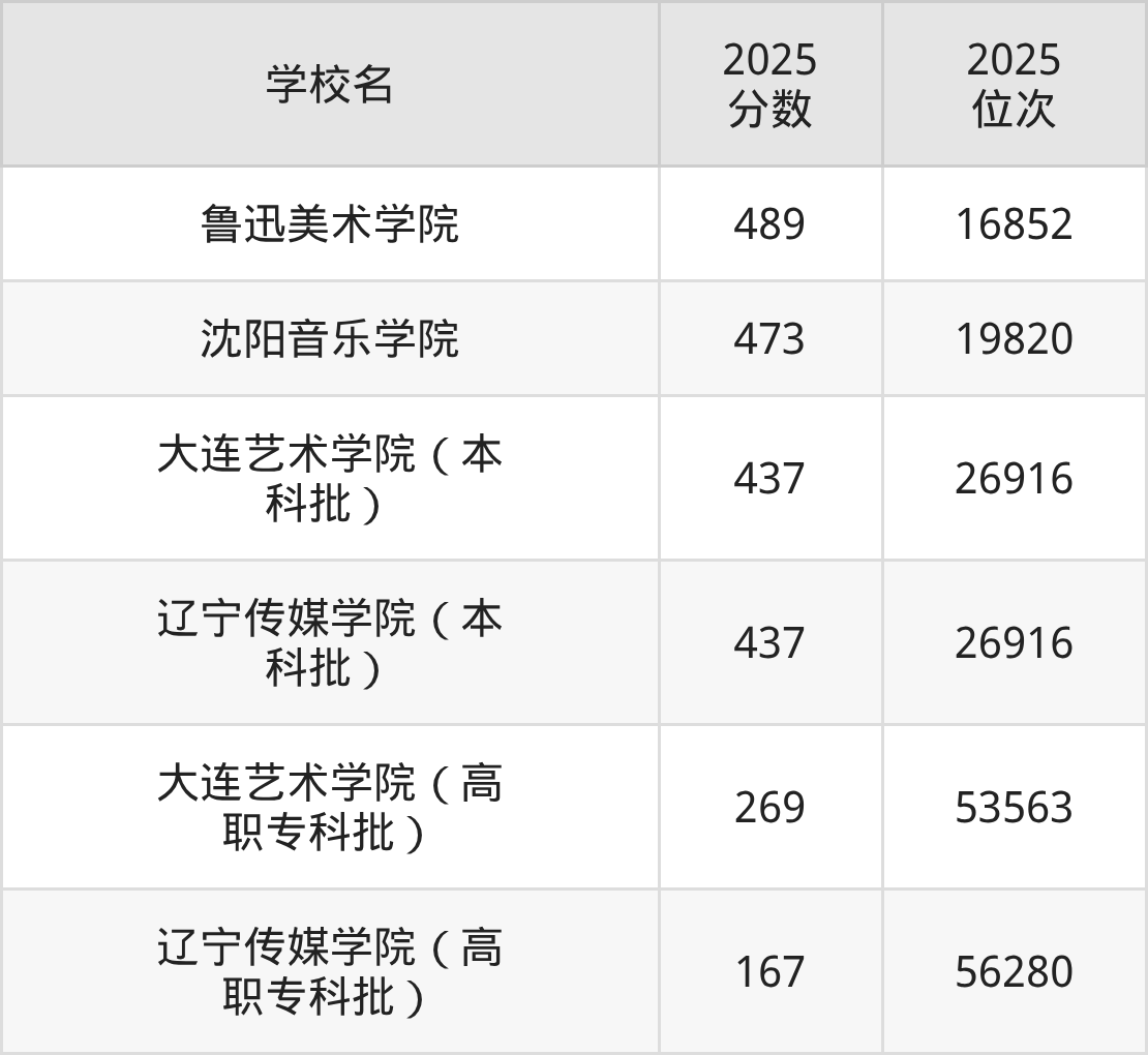 辽宁省所有艺术类院校2025年录取分数线一览表: