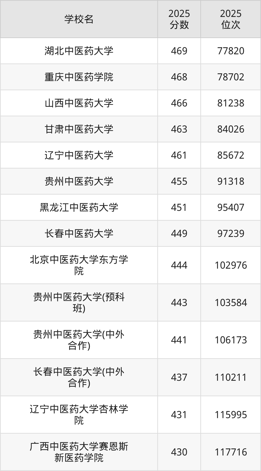 温馨提示:全国各省录取分数线不相同,本文以贵州省为例,为大家带来2025年录取分数线位于430到470分的中医药大学名单汇总,并附上该分数段对应的位次排名区间,供查阅。