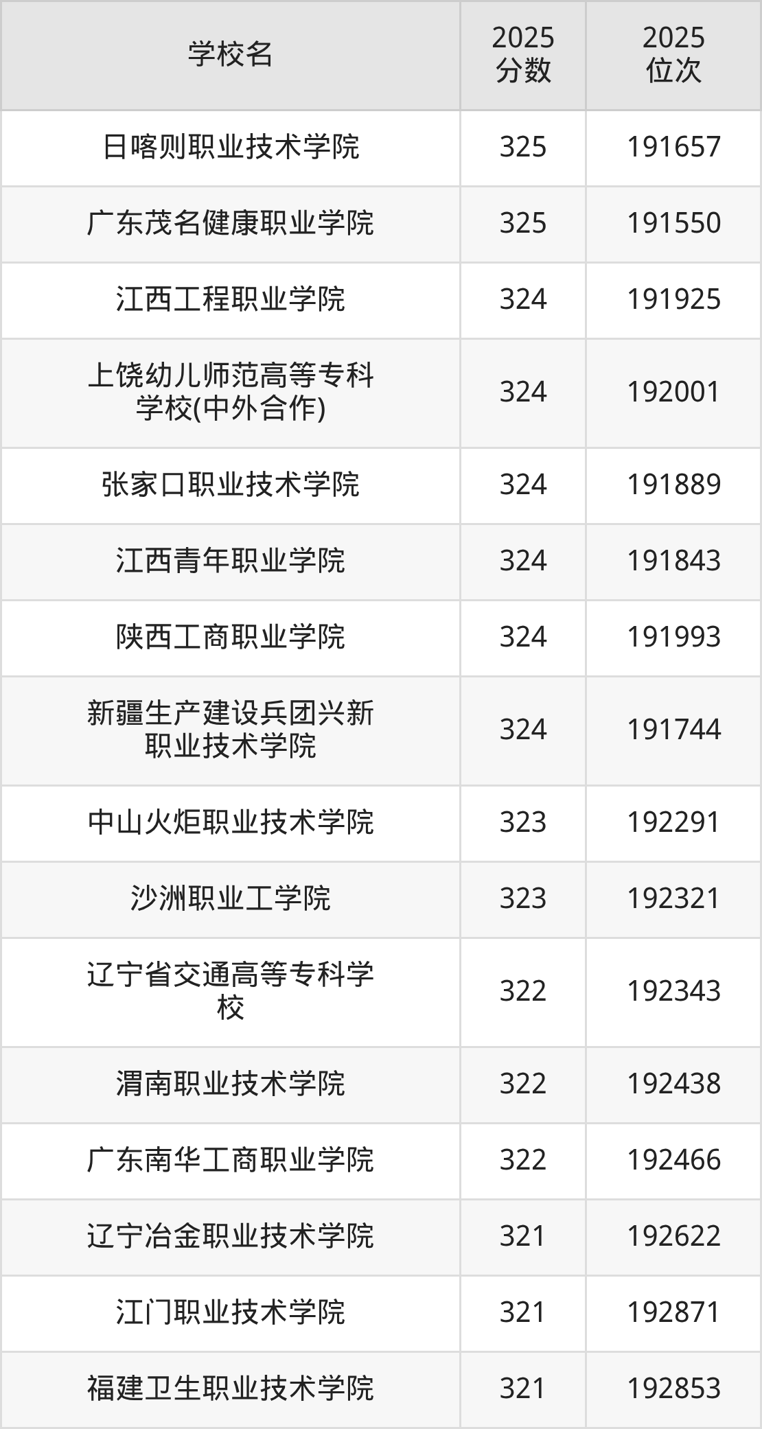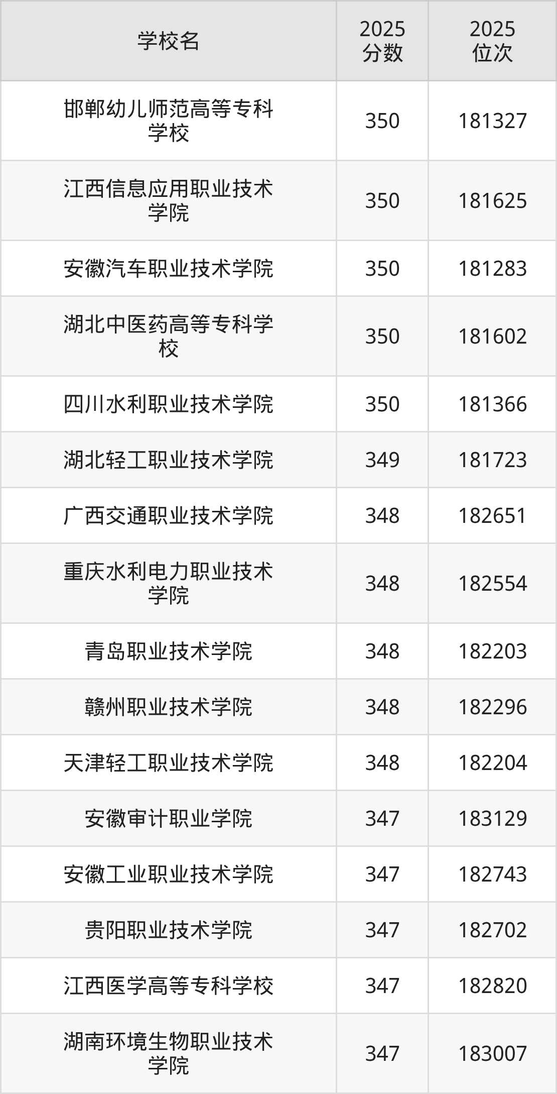 物理类300到350分的大学中分数对应位次最高的是邯郸幼儿师范高等专科学校,2025年最低分350分,对应最低位次是181327名;分数对应位次最低的是山东交通职业学院,2025年最低分300分,对应最低位次是197874名。