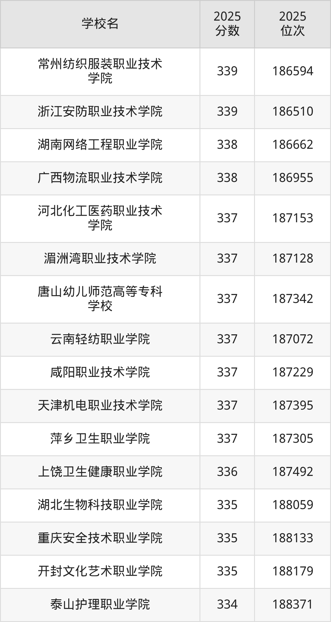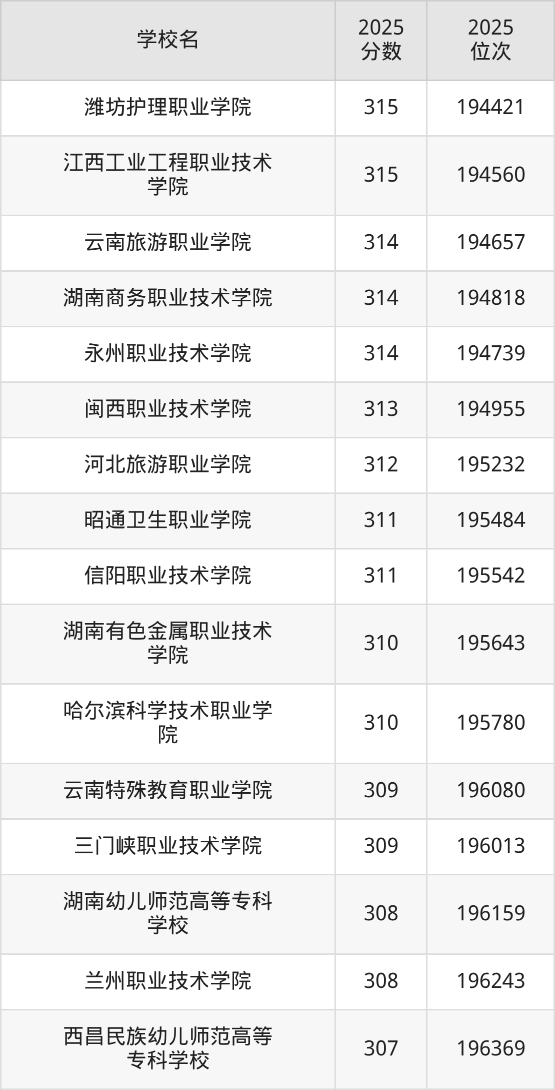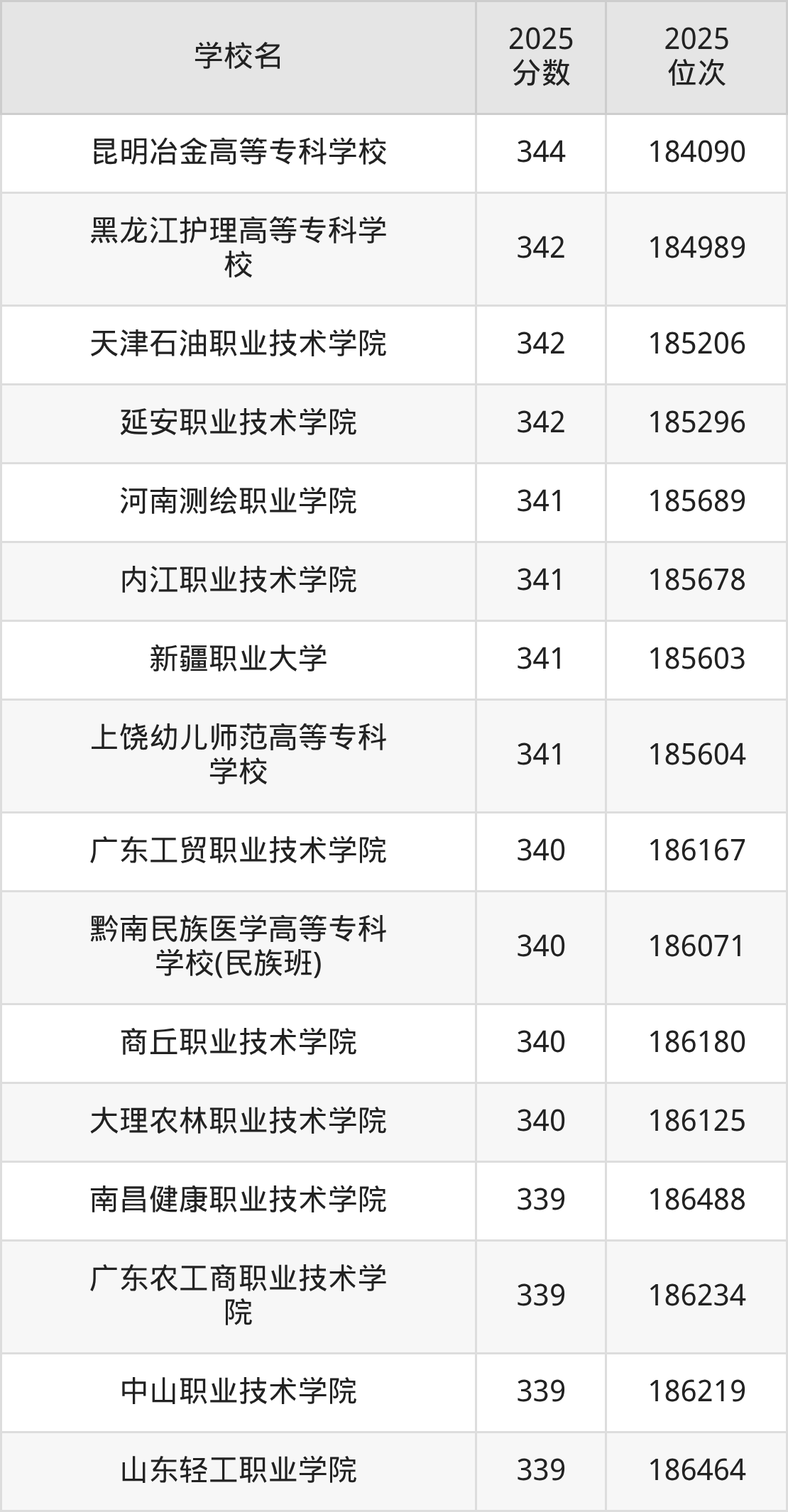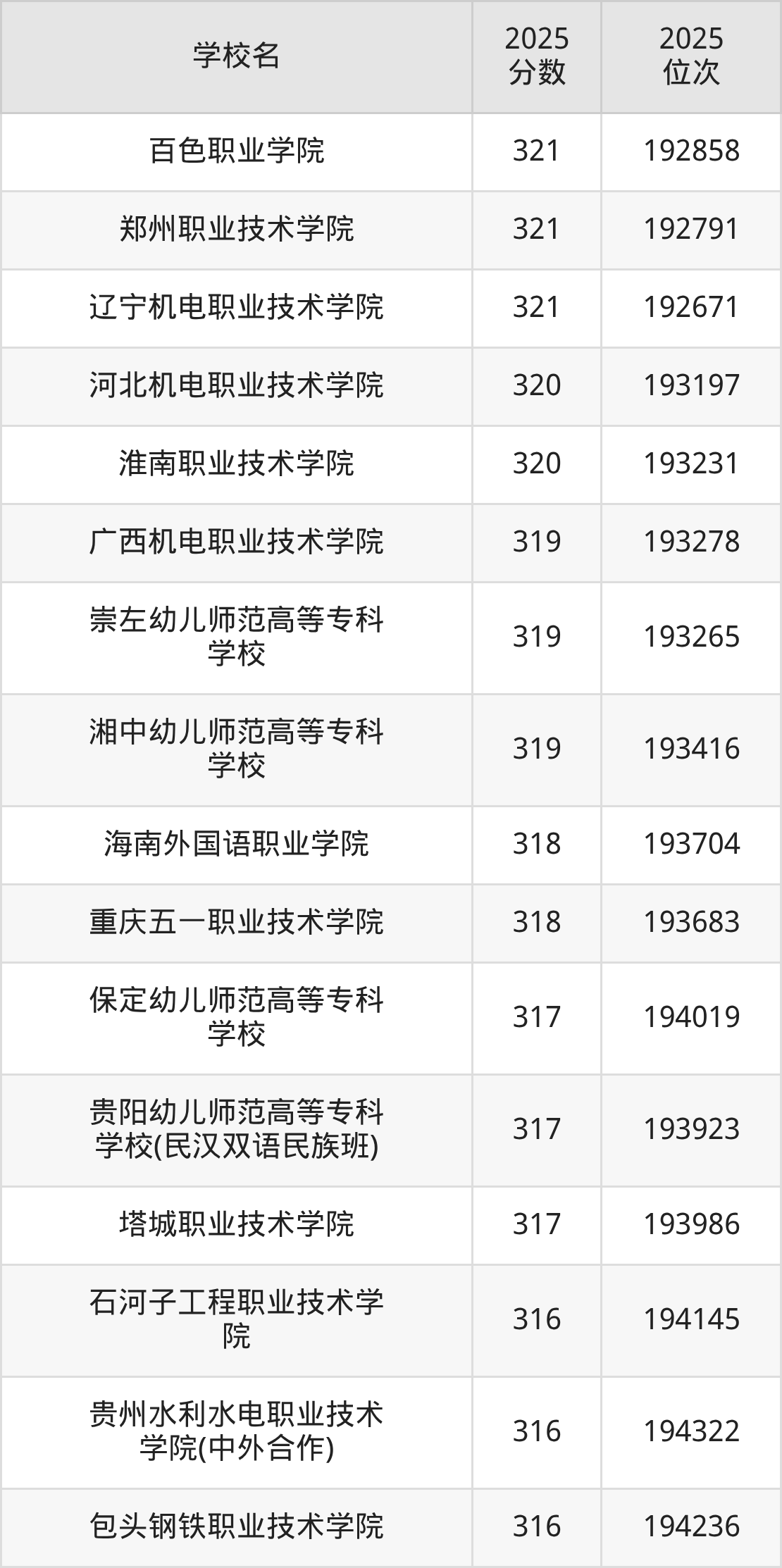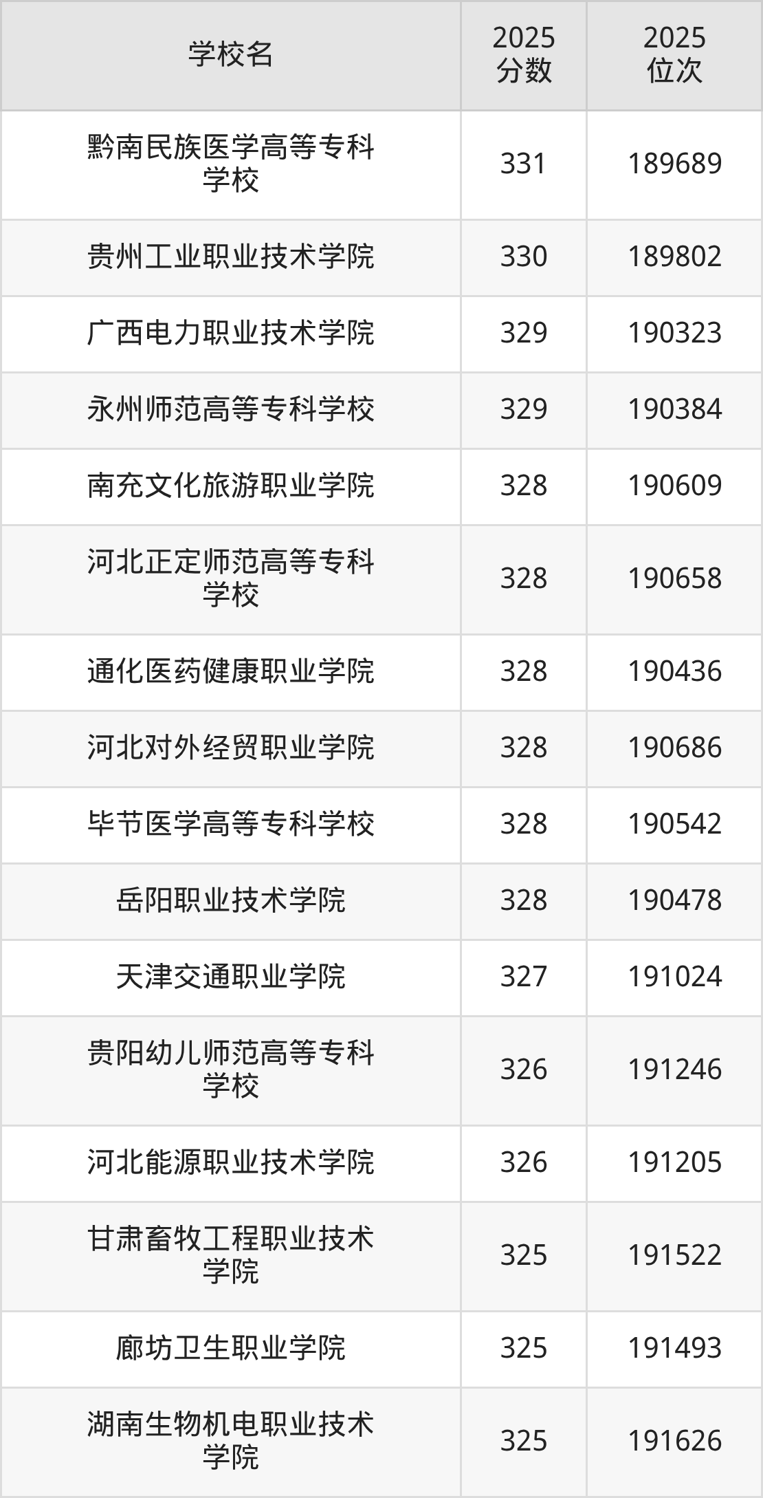 温馨提示:全国各省录取分数线不相同,本文以贵州省为例,为大家带来2025年录取分数线位于300到350分的公办专科学校名单汇总,并附上该分数段对应的位次排名区间,供查阅。