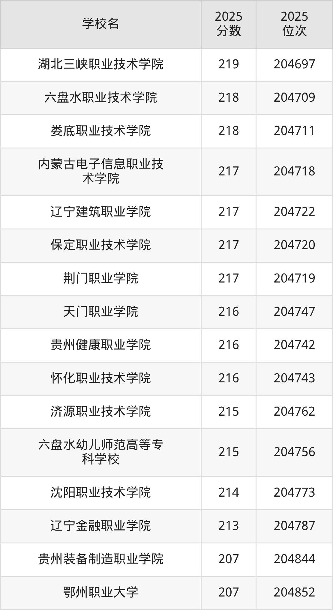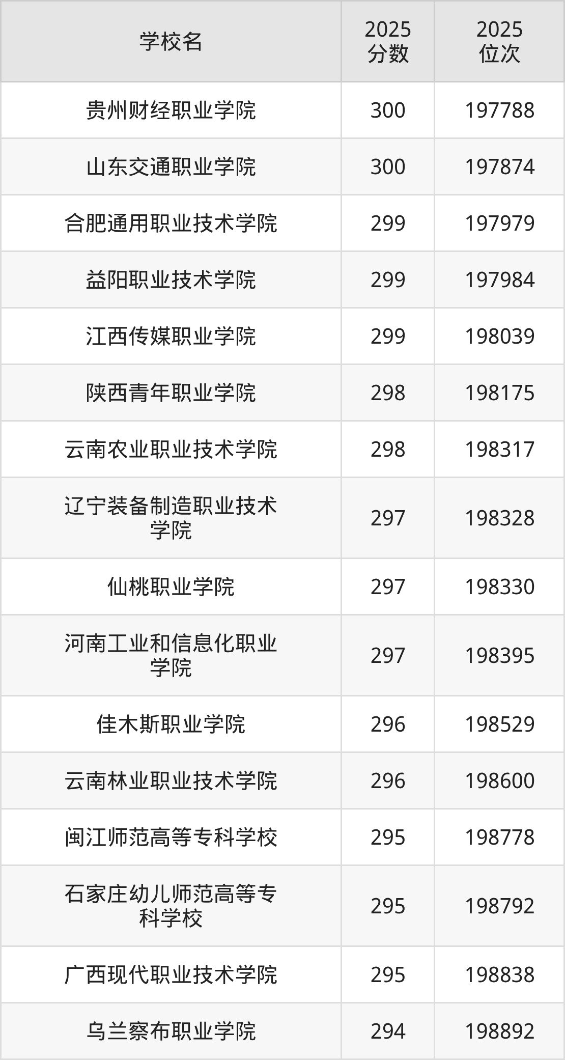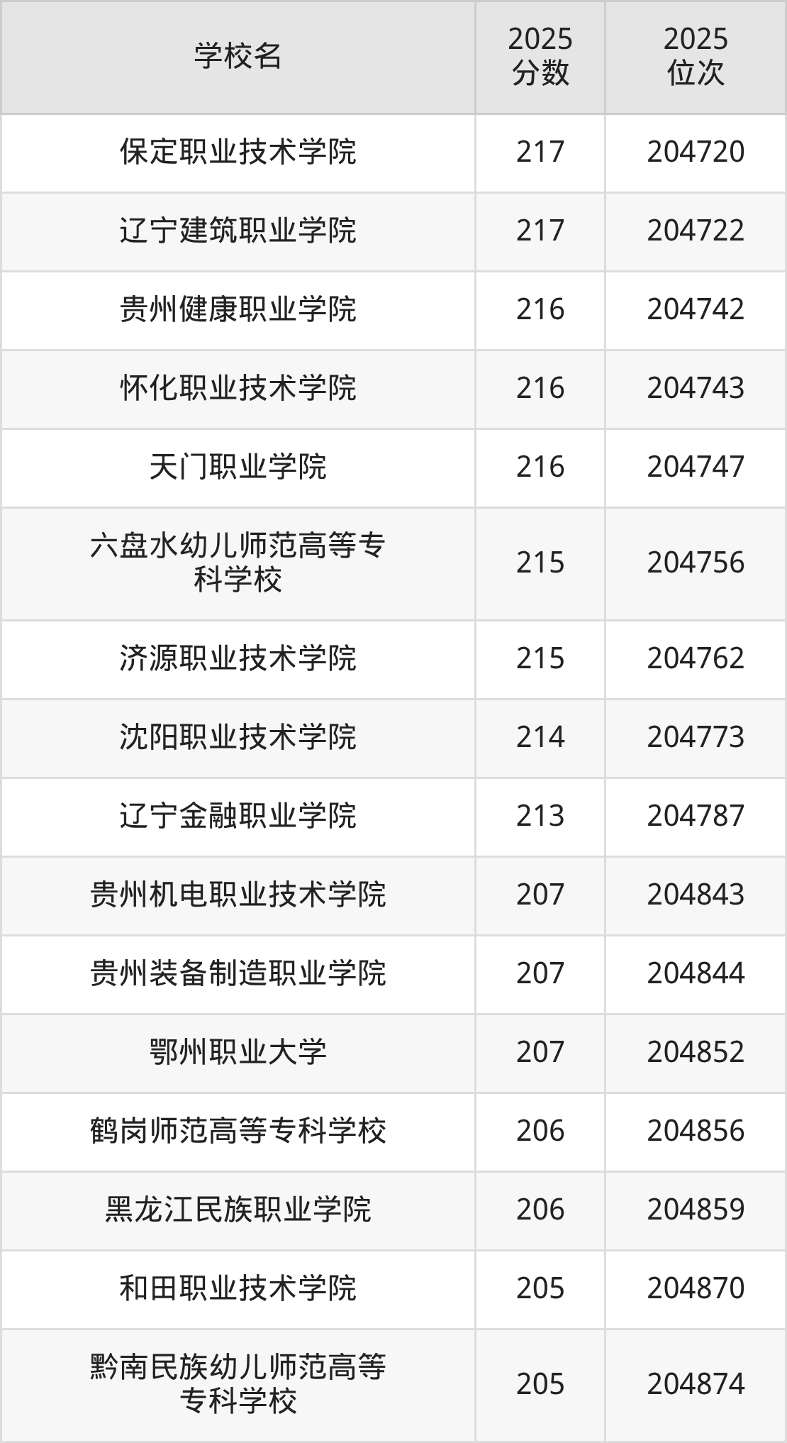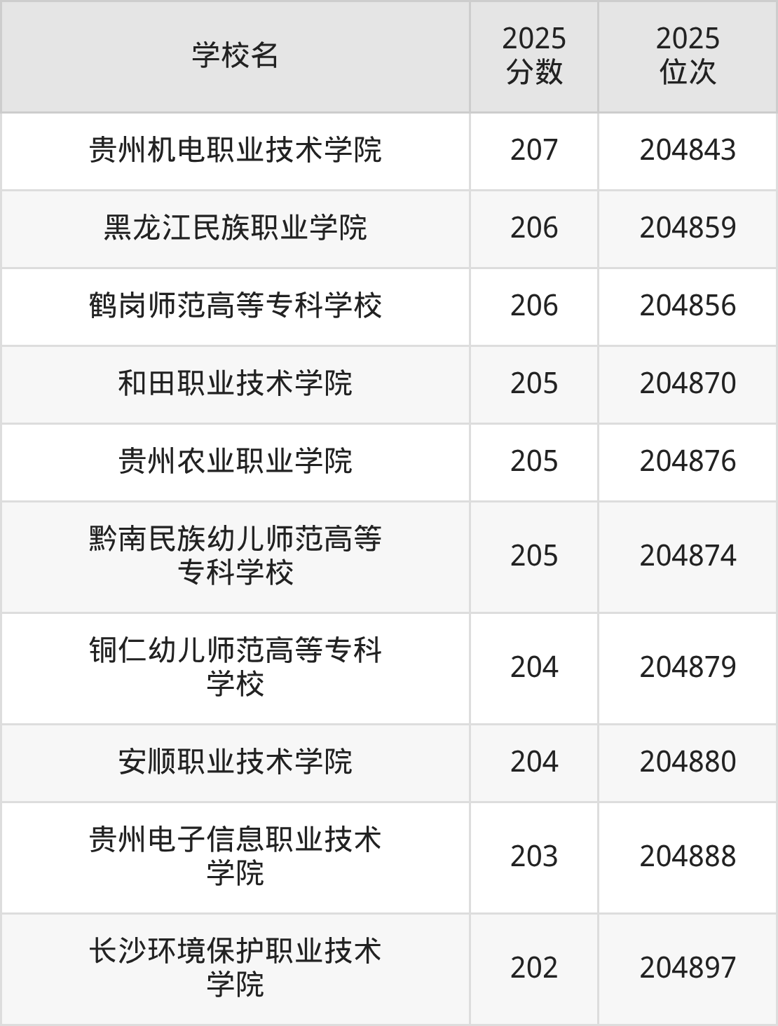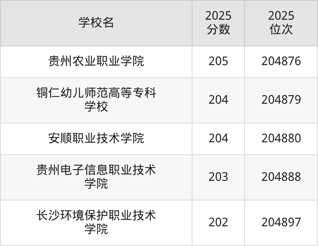 温馨提示:全国各省录取分数线不相同,本文以贵州省为例,为大家带来2025年录取分数线位于200到300分的公办专科学校名单汇总,并附上该分数段对应的位次排名区间,供查阅。