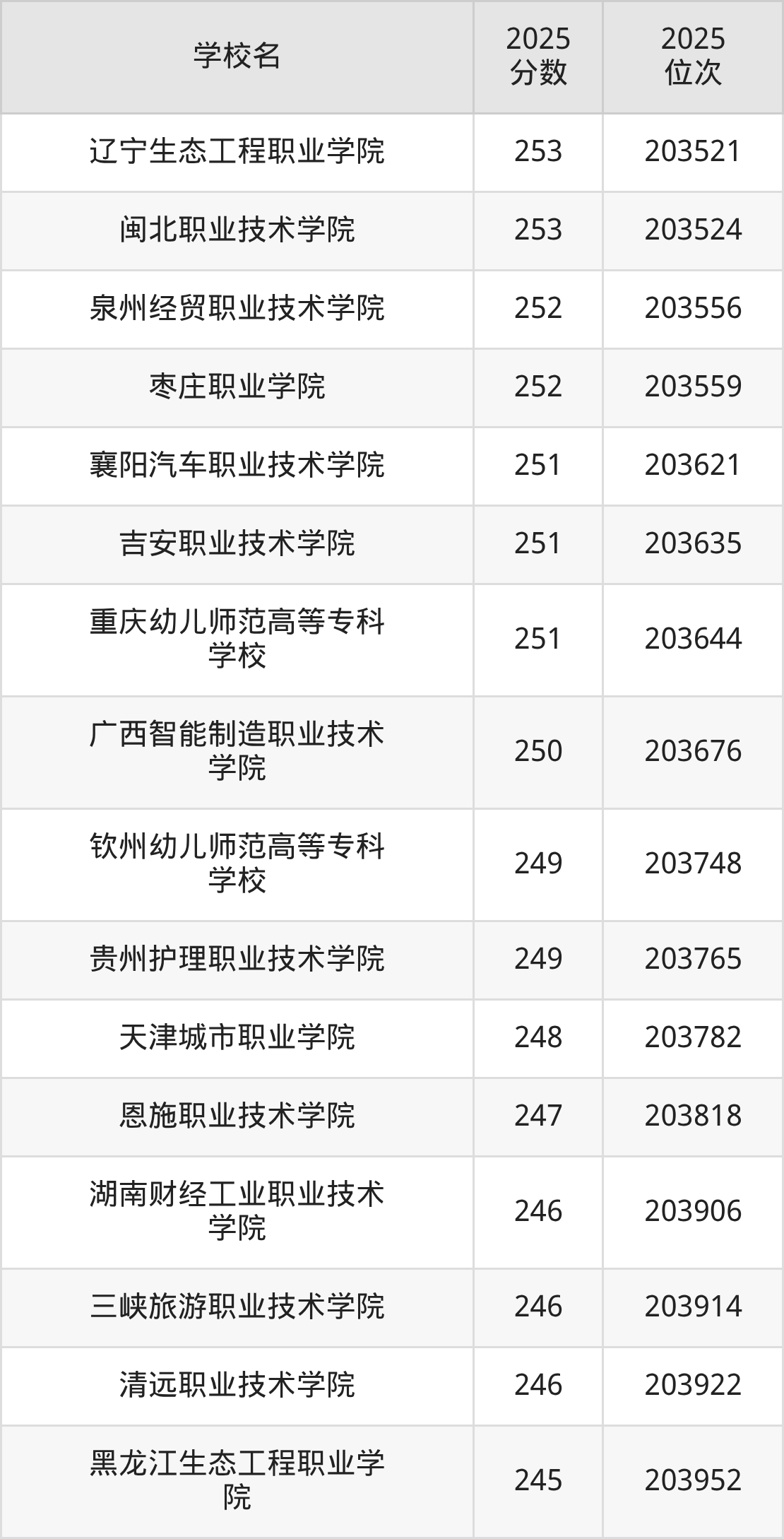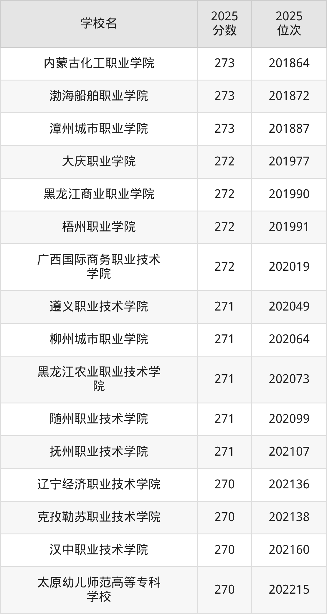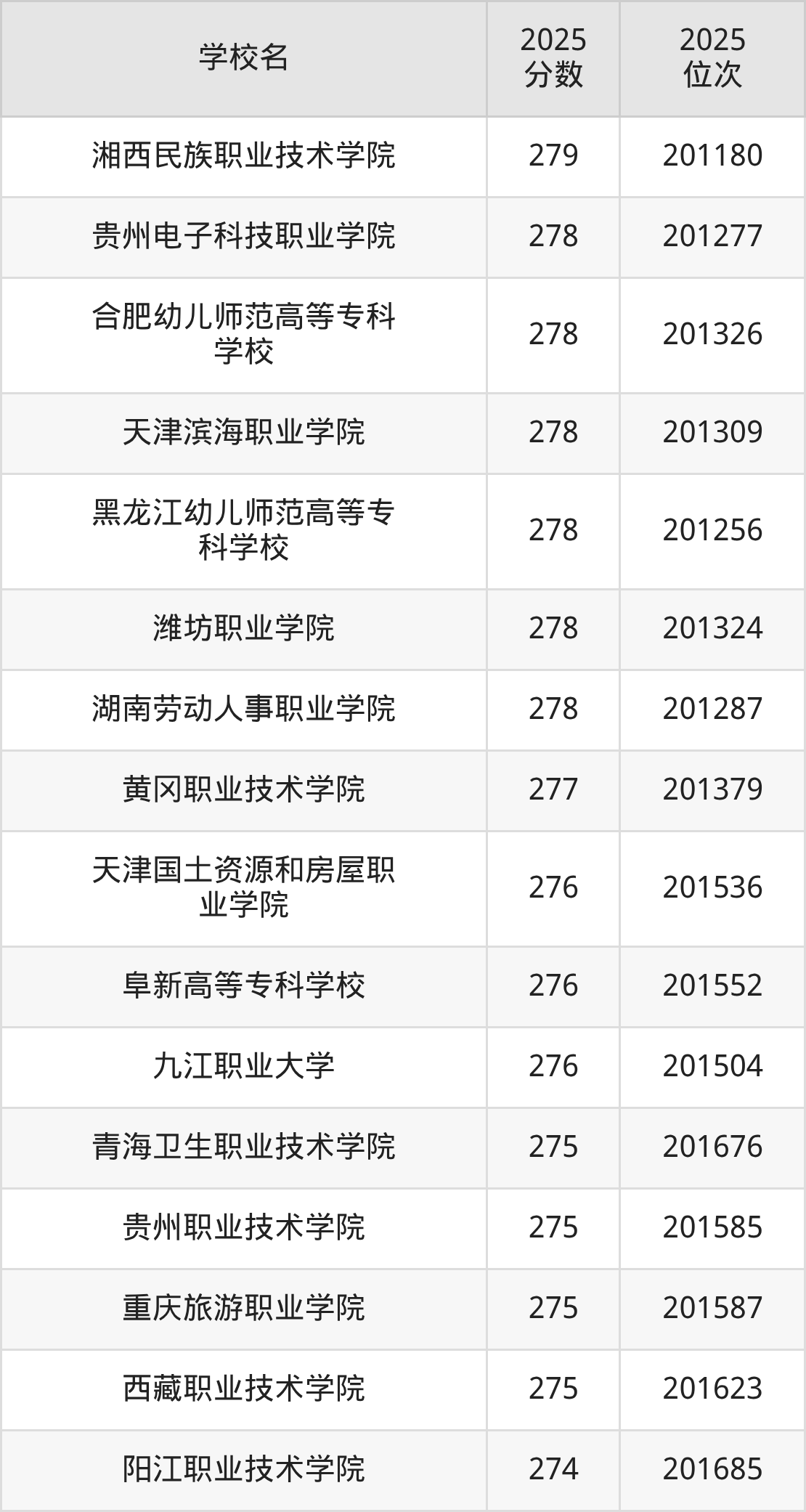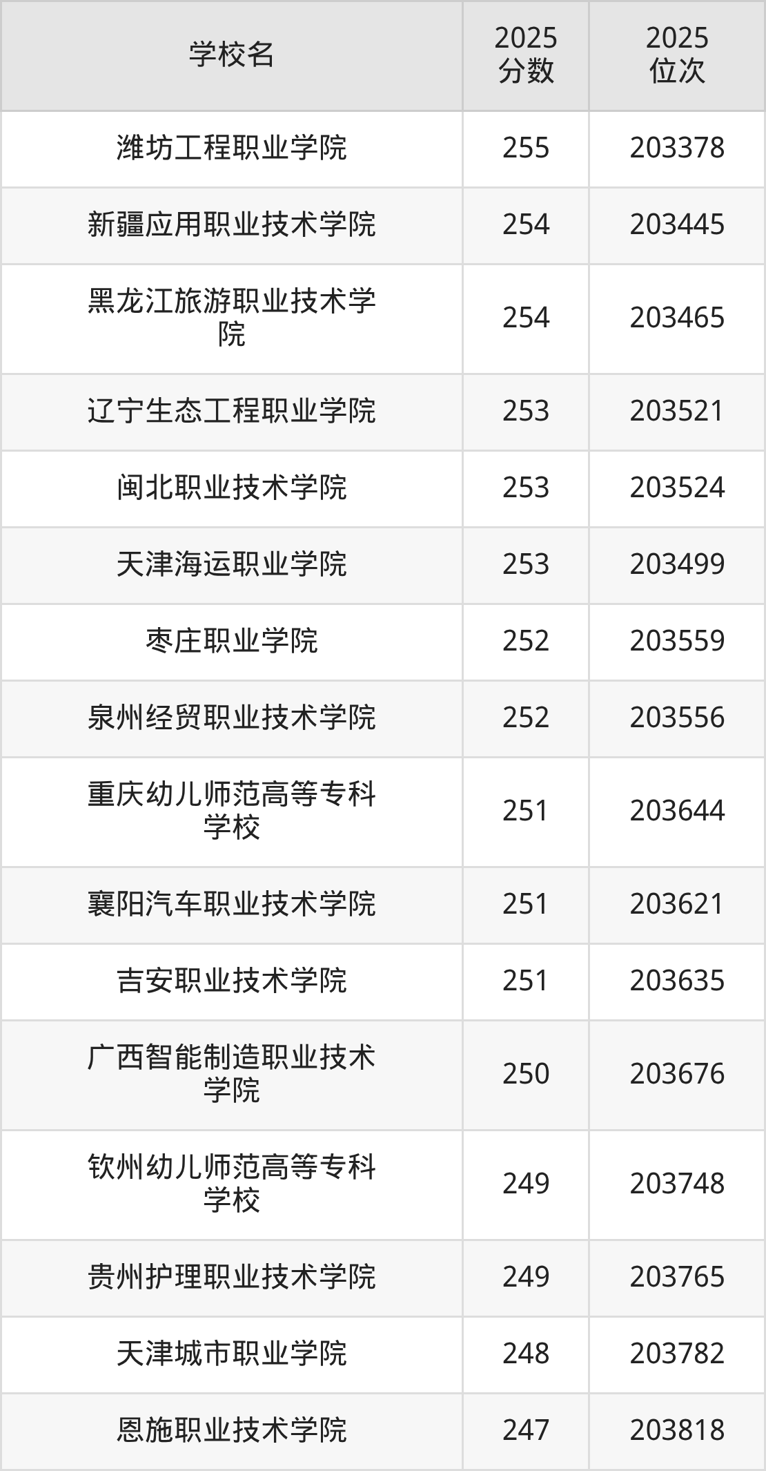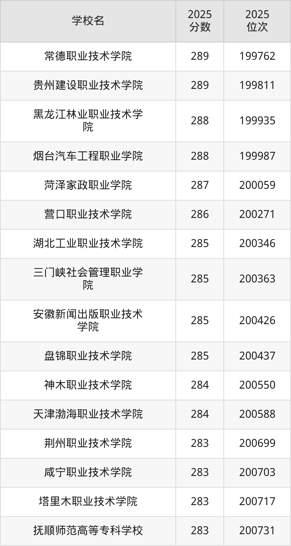 温馨提示:全国各省录取分数线不相同,本文以贵州省为例,为大家带来2025年录取分数线位于200到300分的公办专科学校名单汇总,并附上该分数段对应的位次排名区间,供查阅。