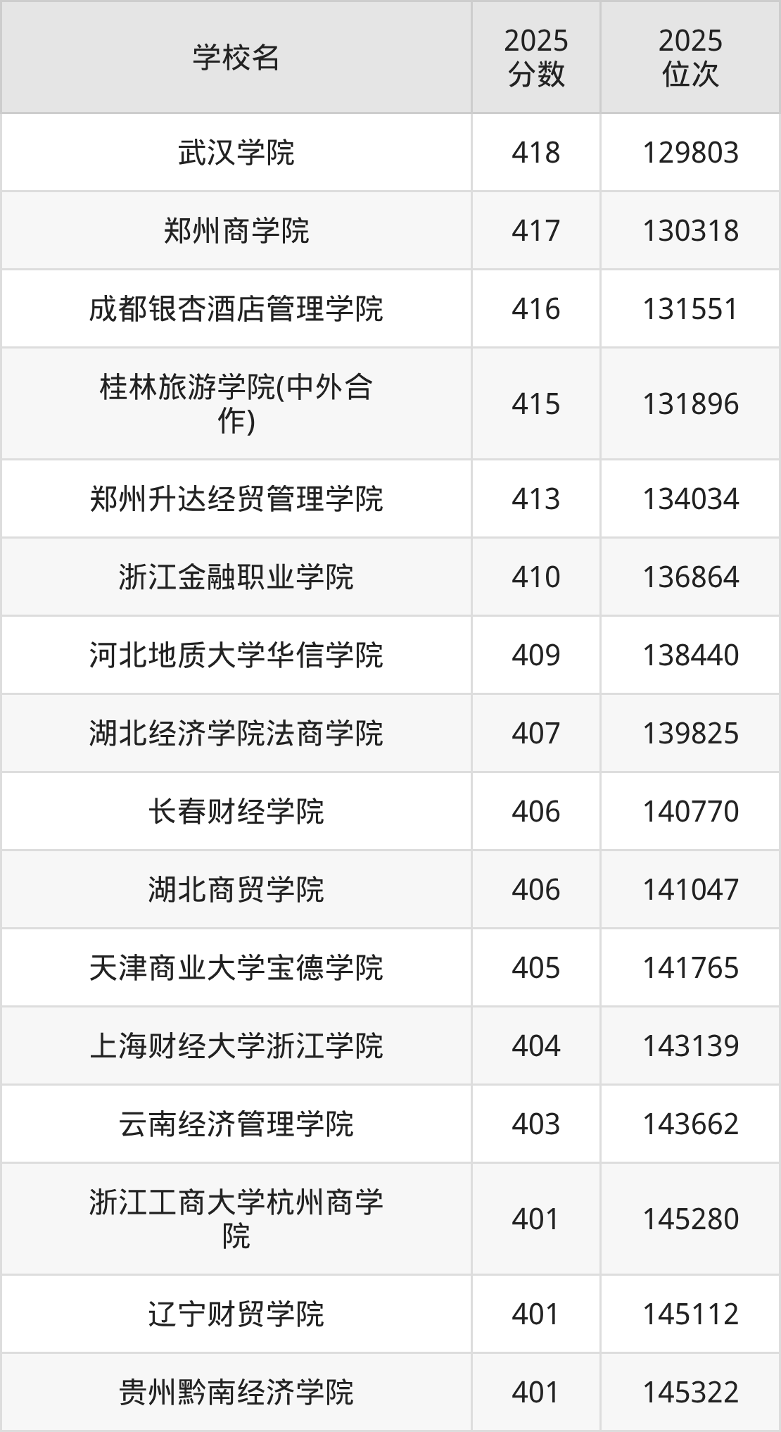 温馨提示:全国各省录取分数线不相同,本文以贵州省为例,为大家带来2025年录取分数线位于400到420分的财经大学名单汇总,并附上该分数段对应的位次排名区间,供查阅。