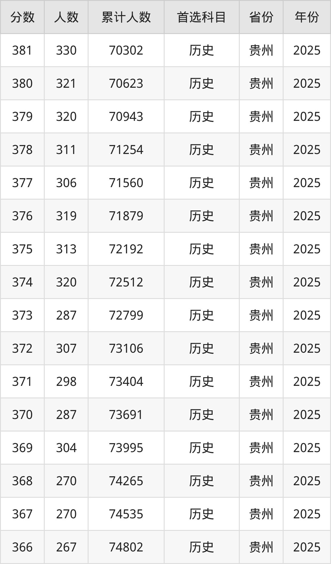 历史类350到380分的位次排名:70303名~78726名