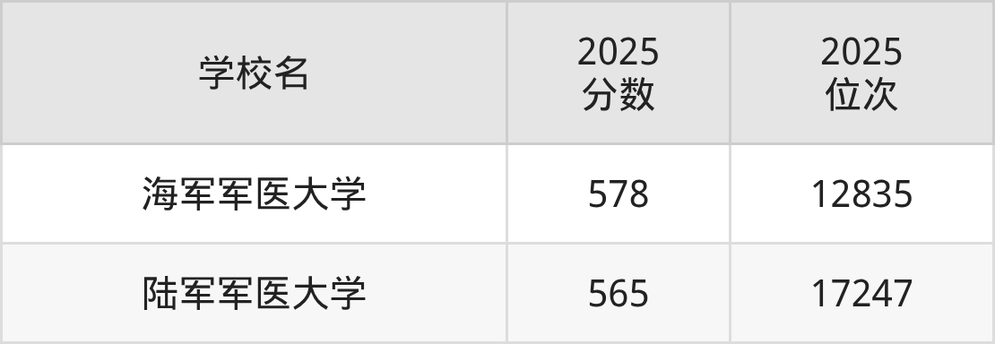 560到580分能上的军校有:海军军医大学(物理类578分)、陆军军医大学(物理类565分)。