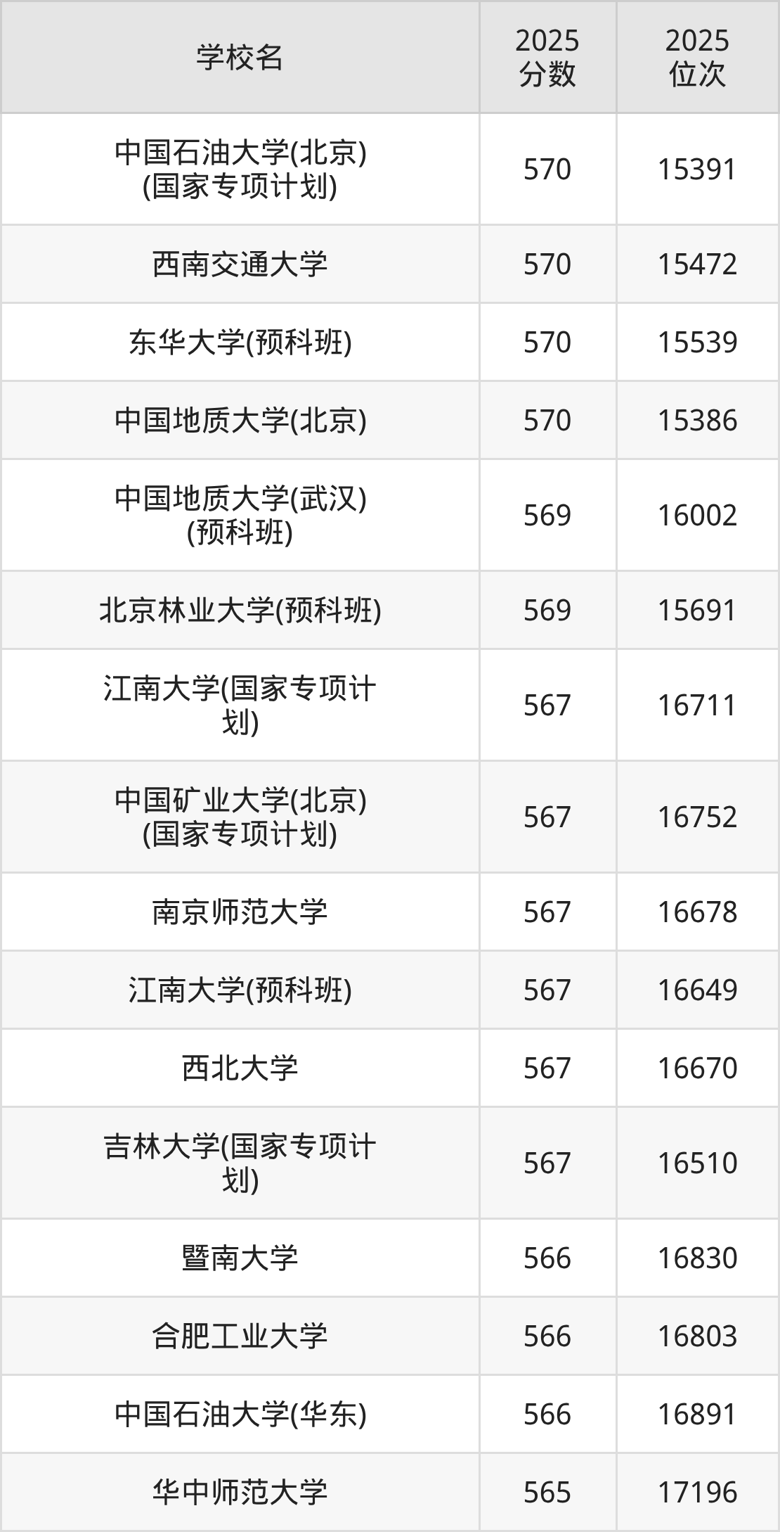 物理类560到570分的大学中分数对应位次最高的是中国石油大学(北京)(国家专项计划),2025年最低分570分,对应最低位次是15391名;分数对应位次最低的是中国矿业大学(北京),2025年最低分560分,对应最低位次是19214名。