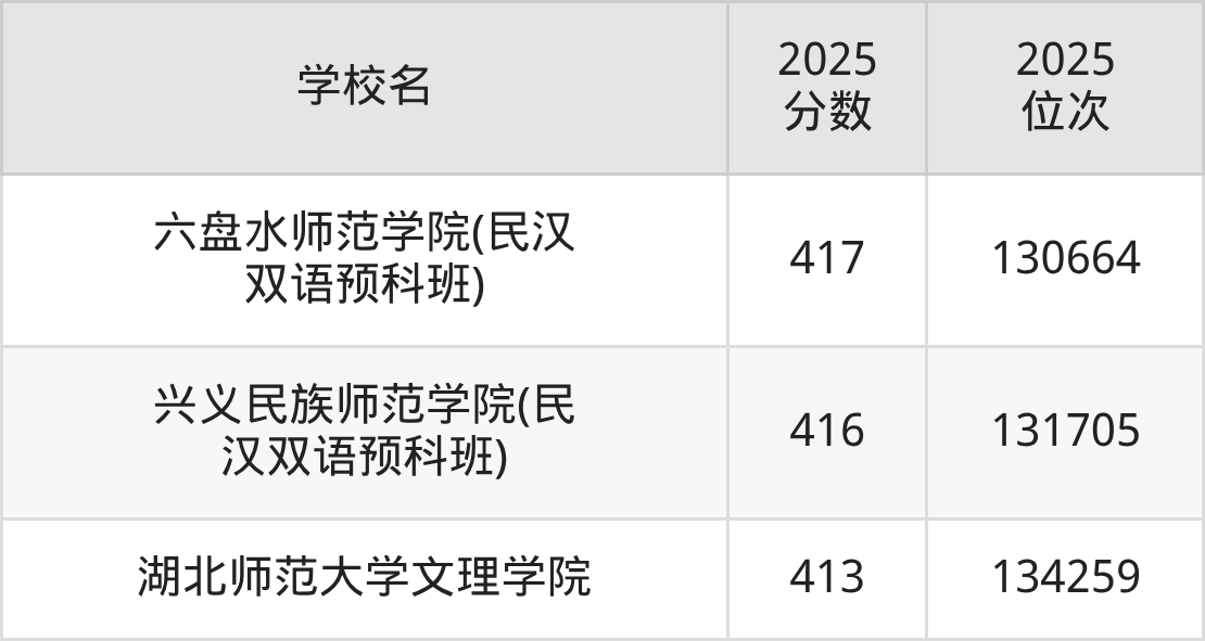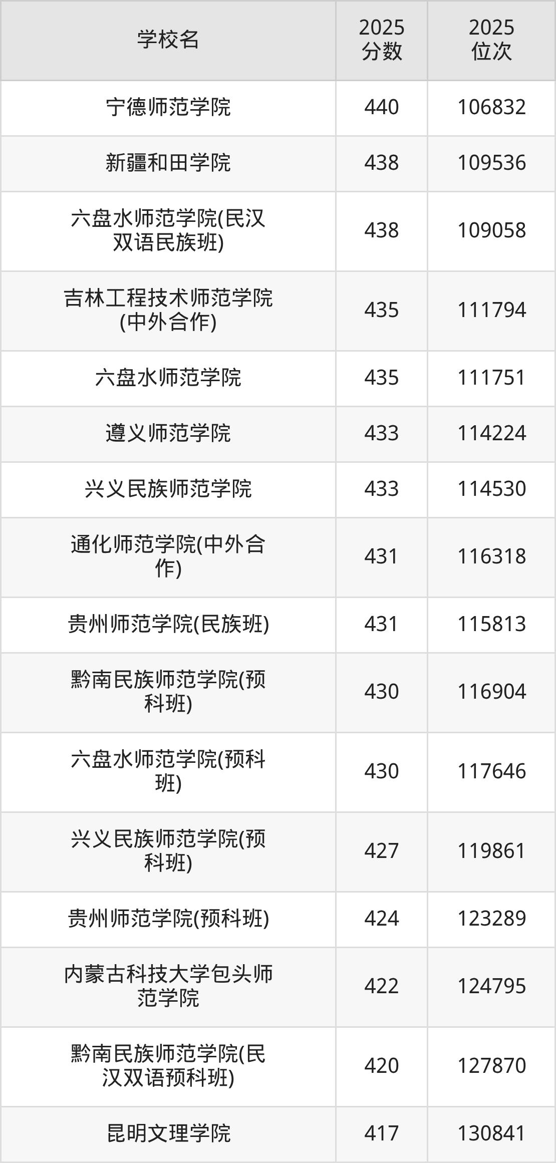 温馨提示:全国各省录取分数线不相同,本文以贵州省为例,为大家带来2025年录取分数线位于410到450分的二本师范大学名单汇总,并附上该分数段对应的位次排名区间,供查阅。