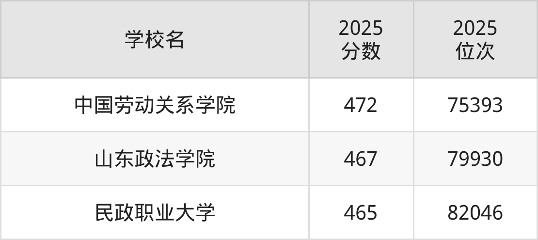 温馨提示:全国各省录取分数线不相同,本文以贵州省为例,为大家带来2025年录取分数线位于450到480分的政法大学名单汇总,并附上该分数段对应的位次排名区间,供查阅。