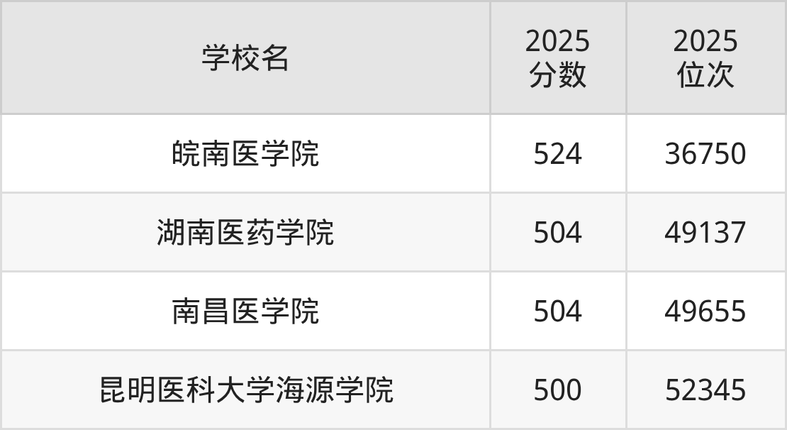 对于首选物理的同学来说,500到540分能上的二本医学院中比较好的有皖南医学院(524分)、南昌医学院(504分)、湖南医药学院(504分),这些大学均位居全国600强以内。