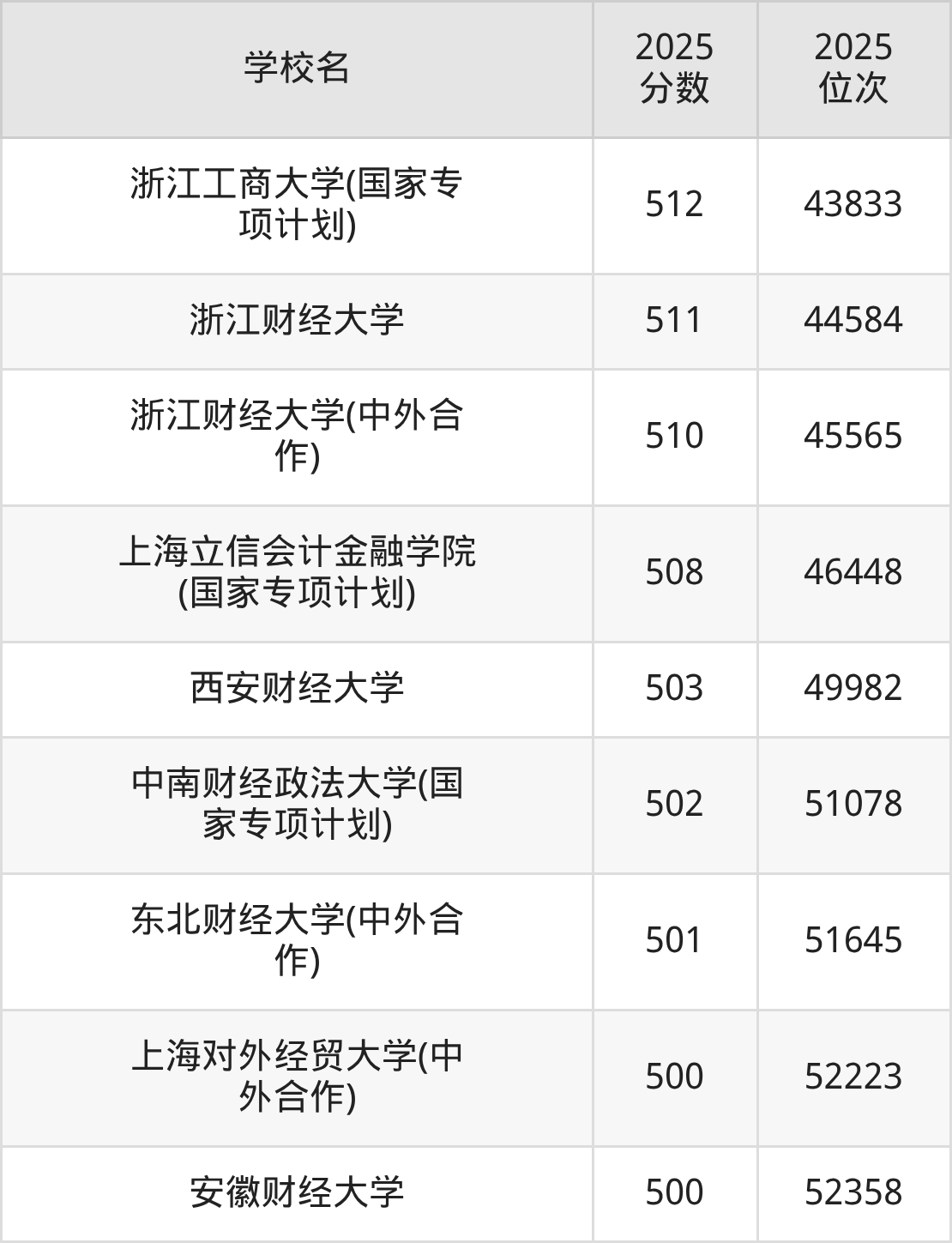 温馨提示:全国各省录取分数线不相同,本文以贵州省为例,为大家带来2025年录取分数线位于500到550分的财经大学名单汇总,并附上该分数段对应的位次排名区间,供查阅。