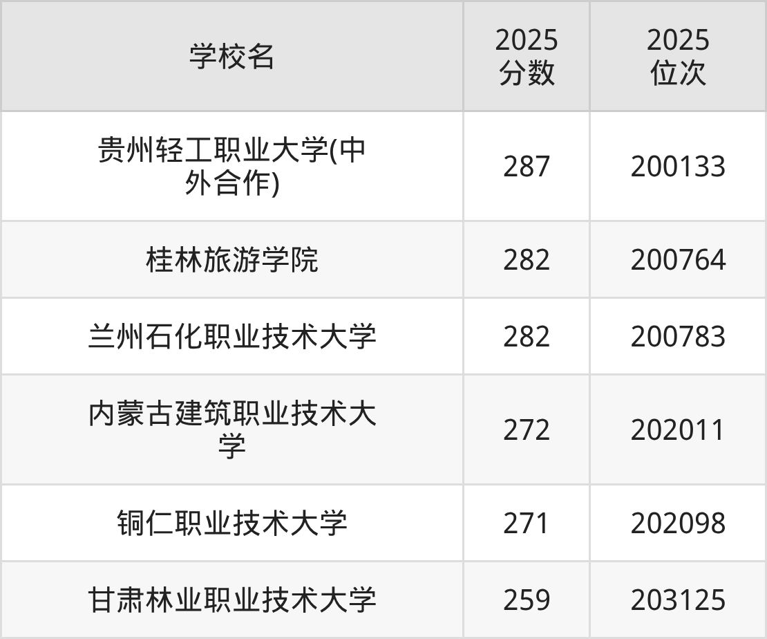 物理类250到300分的大学中分数对应位次最高的是贵州轻工职业大学(中外合作),2025年最低分287分,对应最低位次是200133名;分数对应位次最低的是甘肃林业职业技术大学,2025年最低分259分,对应最低位次是203125名。