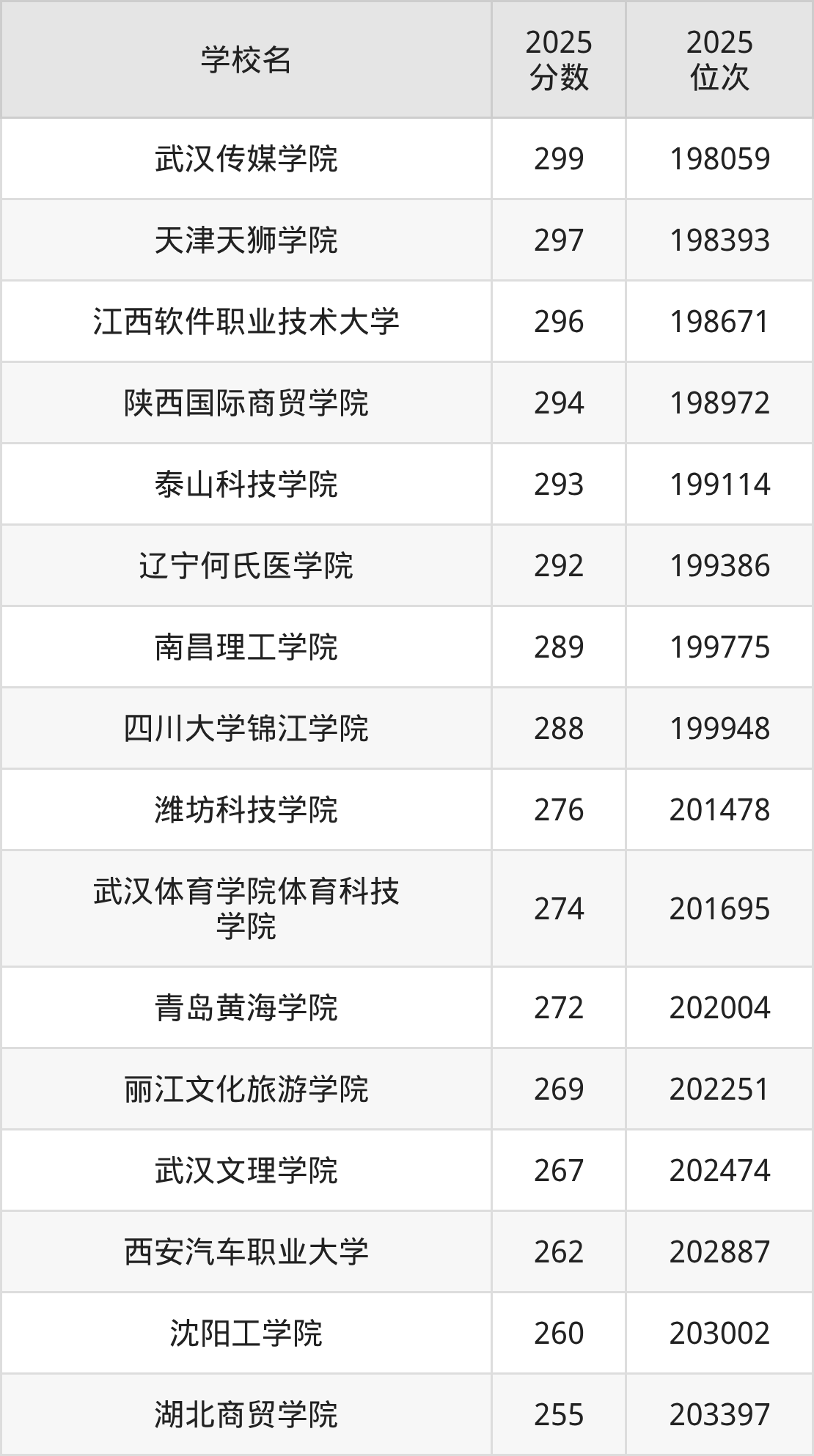物理类250到300分的大学中分数对应位次最高的是武汉传媒学院,2025年最低分299分,对应最低位次是198059名;分数对应位次最低的是云南经济管理学院,2025年最低分250分,对应最低位次是203655名。