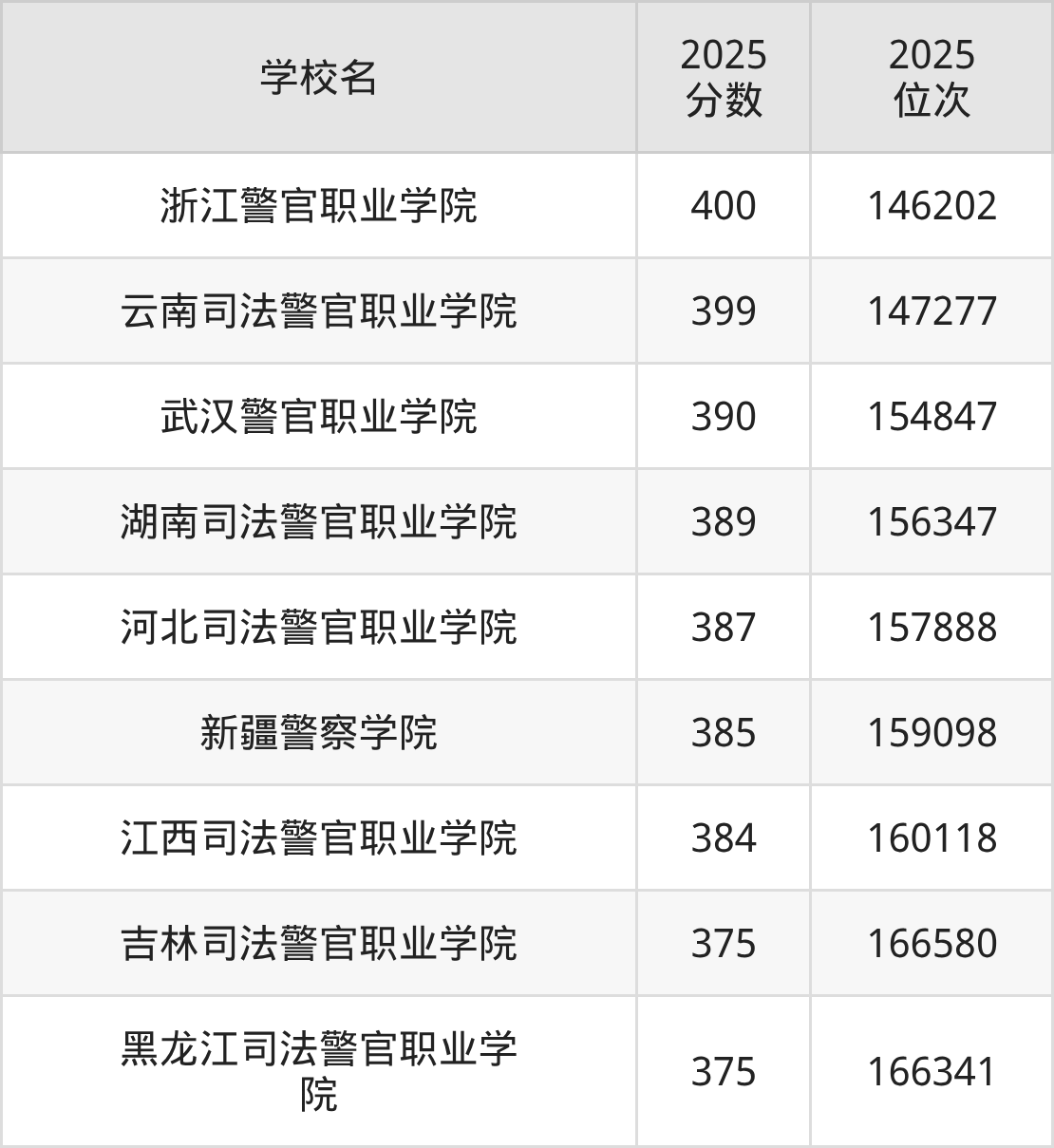 物理类300到400分的大学中分数对应位次最高的是浙江警官职业学院,2025年最低分400分,对应最低位次是146202名;分数对应位次最低的是吉林司法警官职业学院,2025年最低分375分,对应最低位次是166580名。