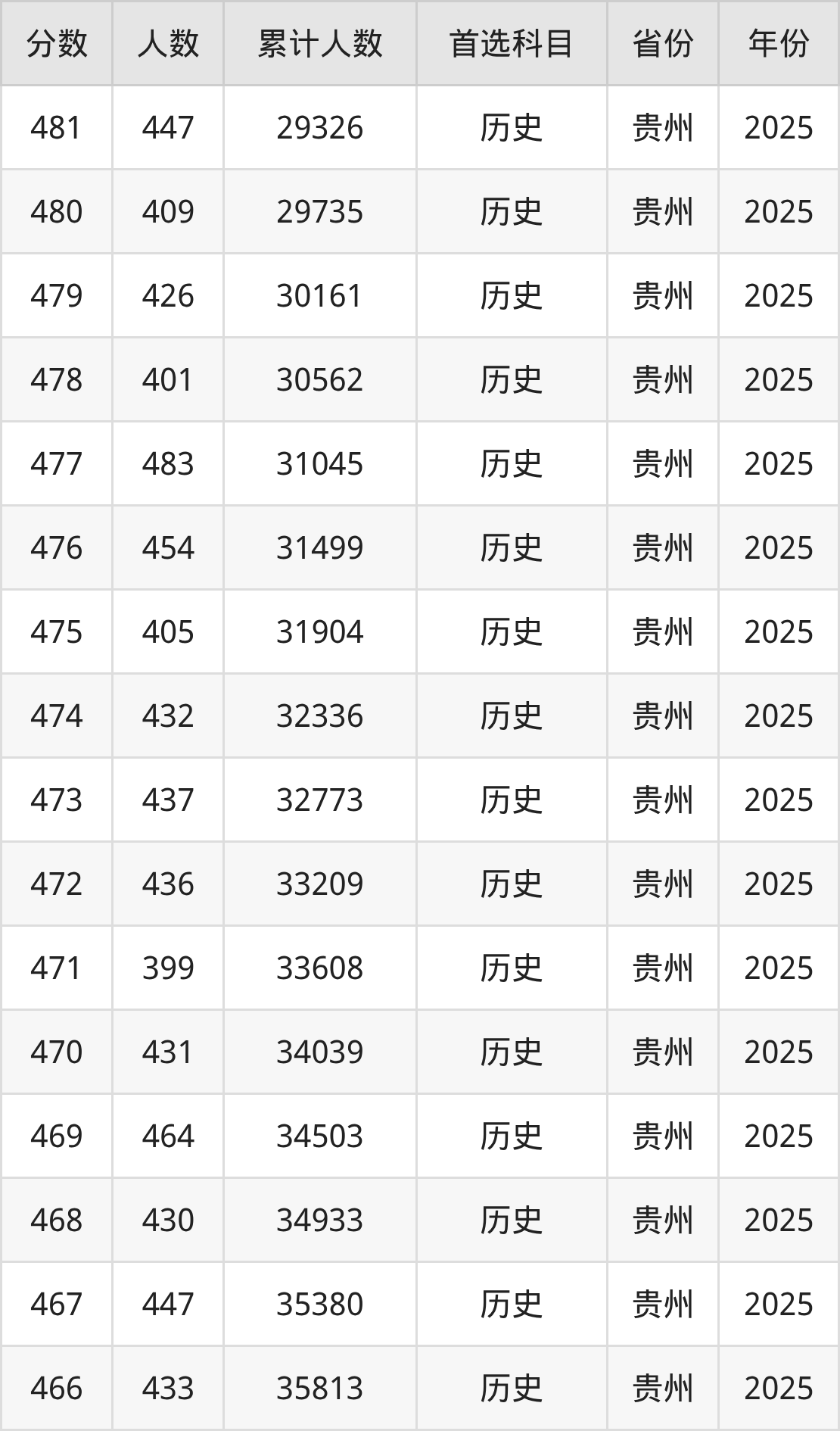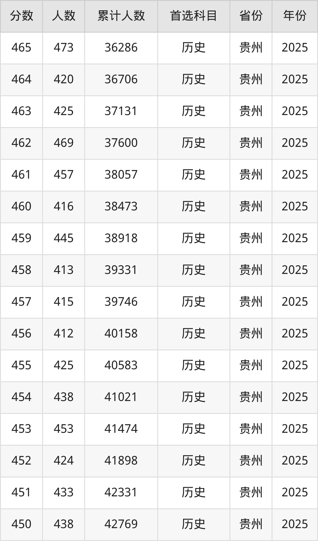 历史类450到480分的位次排名:29327名~42769名