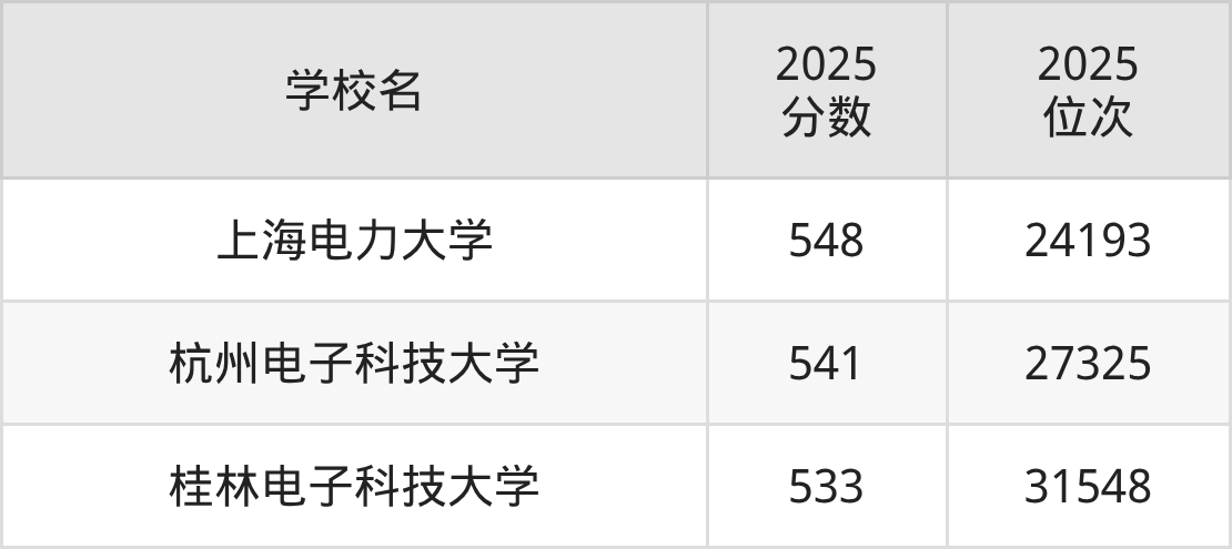 对于首选物理的同学来说,500到550分能上的电力大学中比较好的有杭州电子科技大学(541分)、上海电力大学(548分)、桂林电子科技大学(533分),这些大学均位居全国300强以内。