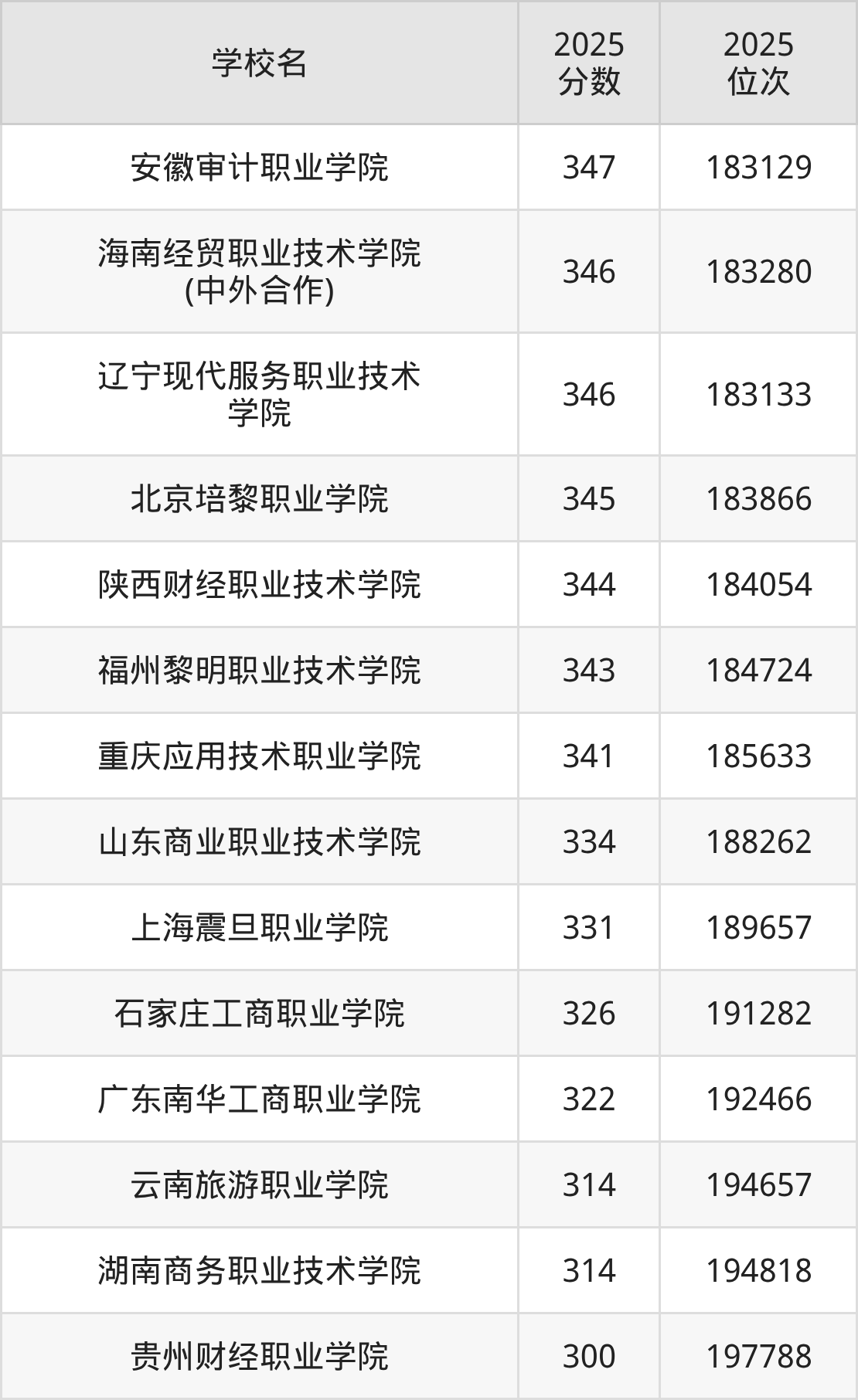 物理类300到350分的大学中分数对应位次最高的是安徽审计职业学院,2025年最低分347分,对应最低位次是183129名;分数对应位次最低的是贵州财经职业学院,2025年最低分300分,对应最低位次是197788名。