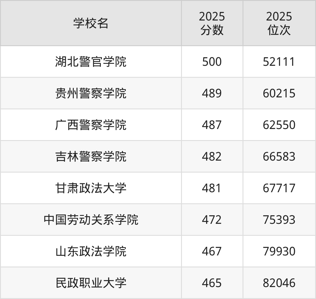 温馨提示:全国各省录取分数线不相同,本文以贵州省为例,为大家带来2025年录取分数线位于450到500分的政法大学名单汇总,并附上该分数段对应的位次排名区间,供查阅。